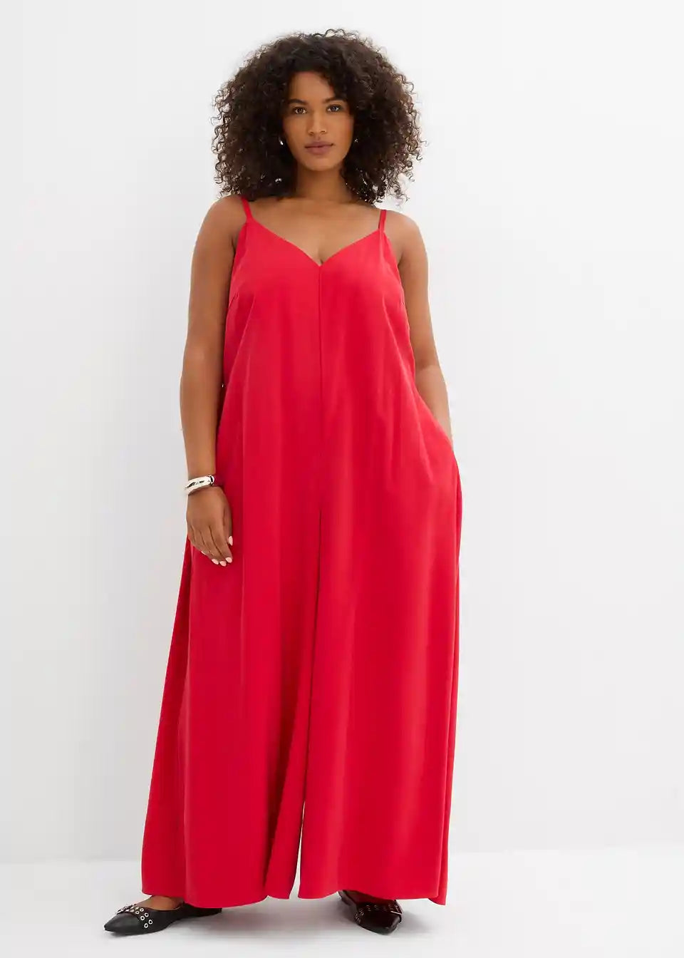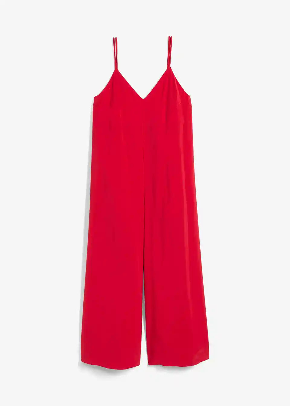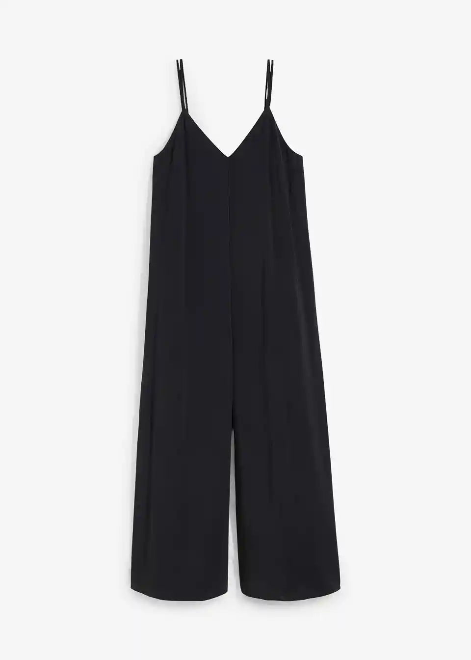 Jumpsuit v ohlapnem kroju z V-izrezom in širokimi hlačami ter skritim zadrgo. Nastavljive dvojne naramnice z gumbi za popolno prileganje na ramenih.