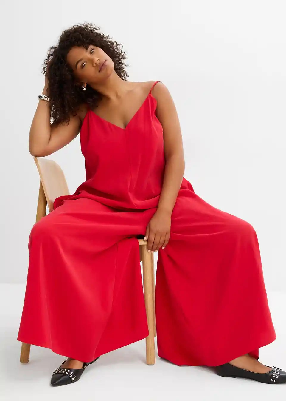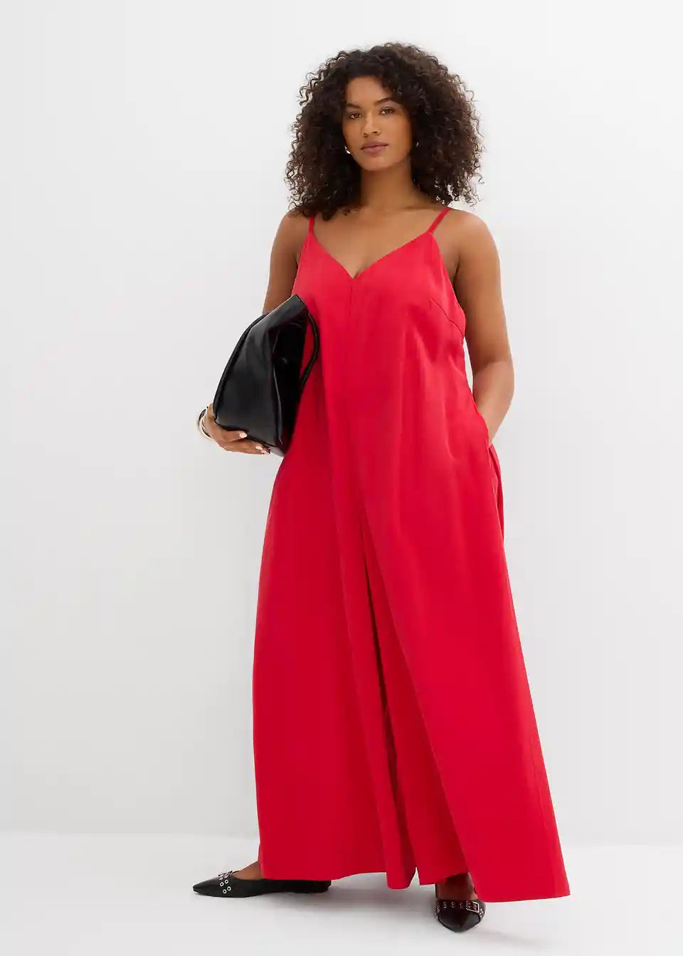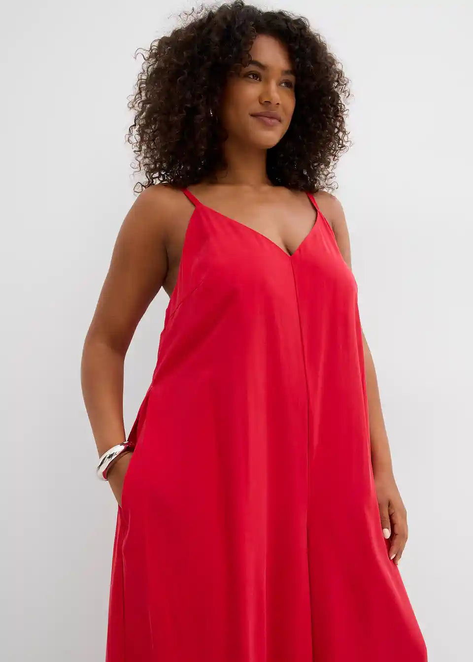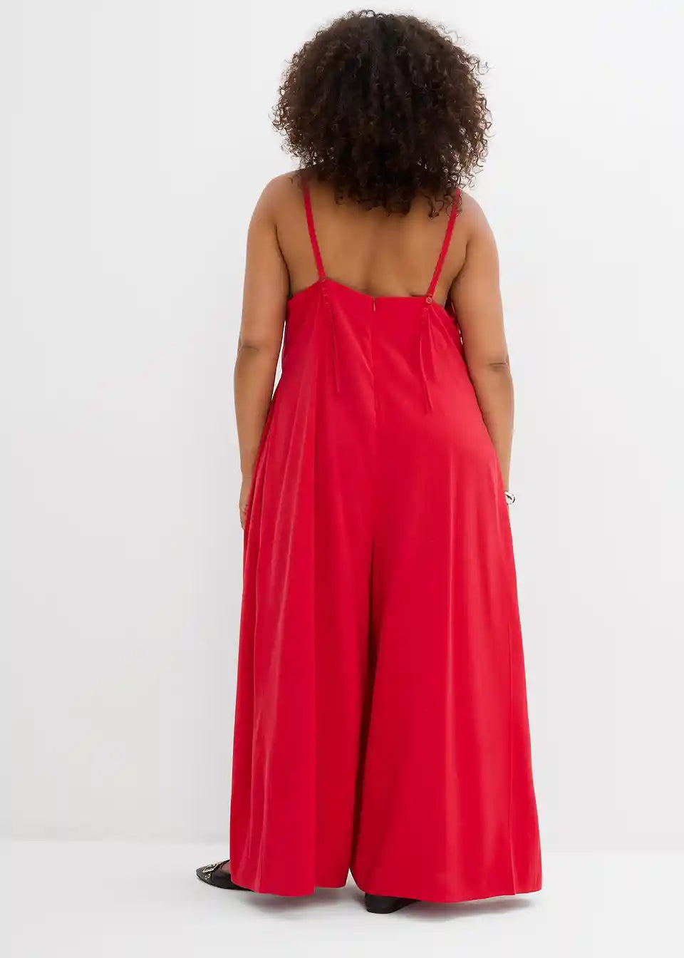 Jumpsuit v ohlapnem kroju z V-izrezom in širokimi hlačami ter skritim zadrgo. Nastavljive dvojne naramnice z gumbi za popolno prileganje na ramenih.
