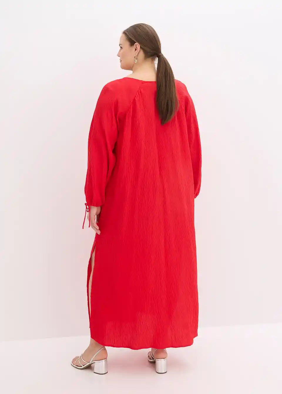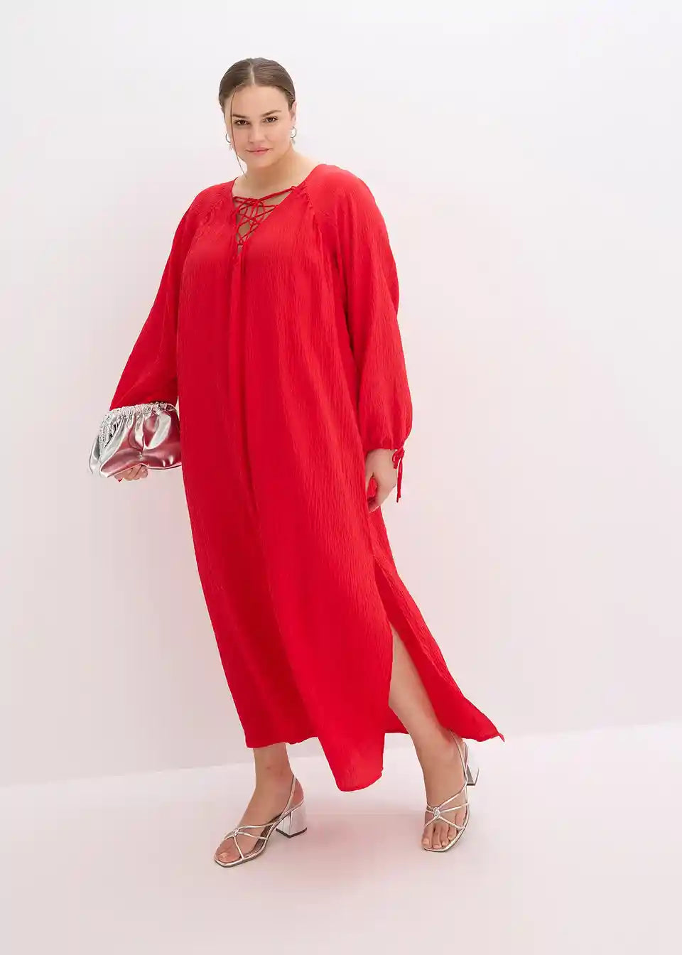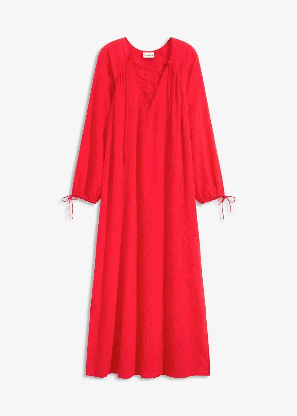 moderna kaftan obleka iz rahlo strukturirane mešanice viskoze z dekorativnimi detajli zavezovanja na izrezu spredaj in na manšeti rokavov