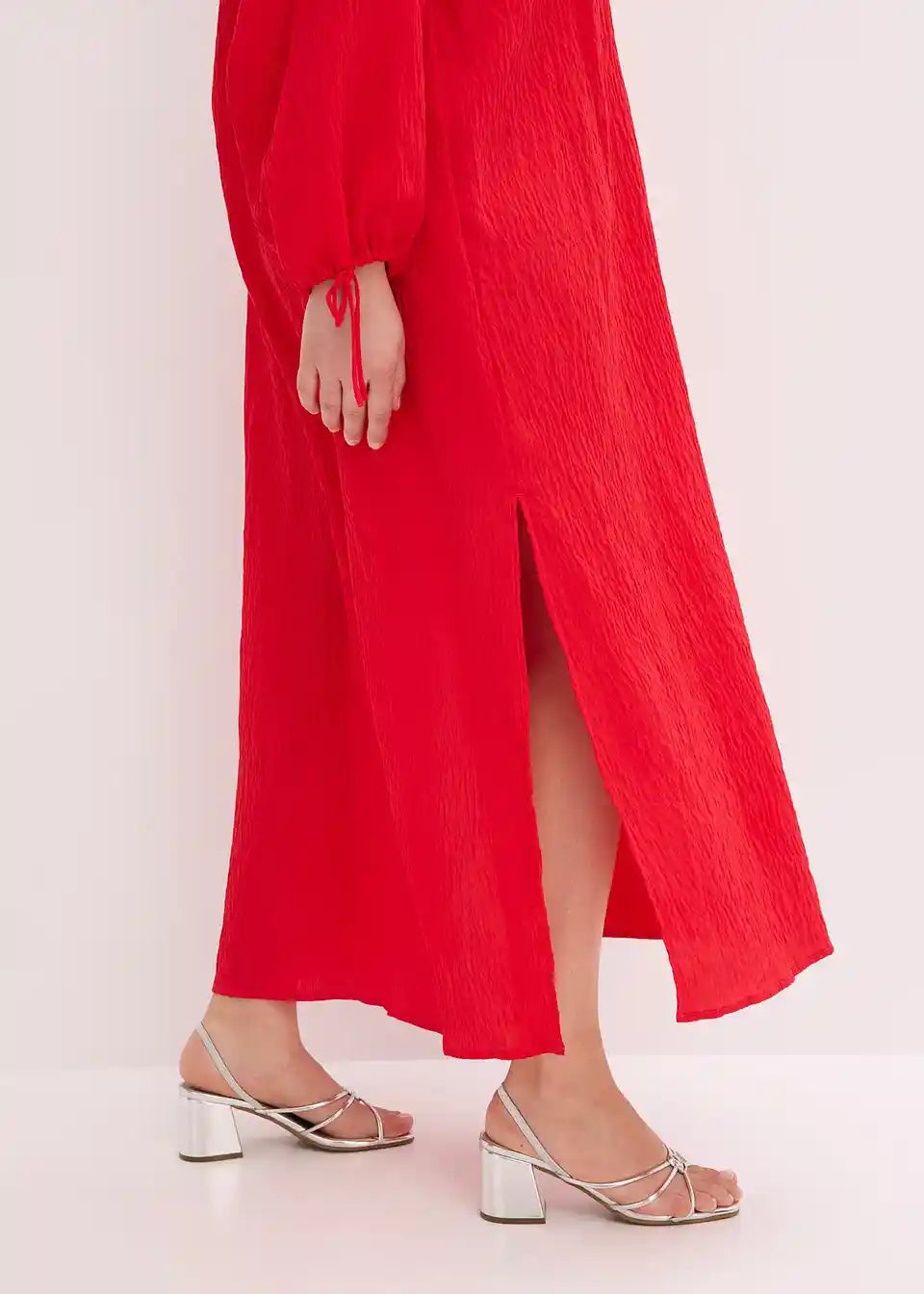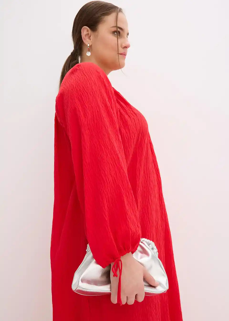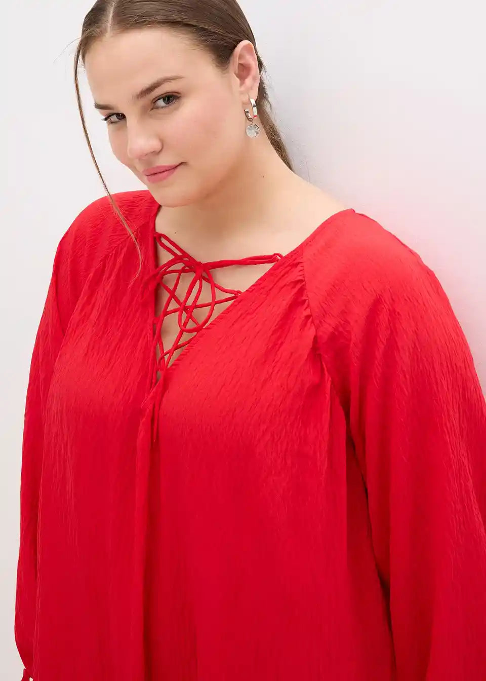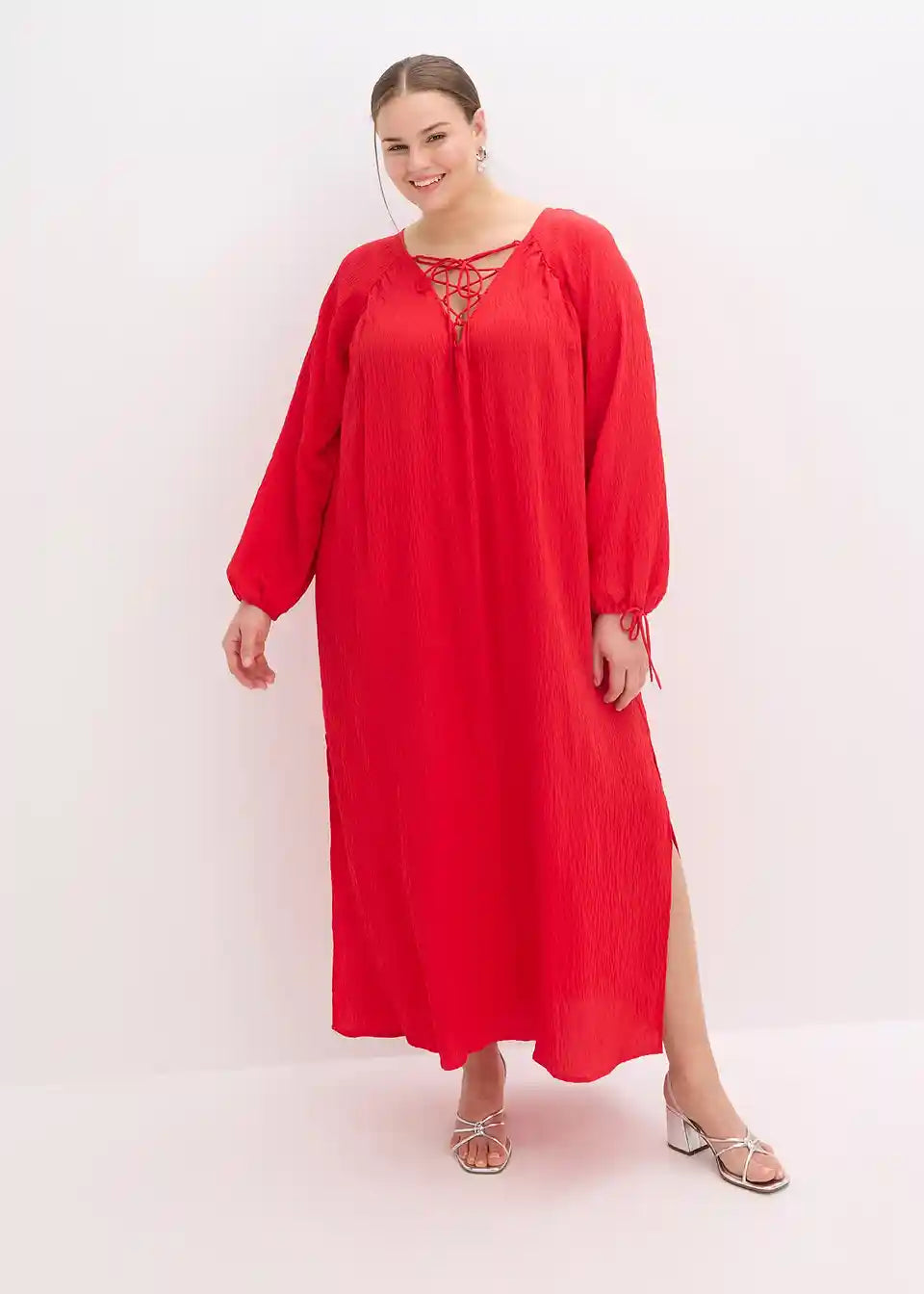 moderna kaftan obleka iz rahlo strukturirane mešanice viskoze z dekorativnimi detajli zavezovanja na izrezu spredaj in na manšeti rokavov