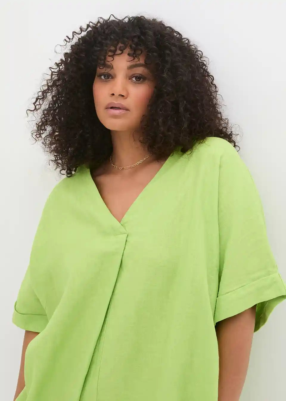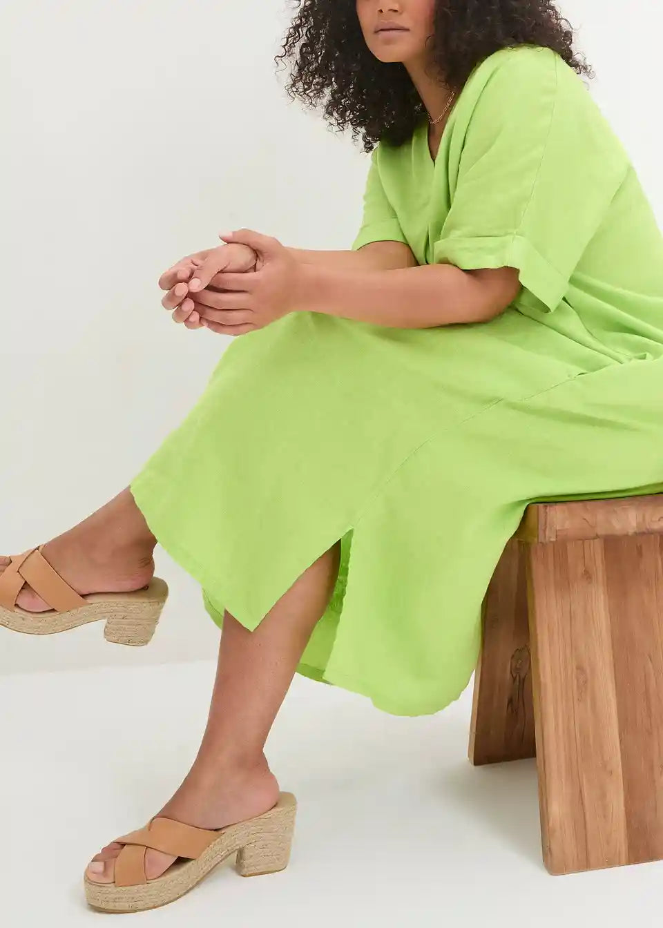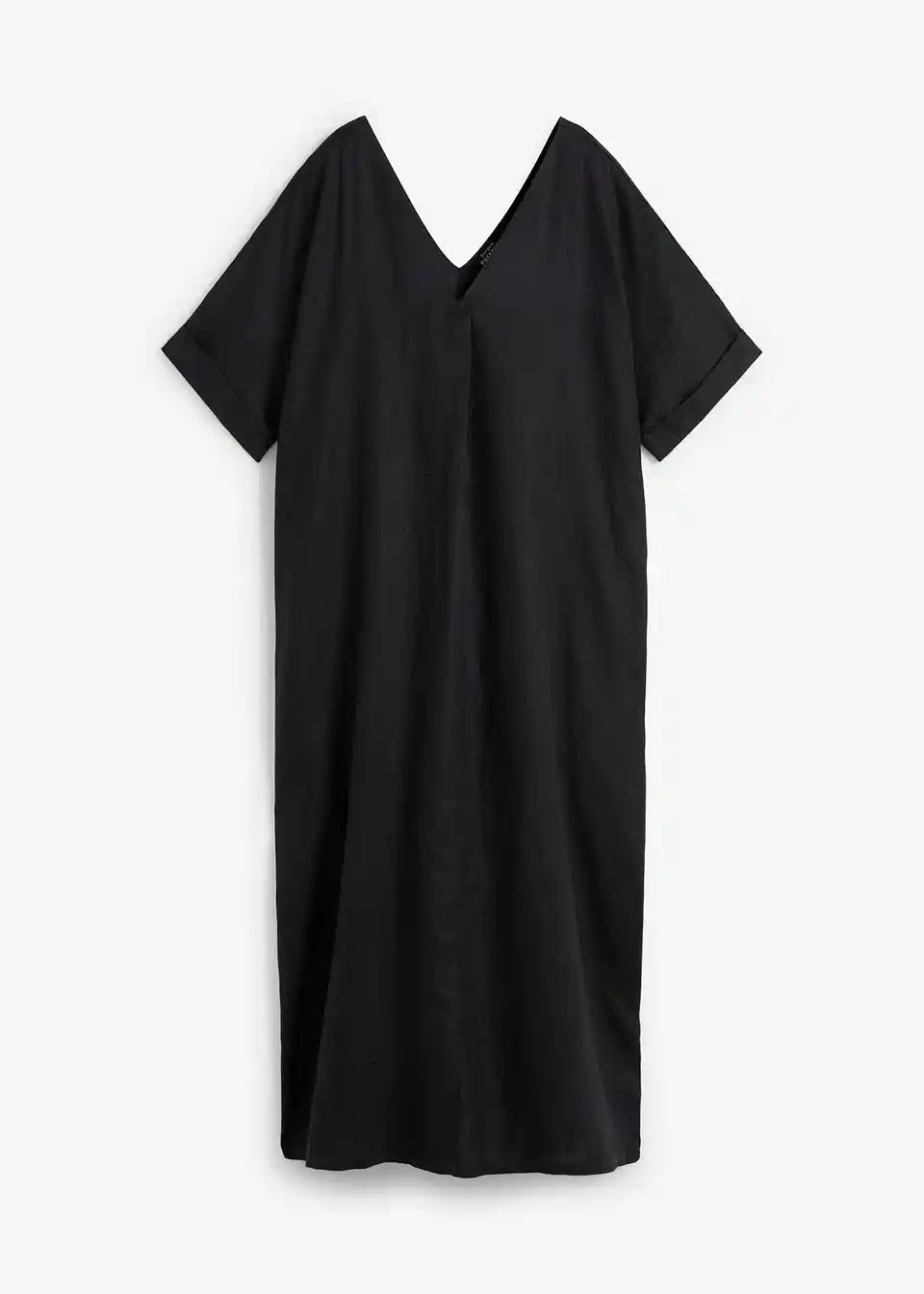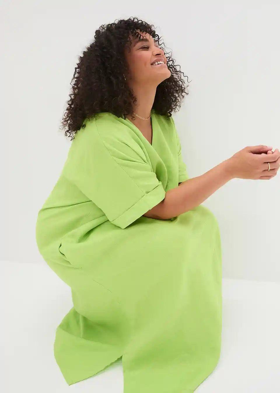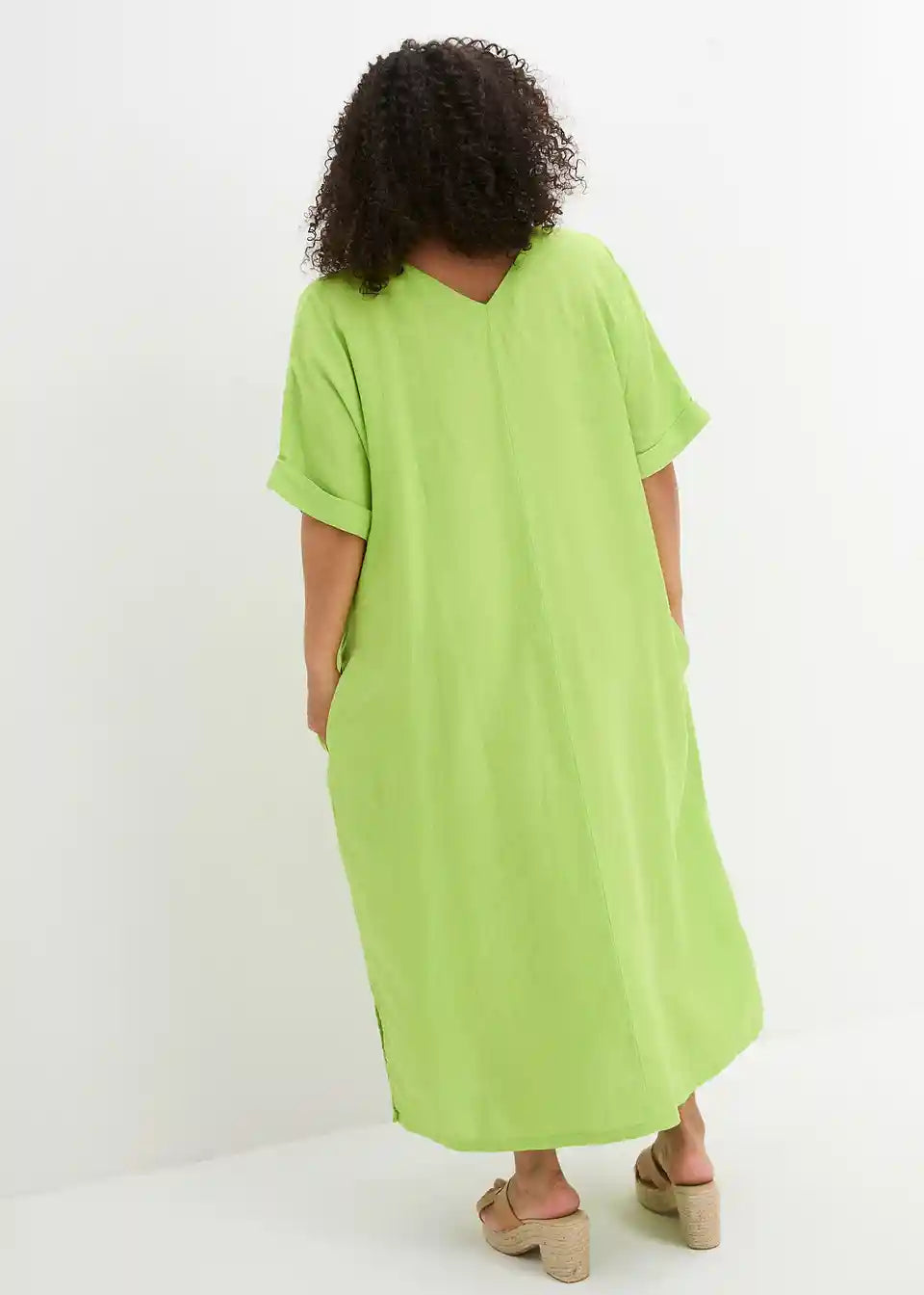 moderna lanena obleka s širokim krojem in globokim V-izrezom