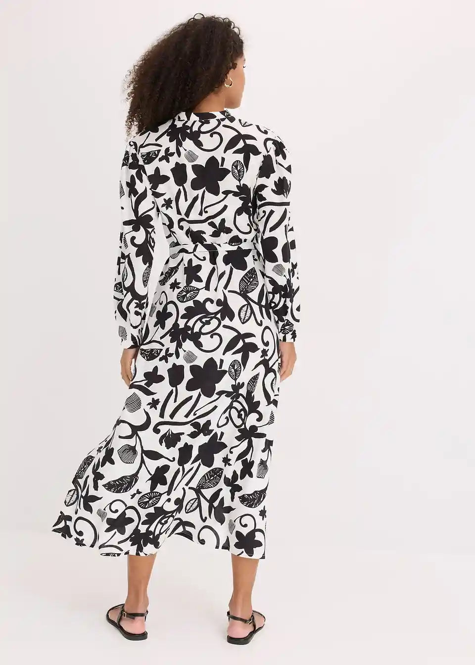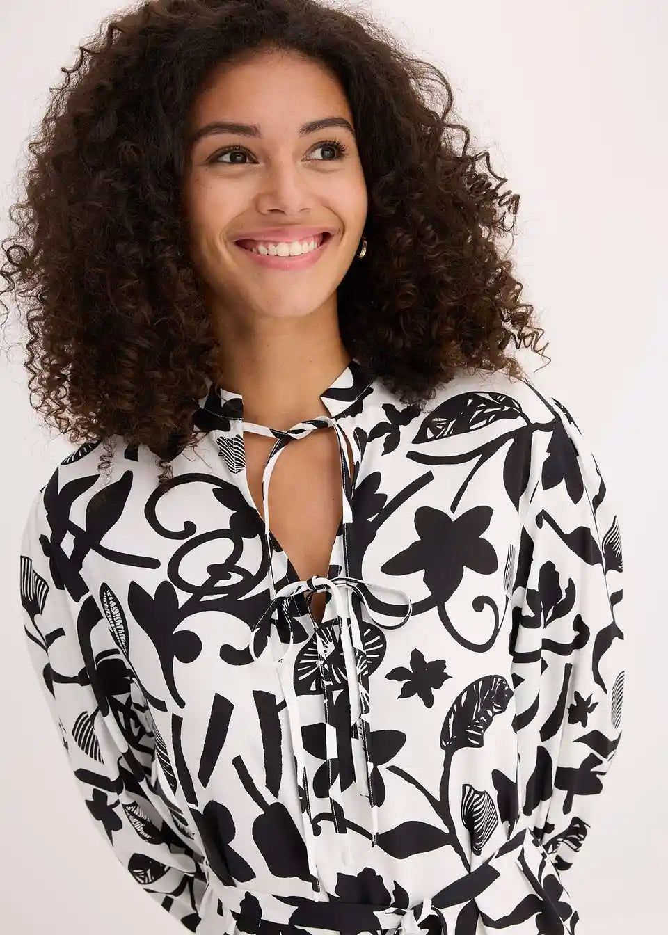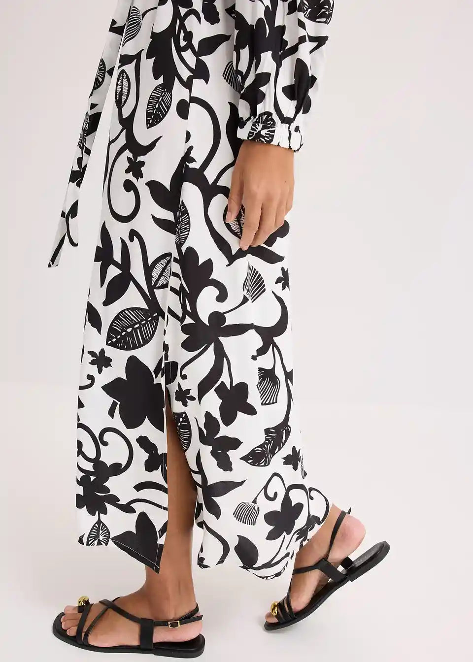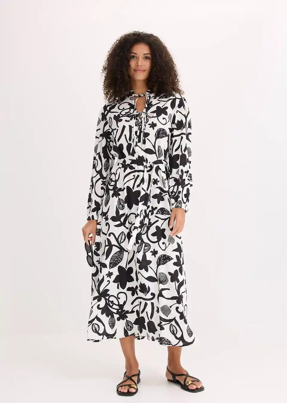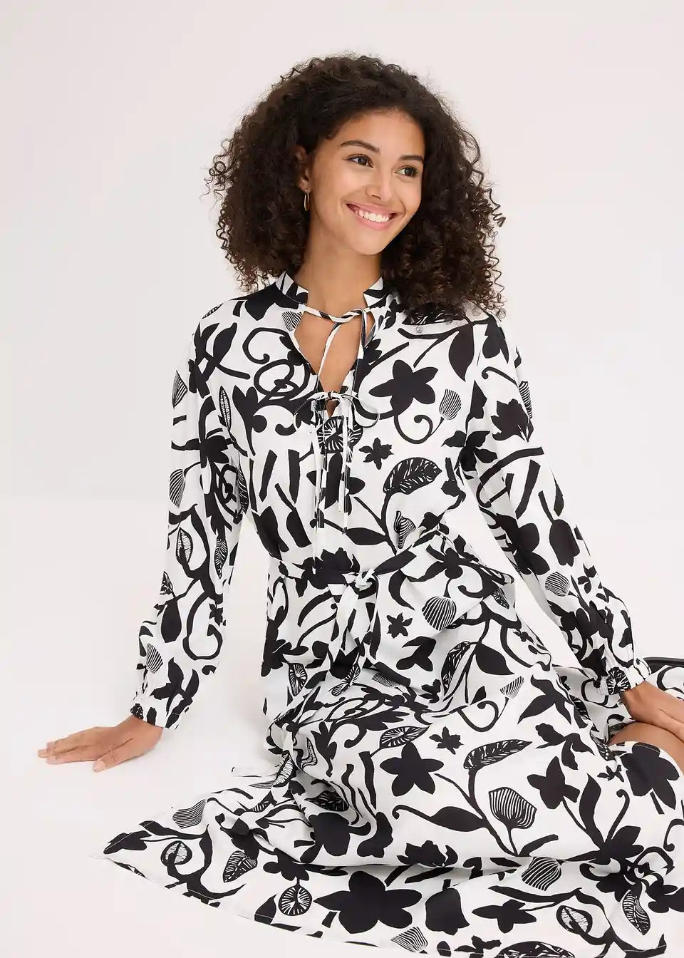 modno potiskana kaftan obleka v maksi dolžini iz tekoče viskoze z dvema majhnima zavezovalnima trakovoma spredaj pri izrezu in zavezovalnim trakom v pasu
