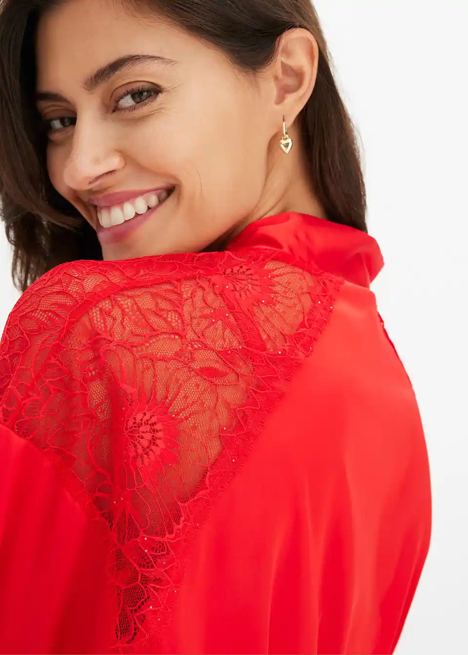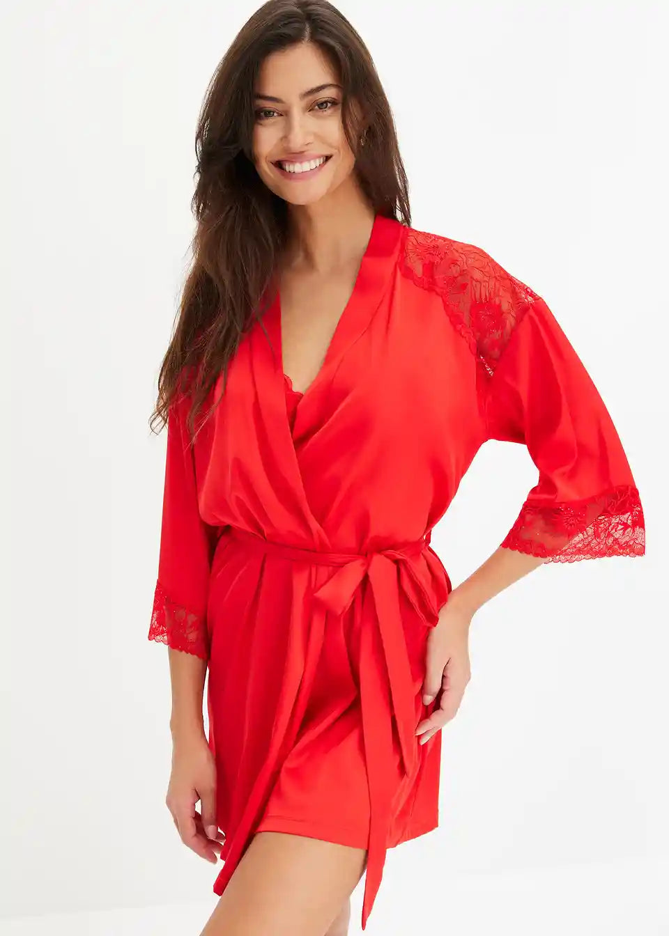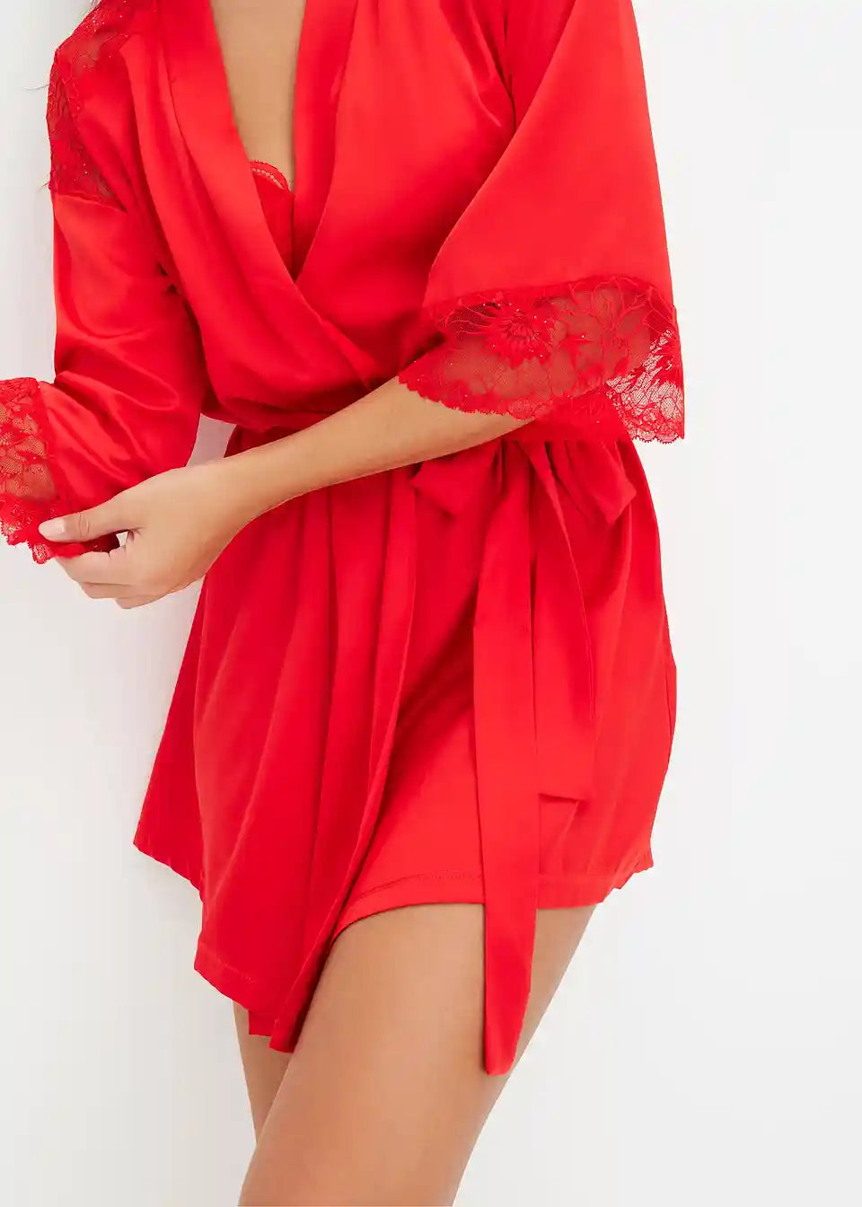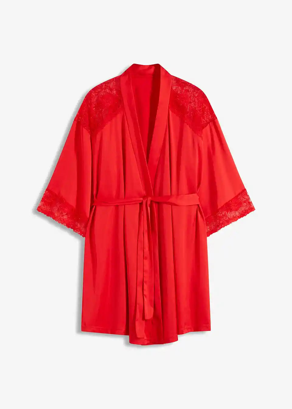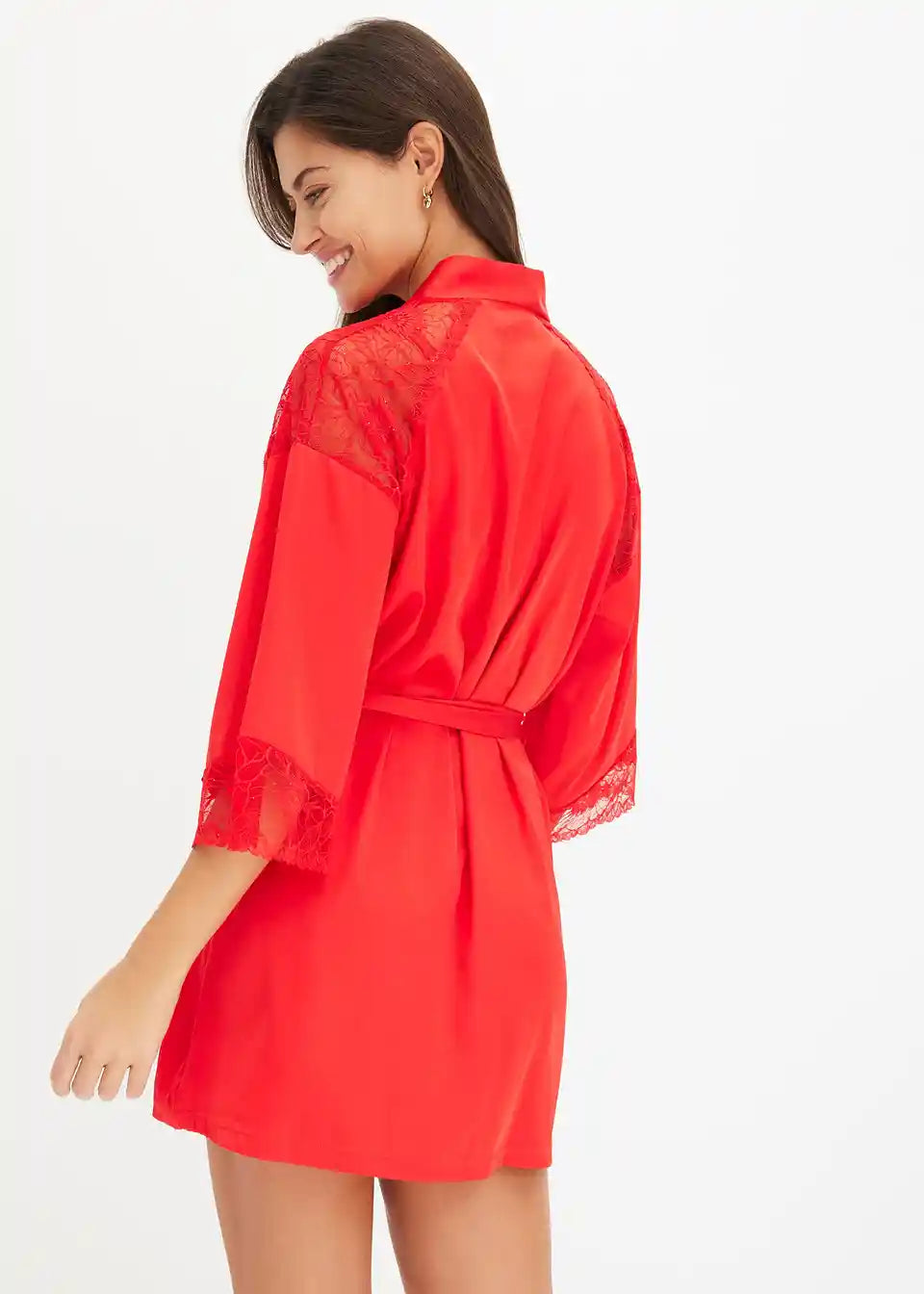 Eleganten, postavi laskajoč Kimono v osupljivi rdeči barvi in čipki z diskretnimi bleščicami