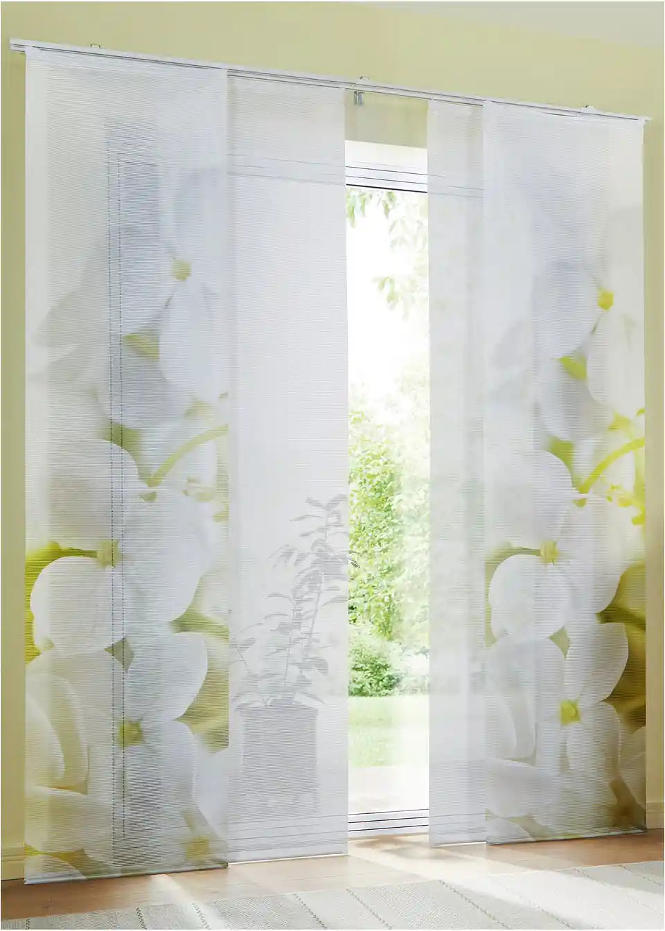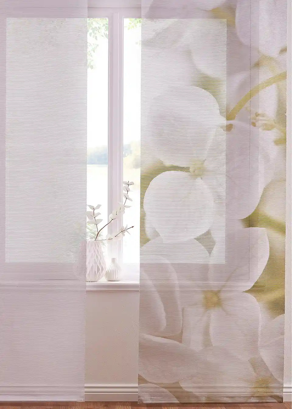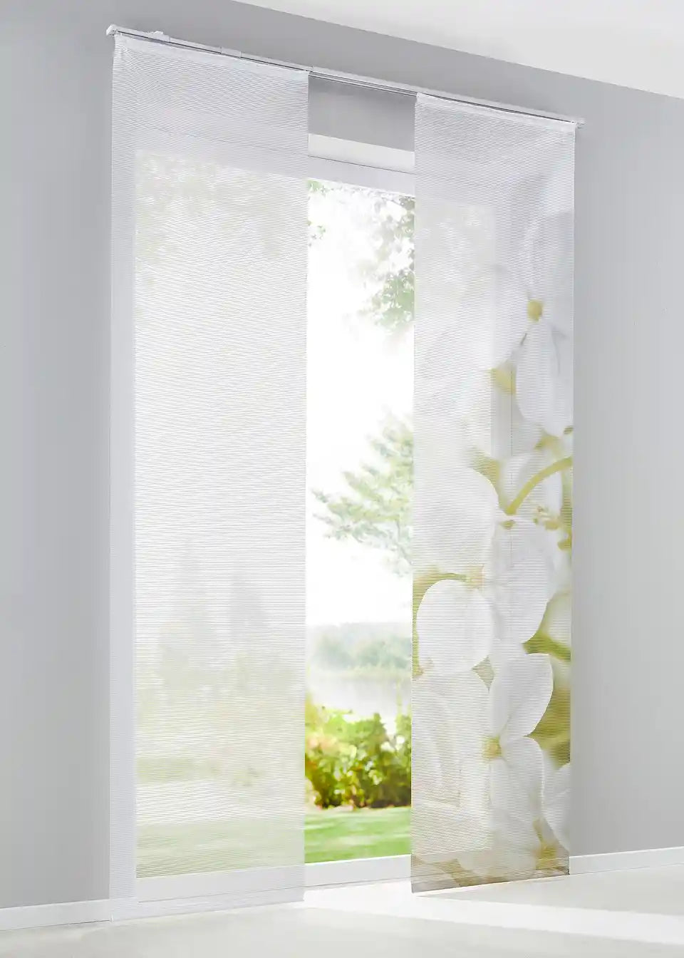 Okrasite svoje okno s to drsno zaveso, ki odraža eleganco in milino bele orhideje. Oddaja čistost in je prava lepota za vsak prostor. 2-delni komplet vsebuje drsno zaveso z motivom orhideje ter drsno zaveso brez motiva v preprosti beli barvi. Namestitev poteka preko prišitega nabora ter priloženih drsnikov (v obliki koleščkov ali črke X, primernih za vse tirne sisteme). Enostavno vstavite tri drsnike v nabor, zgoraj vstavite palico za stabilizacijo in pritrdite drsno zaveso v tirnici. Končano!