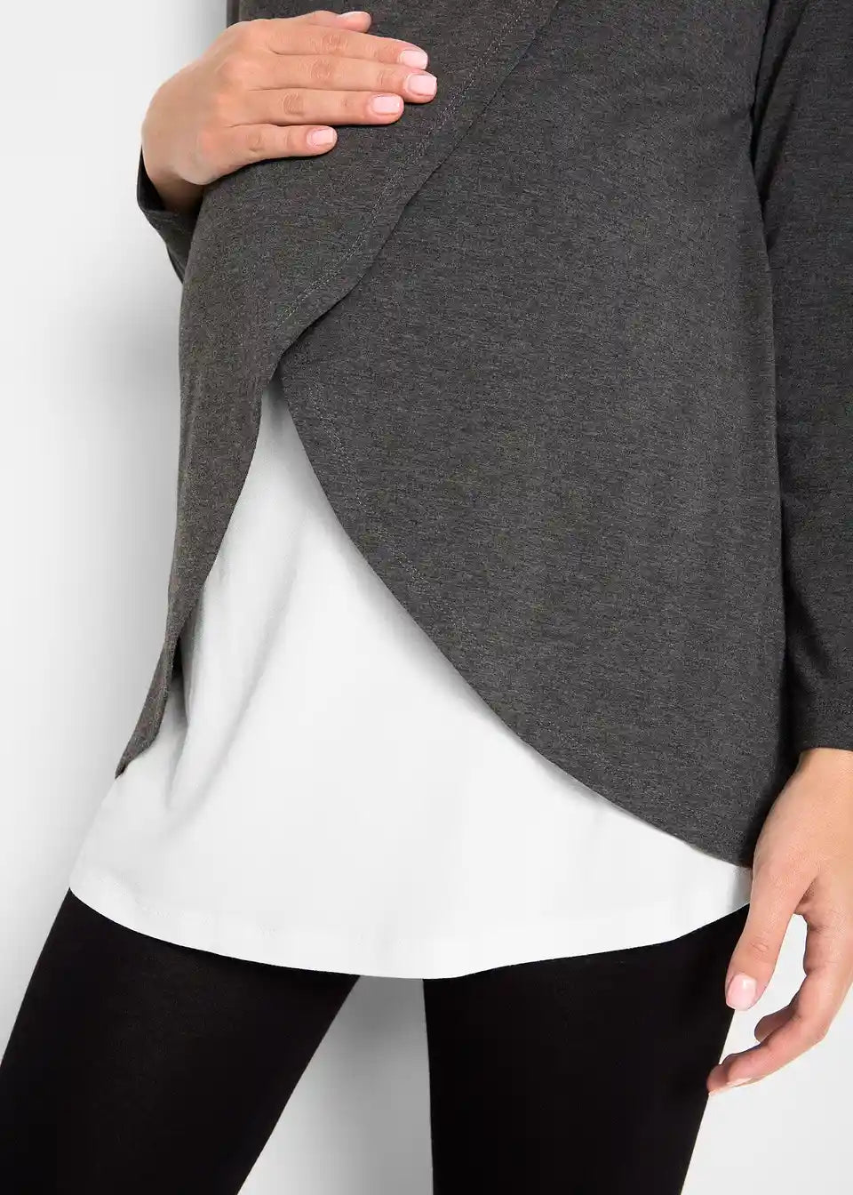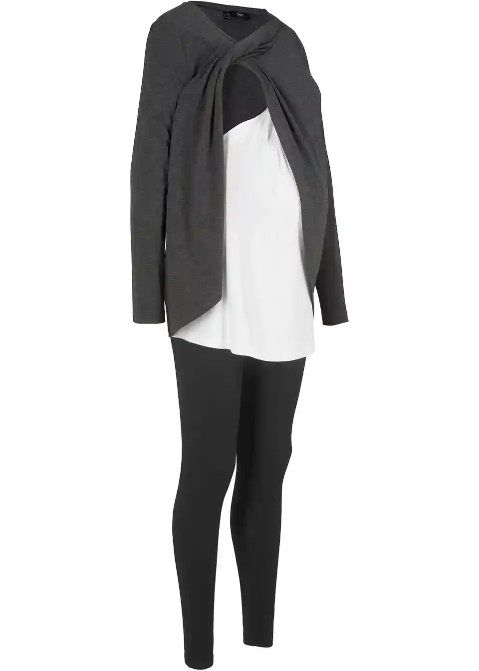 Komplet za nosečnice, sestavljen iz hlač in zgornjega dela z zavijalnim videzom, je primeren za vse faze nosečnosti in tudi po njej. Hlače z visokim pasom ter udoben zgornji del se prilagajajo obliki trebuha. Mame bodo v tem udobnem kompletu za nosečnost našle dolgotrajno zadovoljstvo.