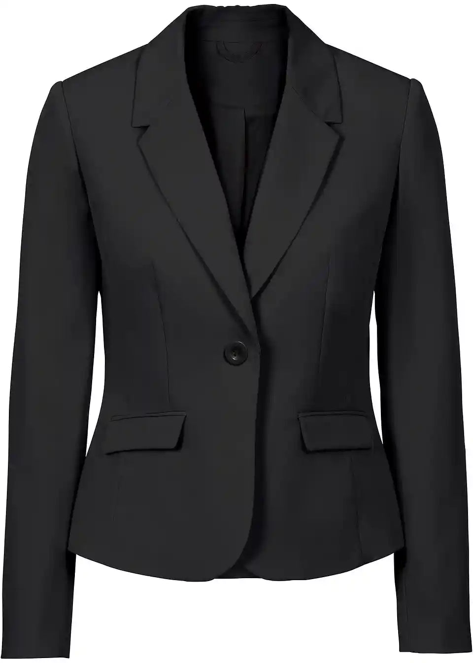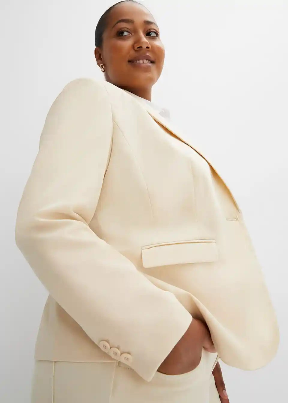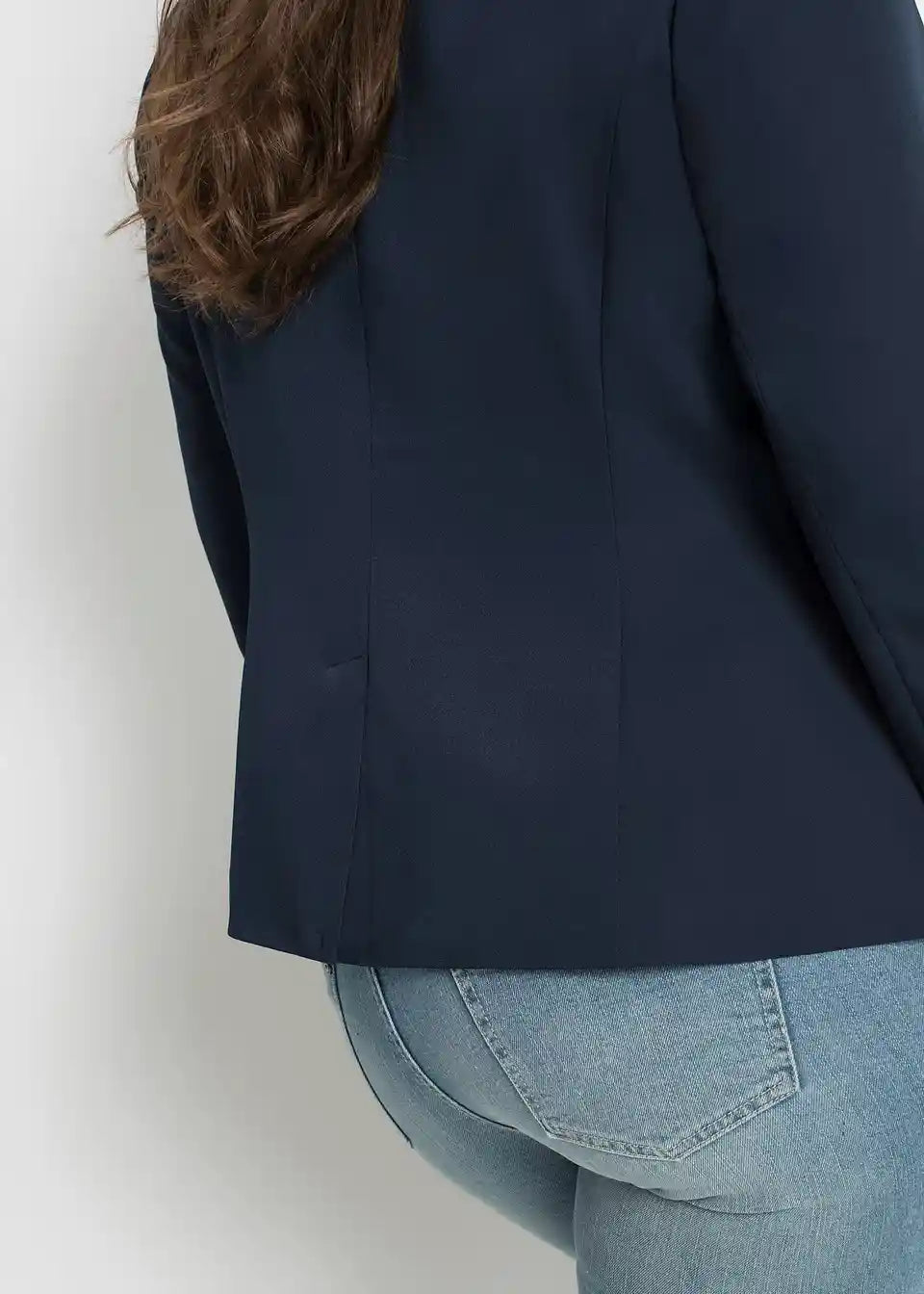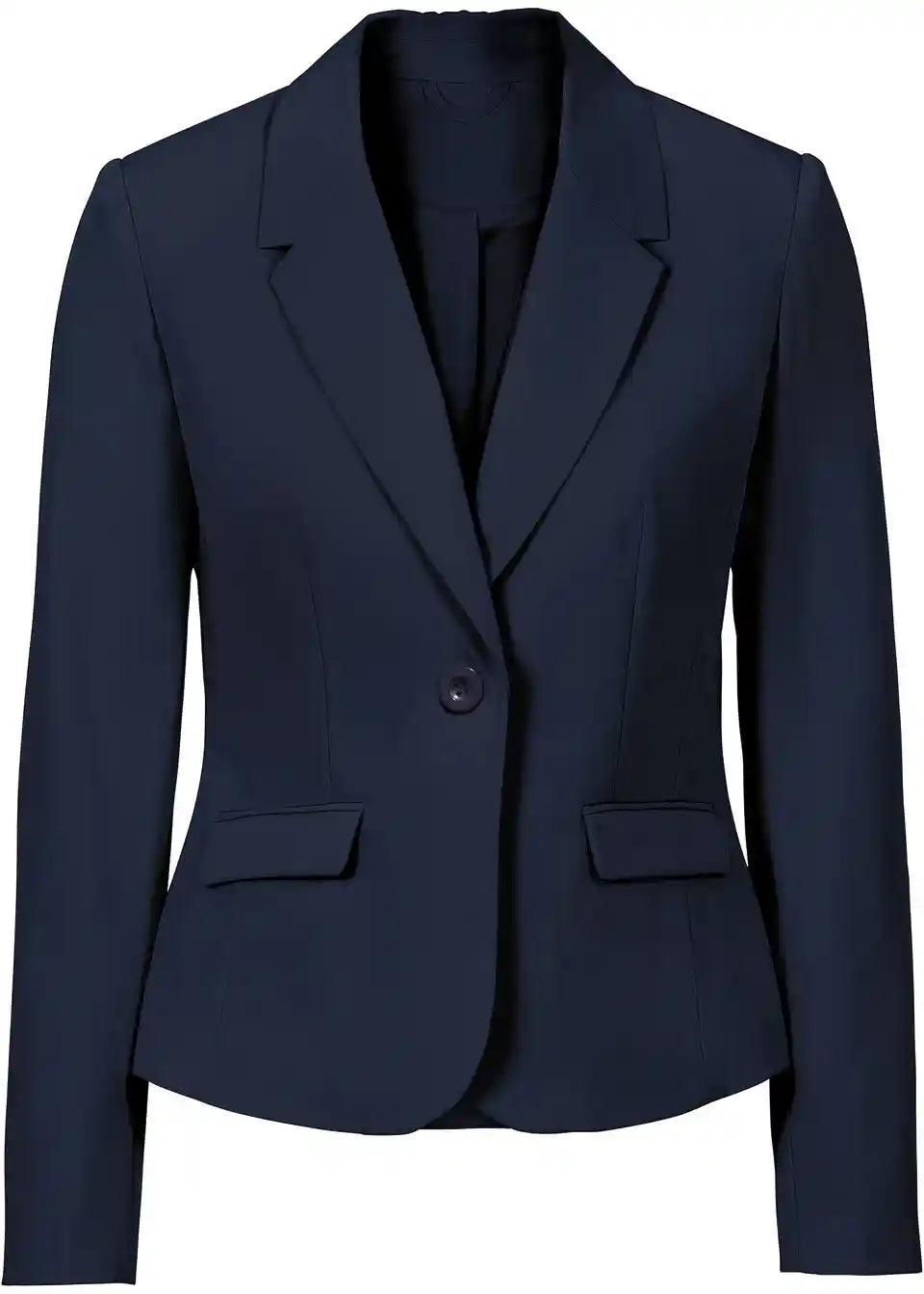 Ta kratek poslovni blazer ima dva našita žepka s preklopom in se zapira z gumbom na sprednji strani. Dolžina pri št. 38 je približno 58 cm.