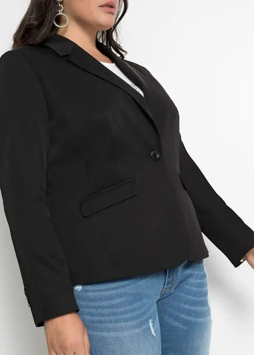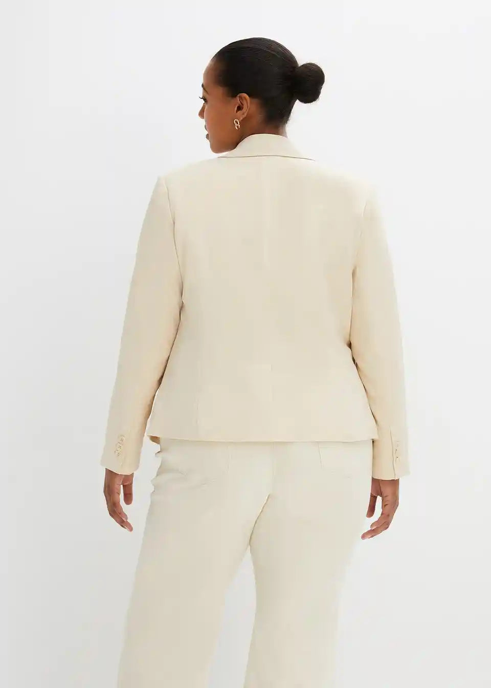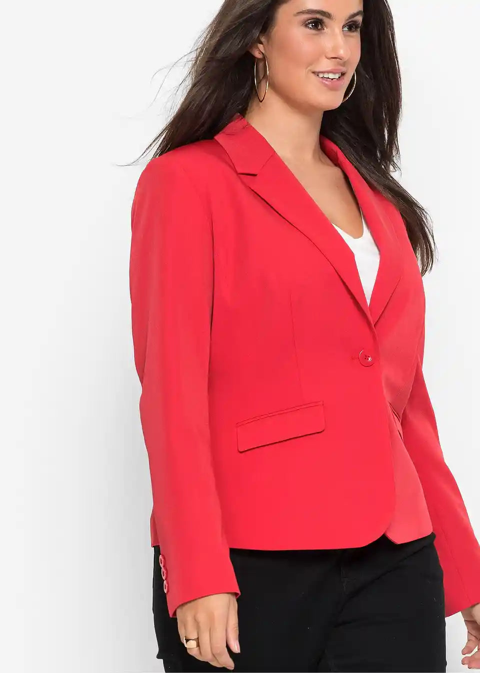 Ta kratek poslovni blazer ima dva našita žepka s preklopom in se zapira z gumbom na sprednji strani. Dolžina pri št. 38 je približno 58 cm.