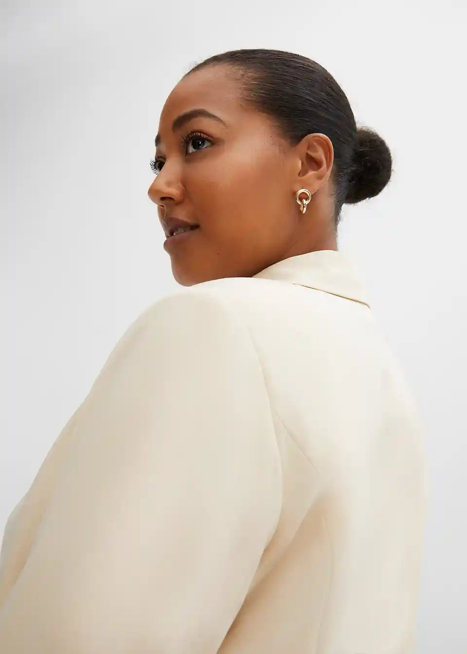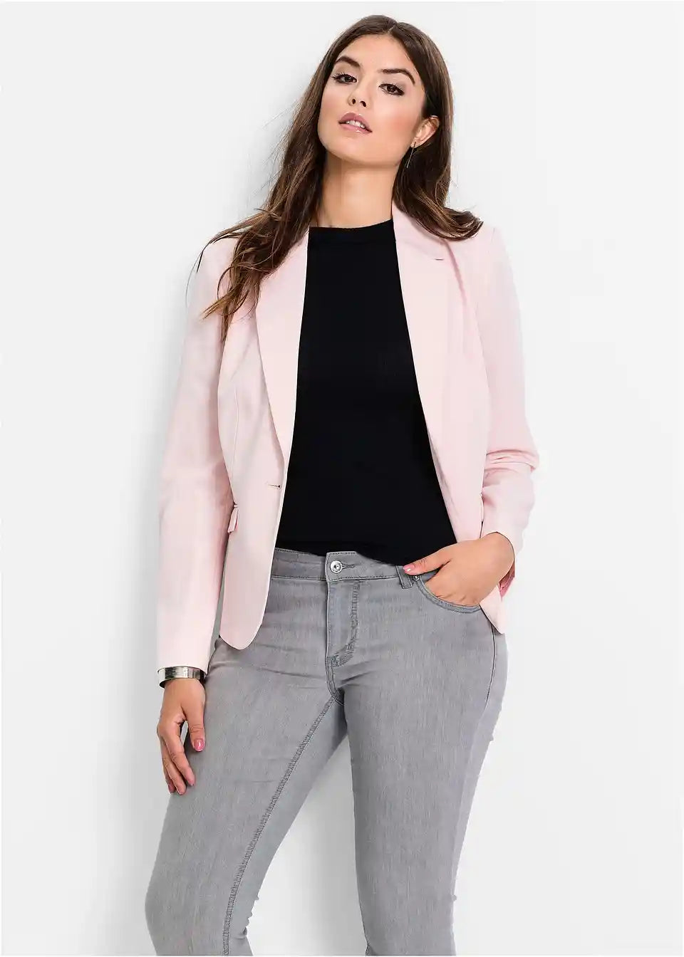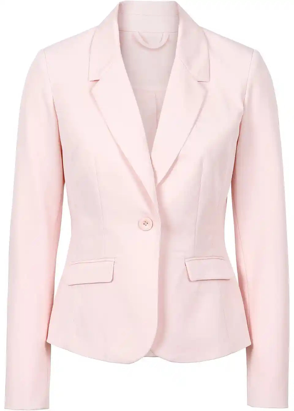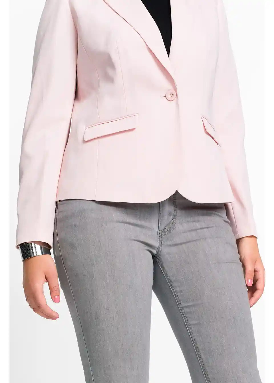 Ta kratek poslovni blazer ima dva našita žepka s preklopom in se zapira z gumbom na sprednji strani. Dolžina pri št. 38 je približno 58 cm.