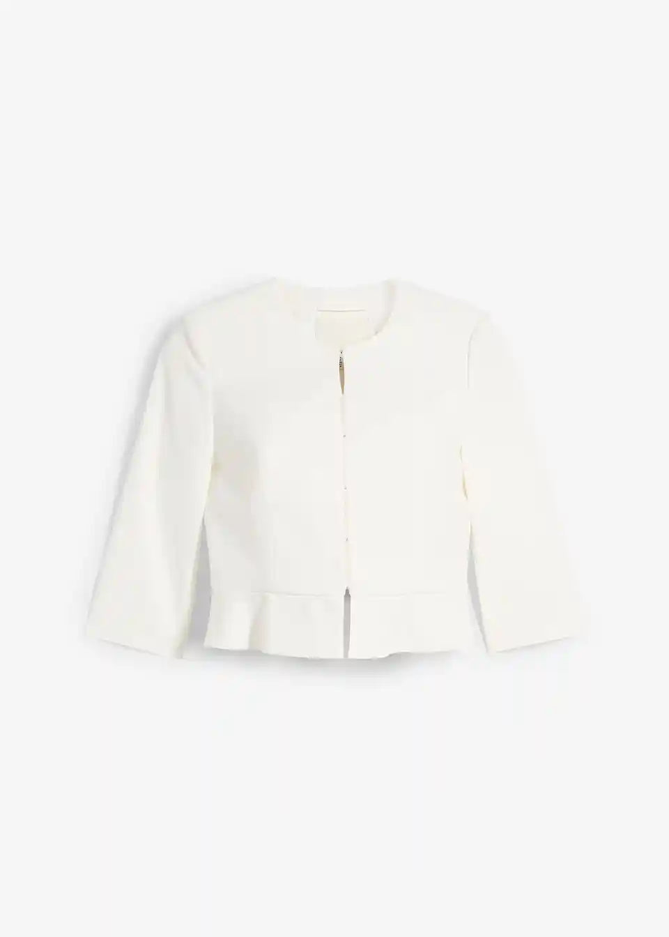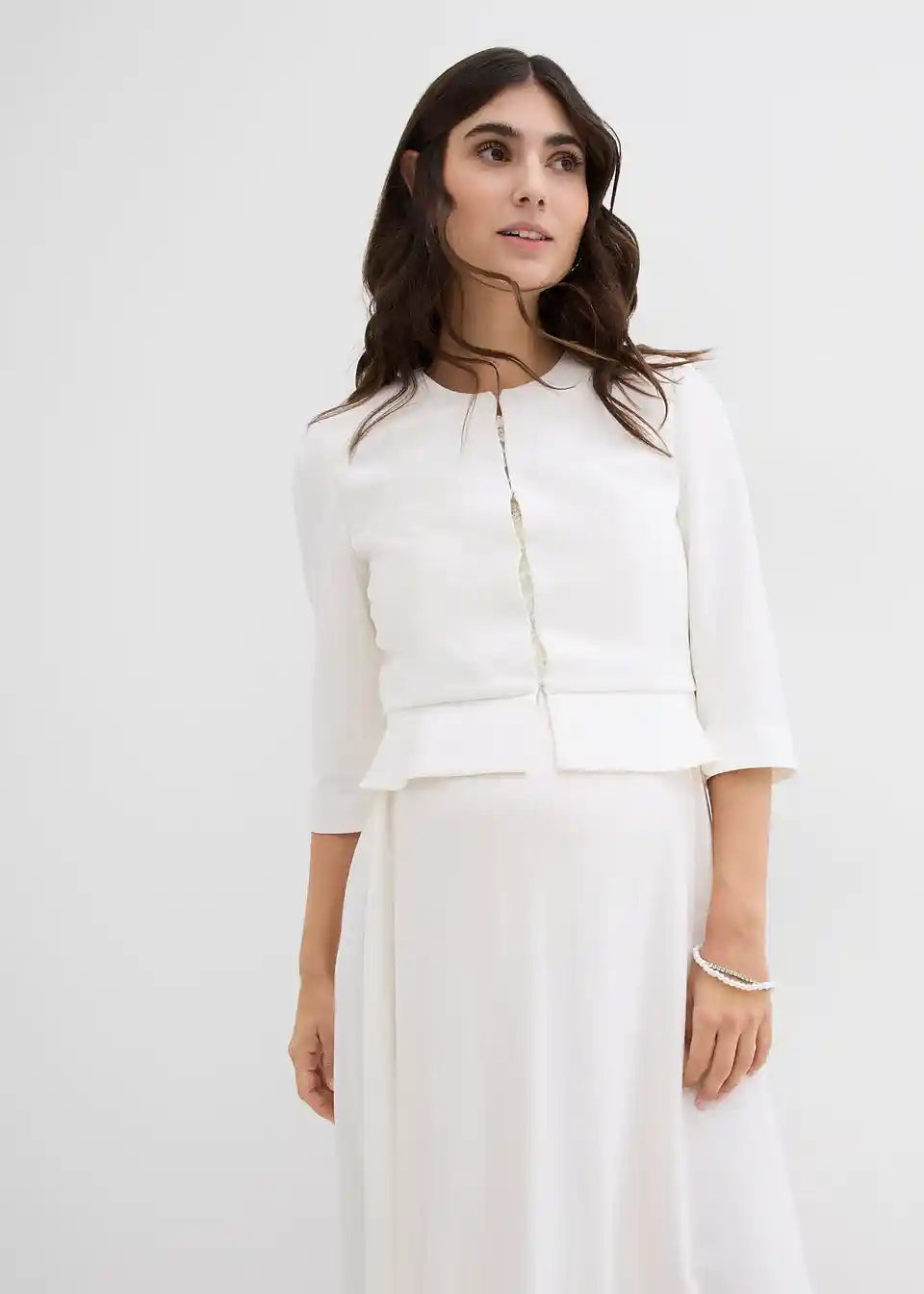 Kratek blazer z okroglim izrezom iz tkanega satena s svilnatim leskom. Rokavi imajo laskavo rahlo skrajšano dolžino. Rob je zaključen s peplumom, jakna pa se zapira s finimi kaveljčki in zankami.