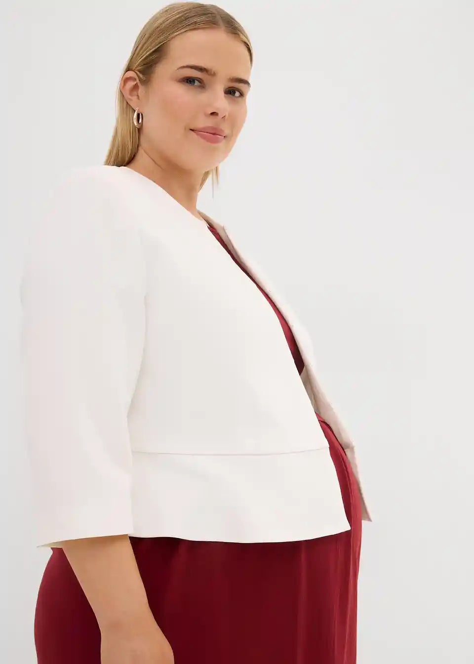 Kratek blazer z okroglim izrezom iz tkanega satena s svilnatim leskom. Rokavi imajo laskavo rahlo skrajšano dolžino. Rob je zaključen s peplumom, jakna pa se zapenja z nežnimi kaveljčki in zankami.