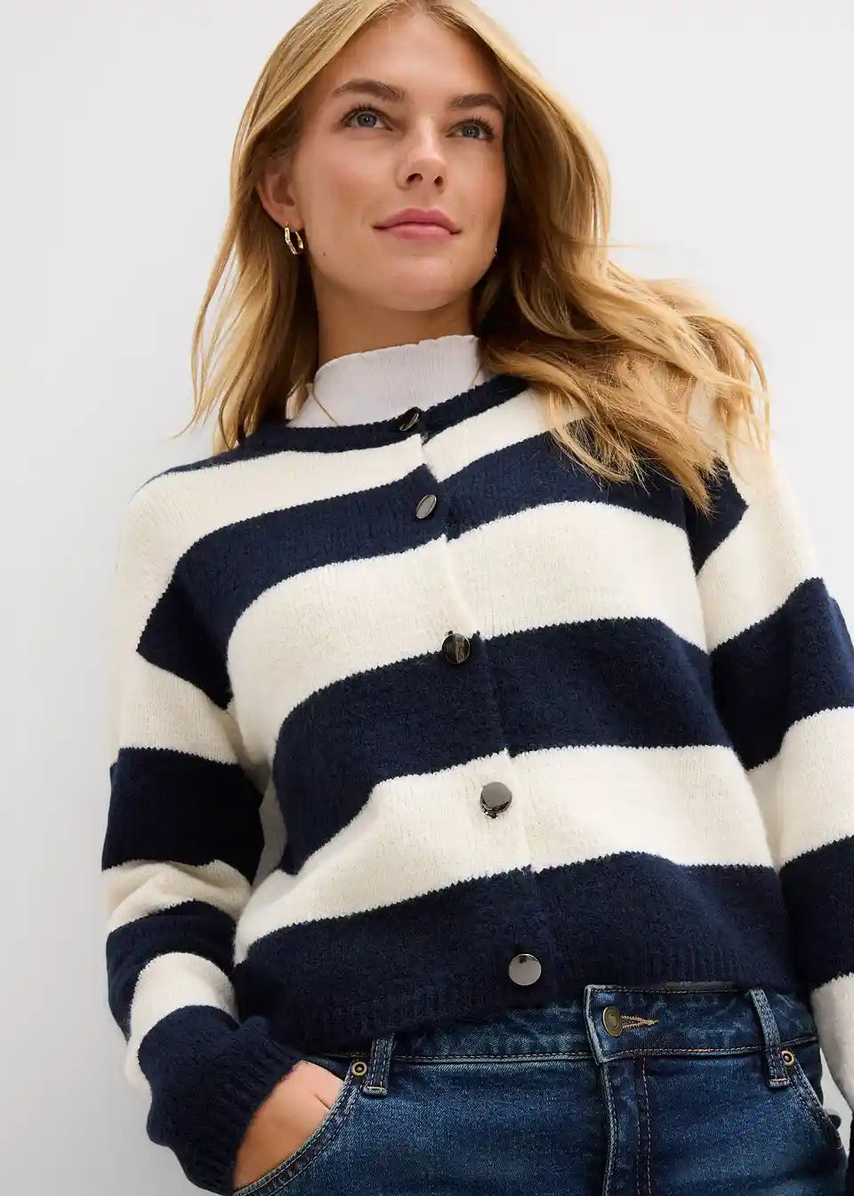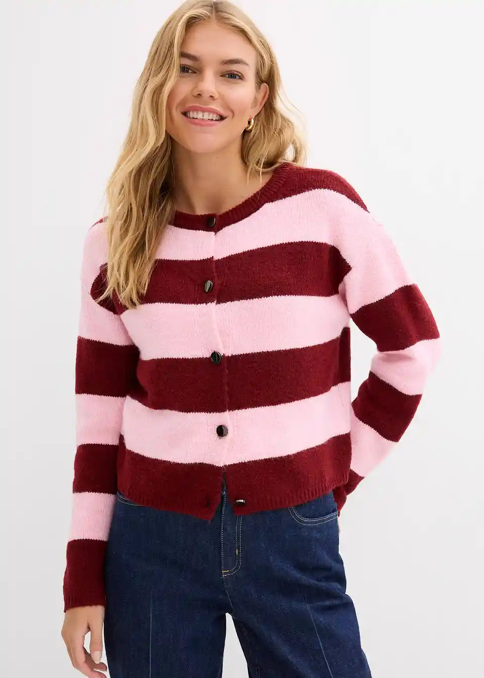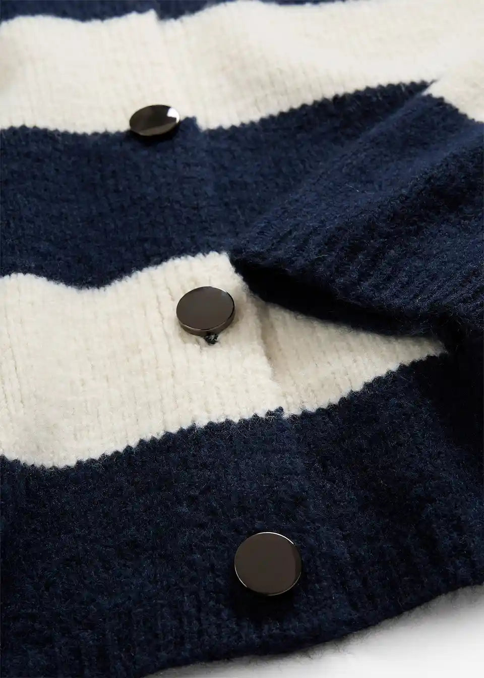 Kratka fino pletena jopa z gumbi in črtami