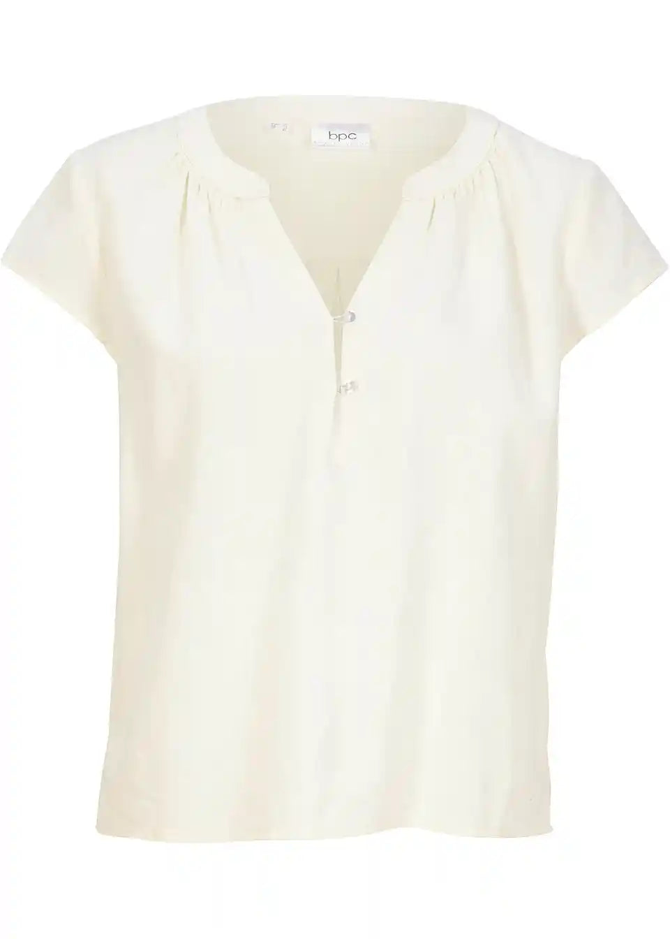 Preprosta bluza z lanom in prefinjenim detajlom gumba na izrezu