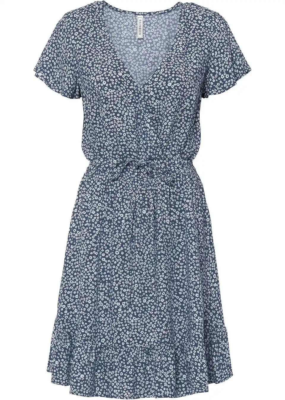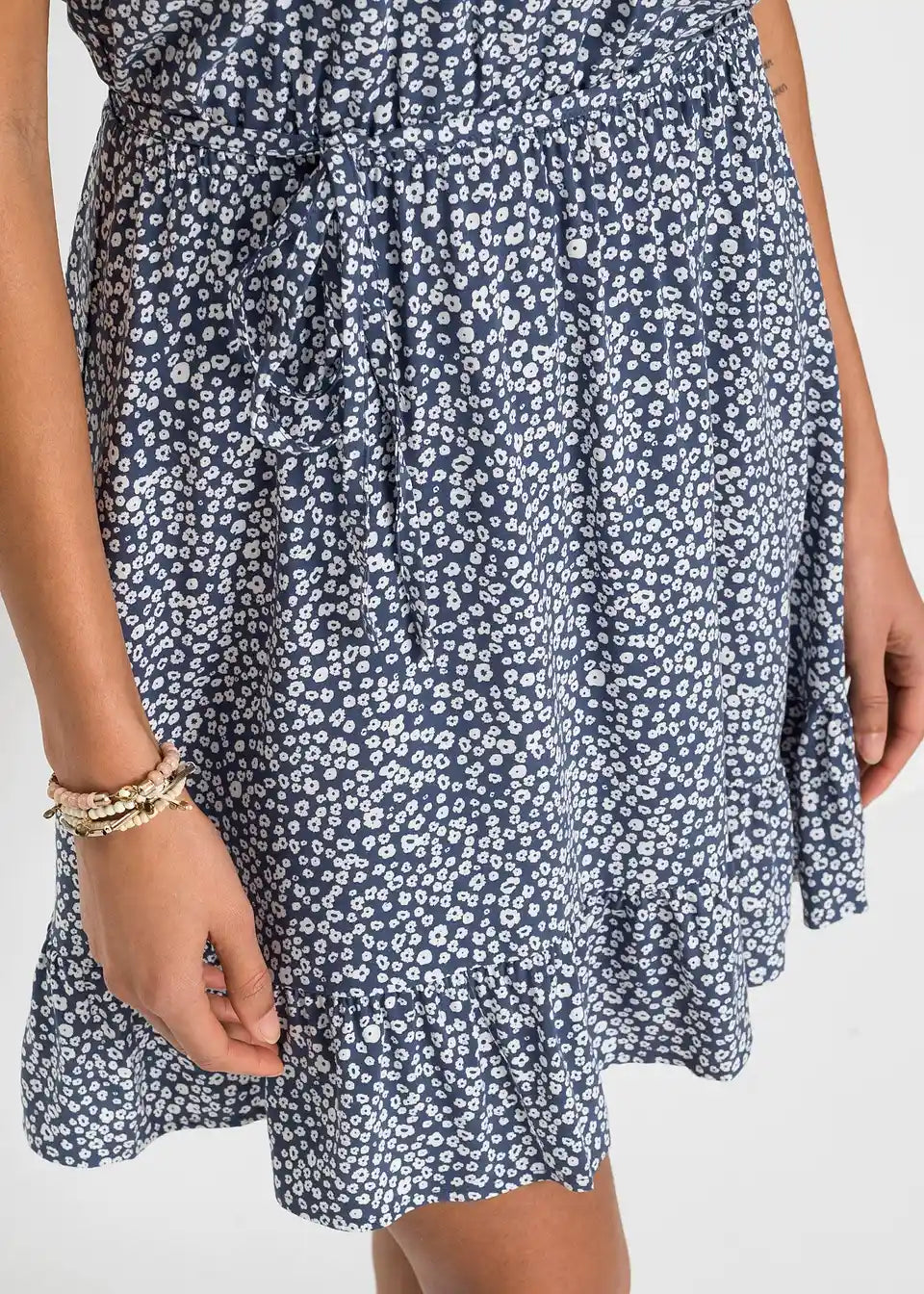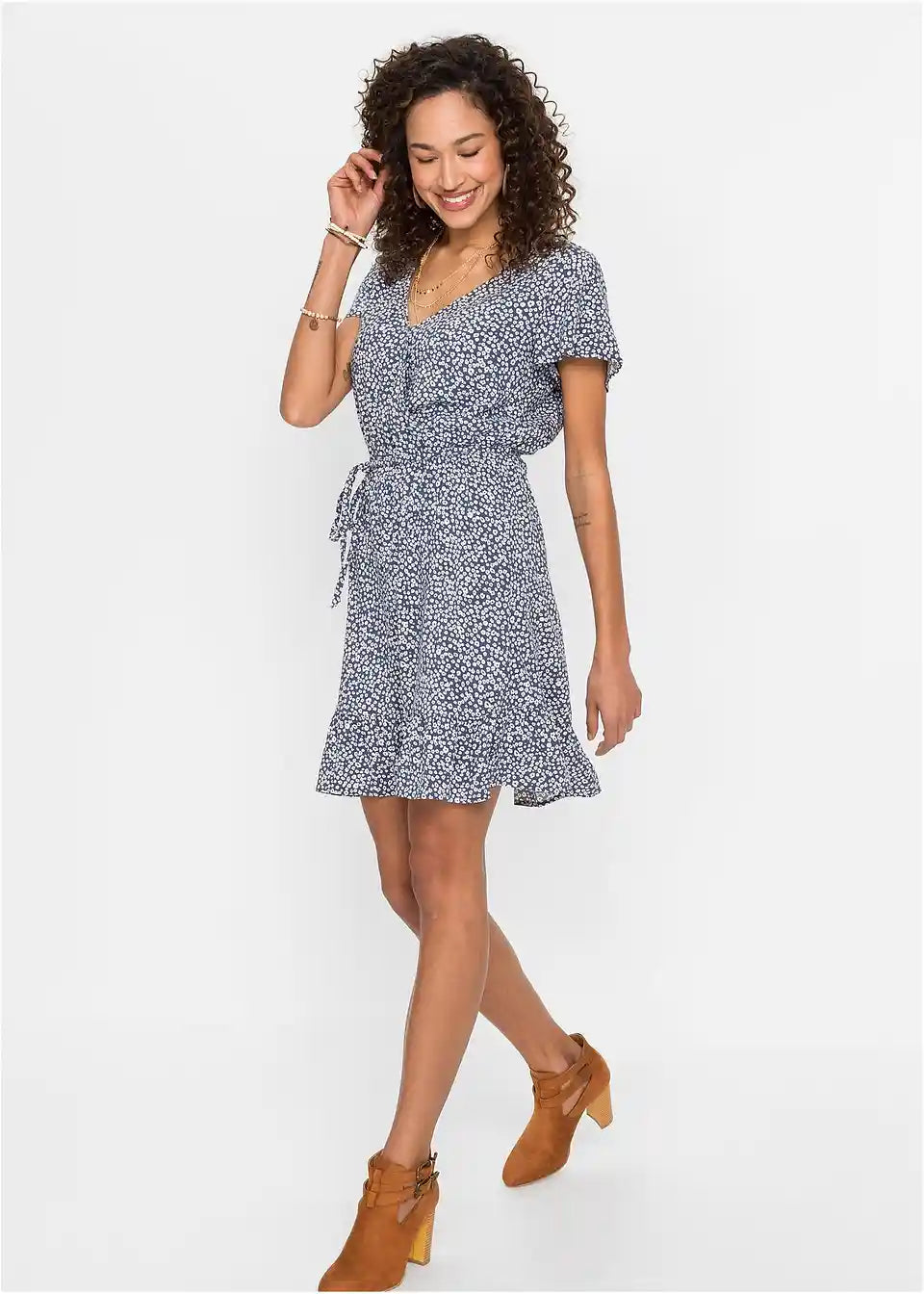 Z volančki in V-izrezom. Skupna dolžina velikosti 38 je približno 92 cm.