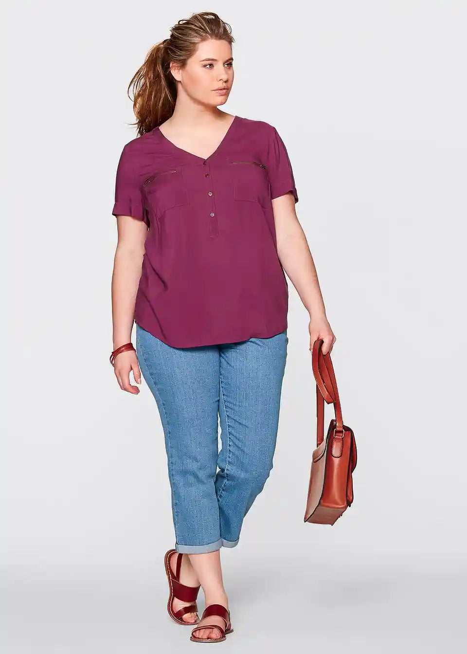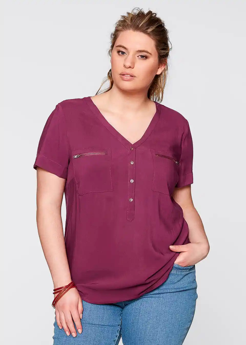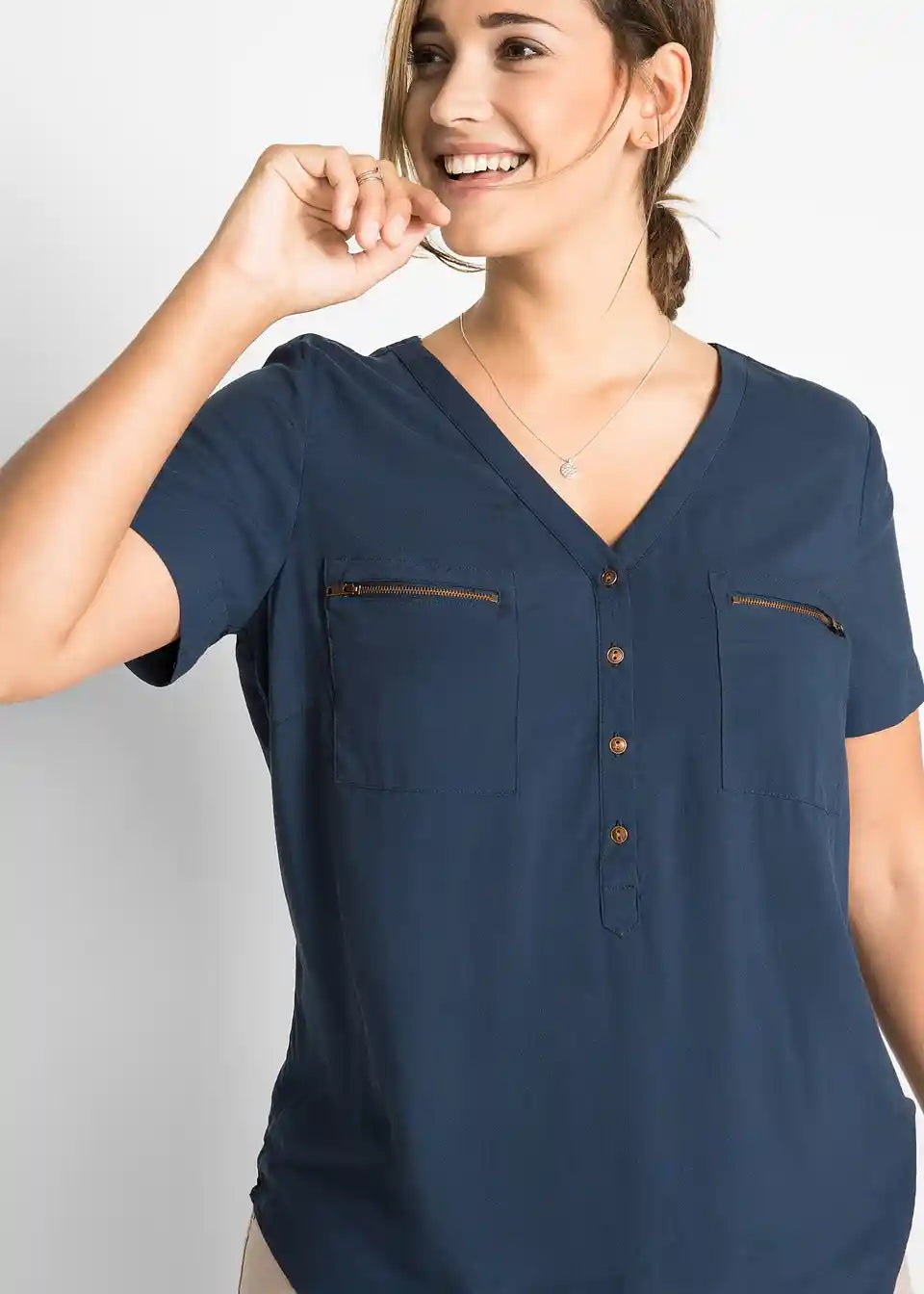Ohlapna krojna oblika in prijetna viskozna kakovost naredita to srajco znamke bpc v priljubljen kos oblačila za vsakdan. Privlačen V-izrez se nadaljuje v majhno vrsto gumbov, s pomočjo katerega ga lahko individualno prilagajate. Dodatna atrakcija sta dva prsna žepa z zadrgo. Rahlo zaobljen hrbtni rob dopolnjuje privlačen dizajn viskozne srajce s kratkimi rokavi.