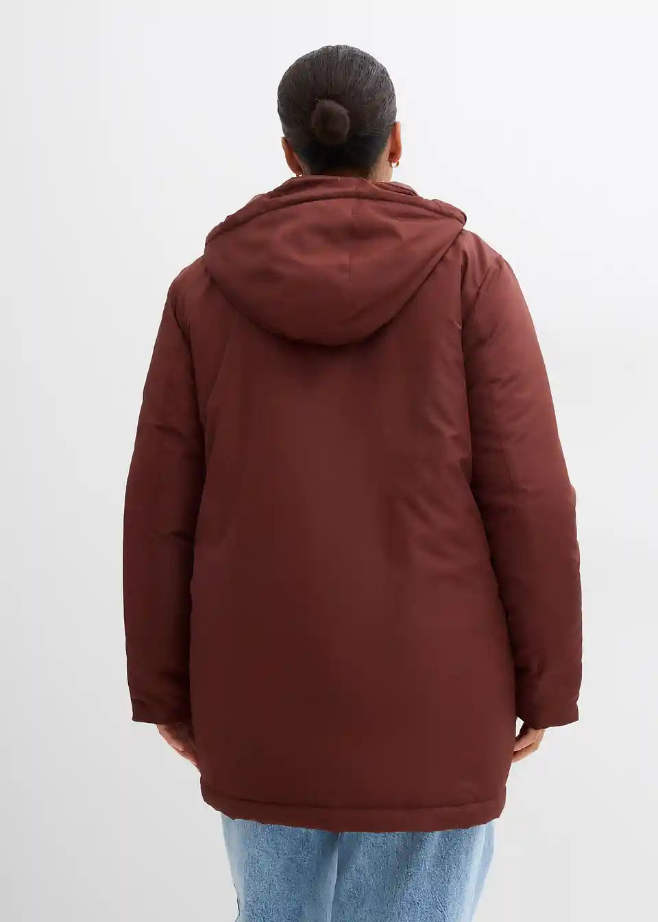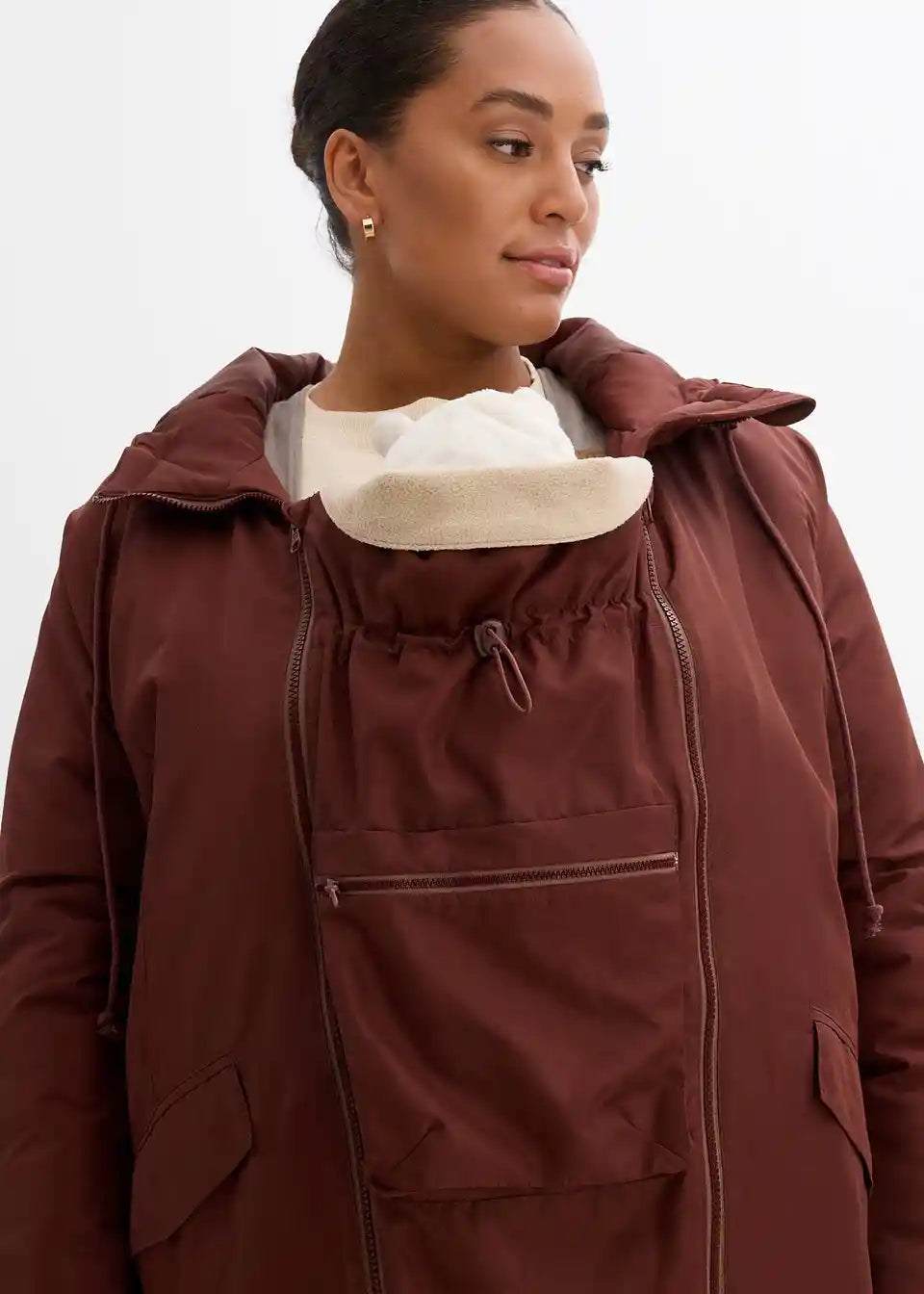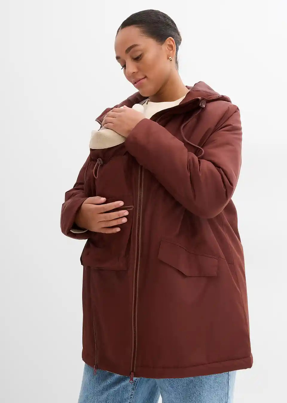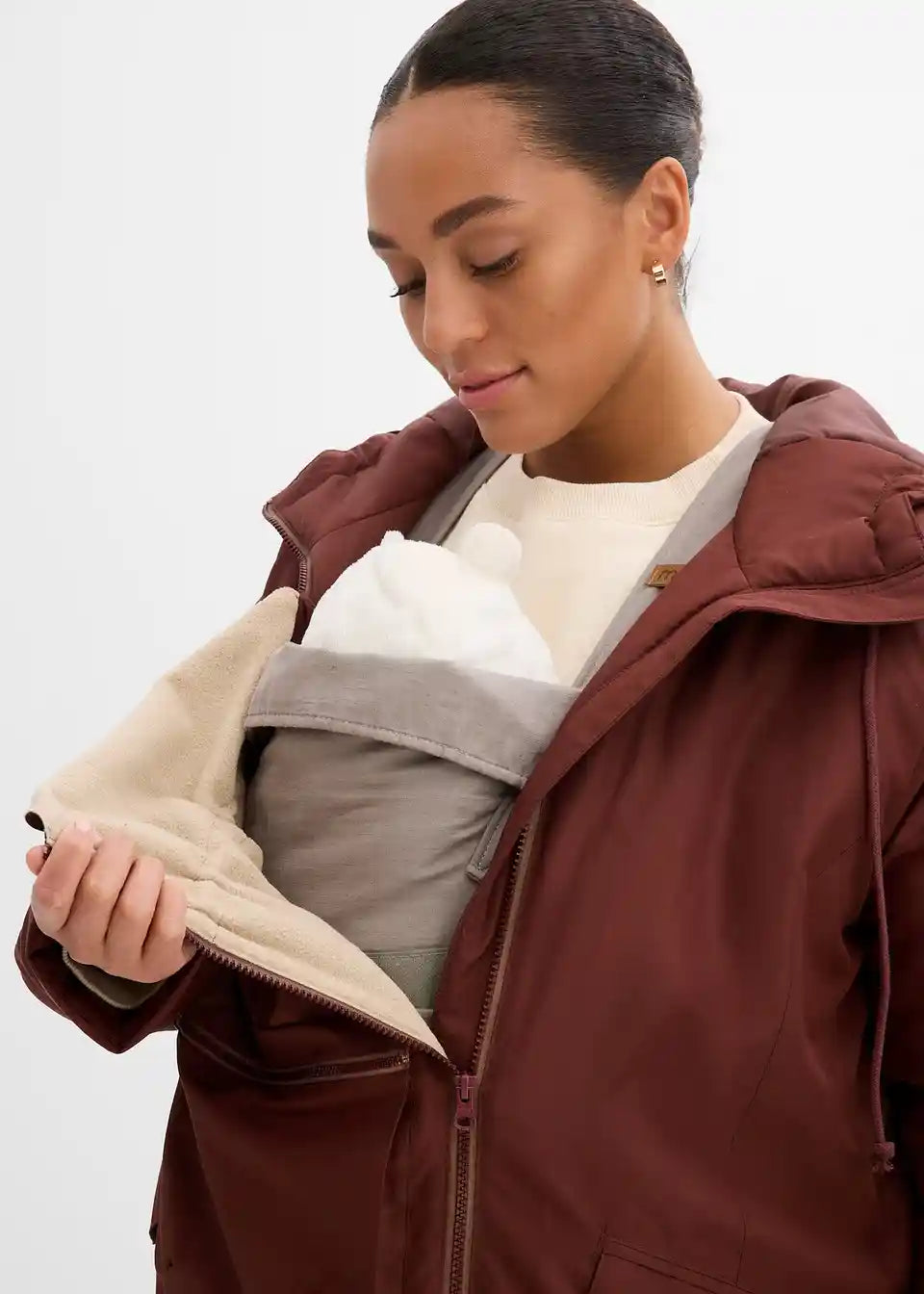Lahka funkcionalna jakna, odporna na dež in veter, z dvema vložkoma: razširitveni vložek za nosečnost in vložek za nošenje otroka. Vložek za nošenje je prijetno podložen s tkanino Teddyfleece in ima priročen žep za otroške potrebščine. Velika kapuca je opremljena z vrvicami in zaščito proti dežju. Spredaj sta dva velika žepa s poklopcem.
