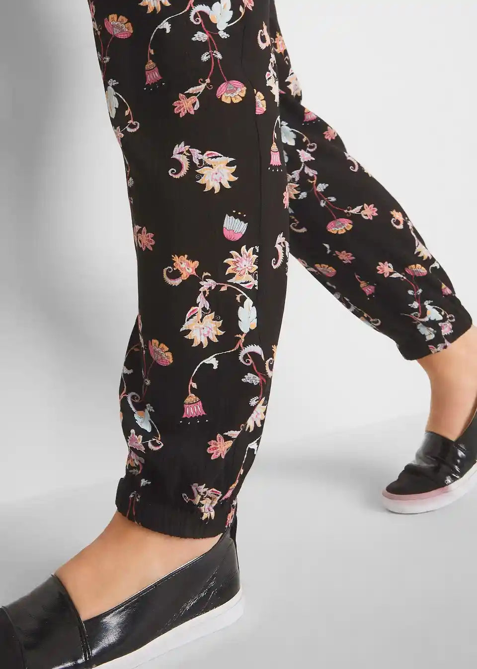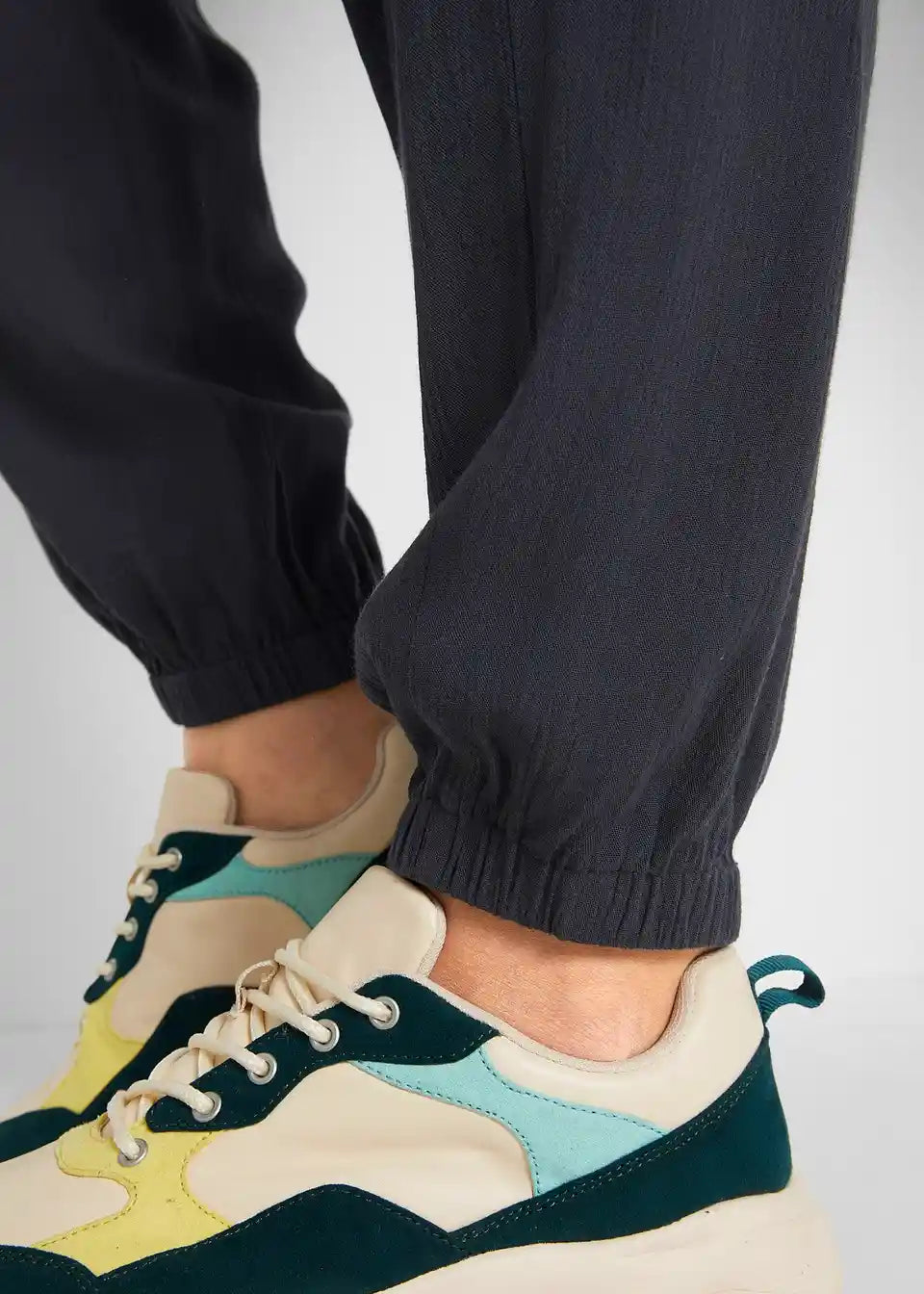 Iz lahkega viskoza-krepa. Z odstranljivim zavezovalnim trakom in bočnim žepom. Ohlapne, zožene hlačnice z elastičnimi zaključki.
