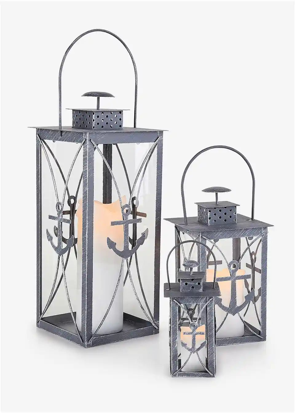 Čudovit komplet lantern s pomorskim motivom sidra in steklenimi ploščami. Ali v dnevnem prostoru, na hodniku, terasi ali balkonu, te laterne povsod ustvarijo prijetno svetlobo. Dimenzije Š/G/V pribl. veliko: 15,5x15,5x40 cm, srednje: 12x12x26 cm, majhno: 7x7x17,5 cm.