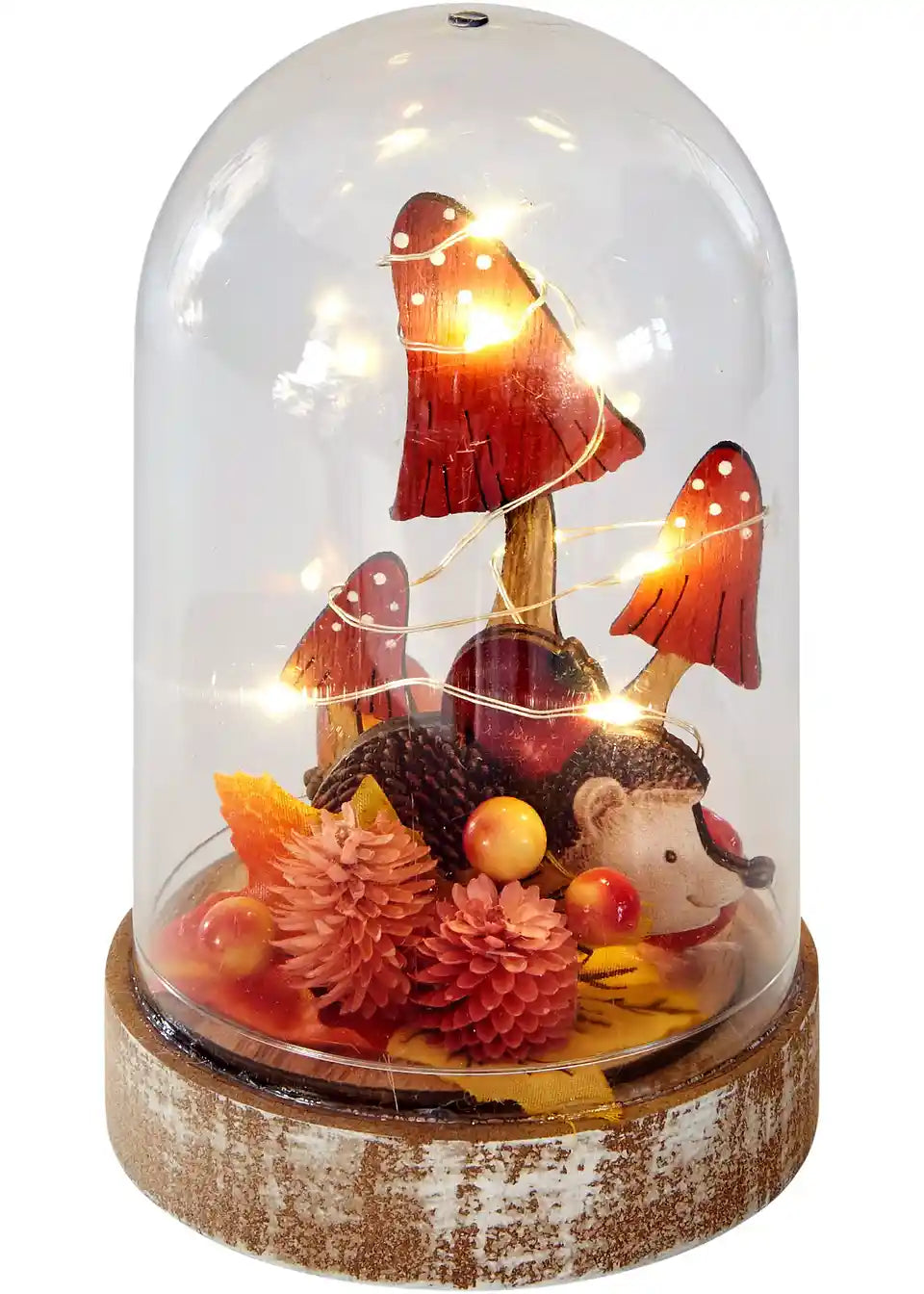 Jesenska LED dekoracija s številnimi majhnimi podrobnostmi. Kupola ščiti pred prahom in umazanijo. 10 toplo belih LED-ic osvetljuje objekt in ustvarja prijetno vzdušje. Vključuje 3xLR41 baterije.