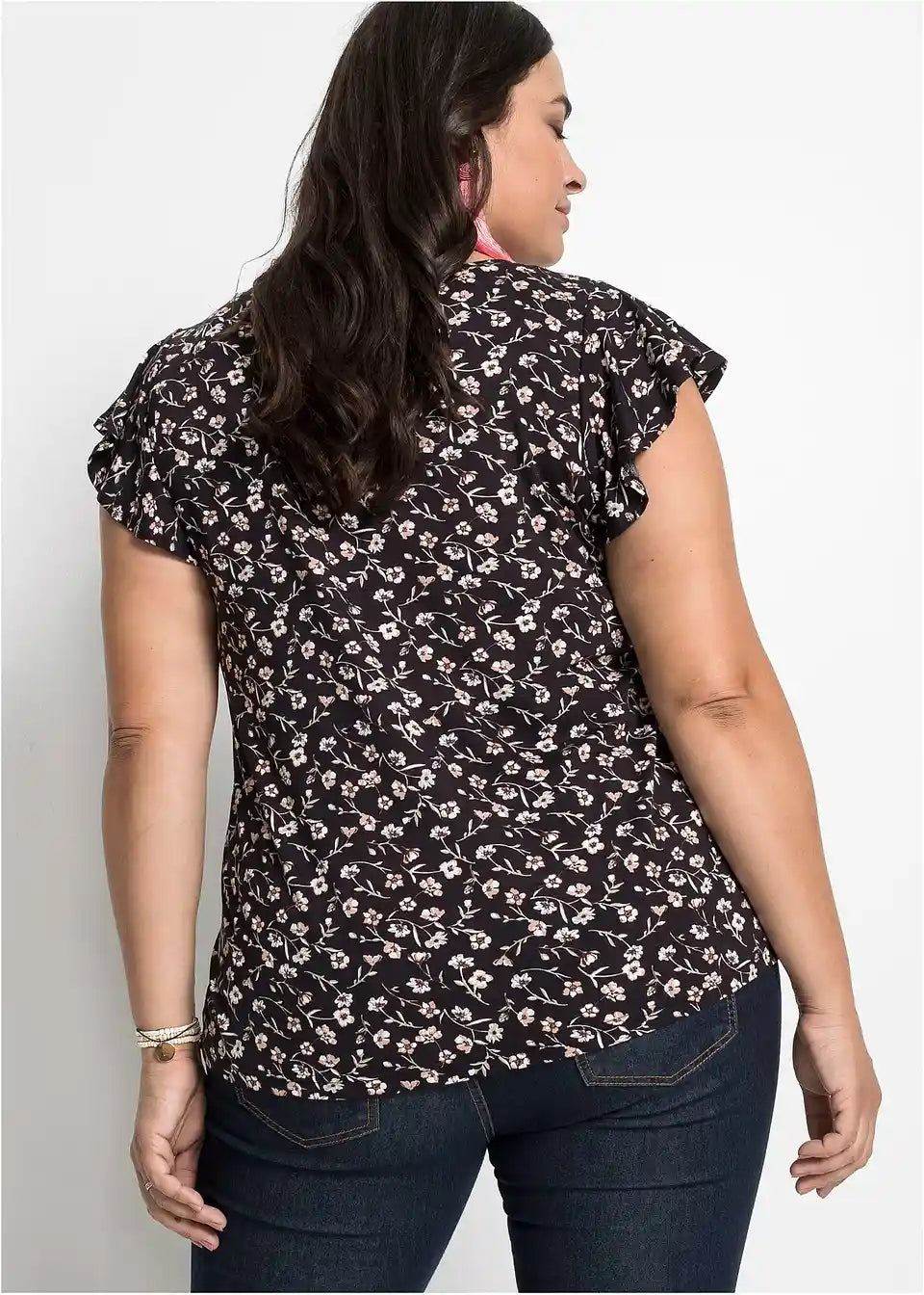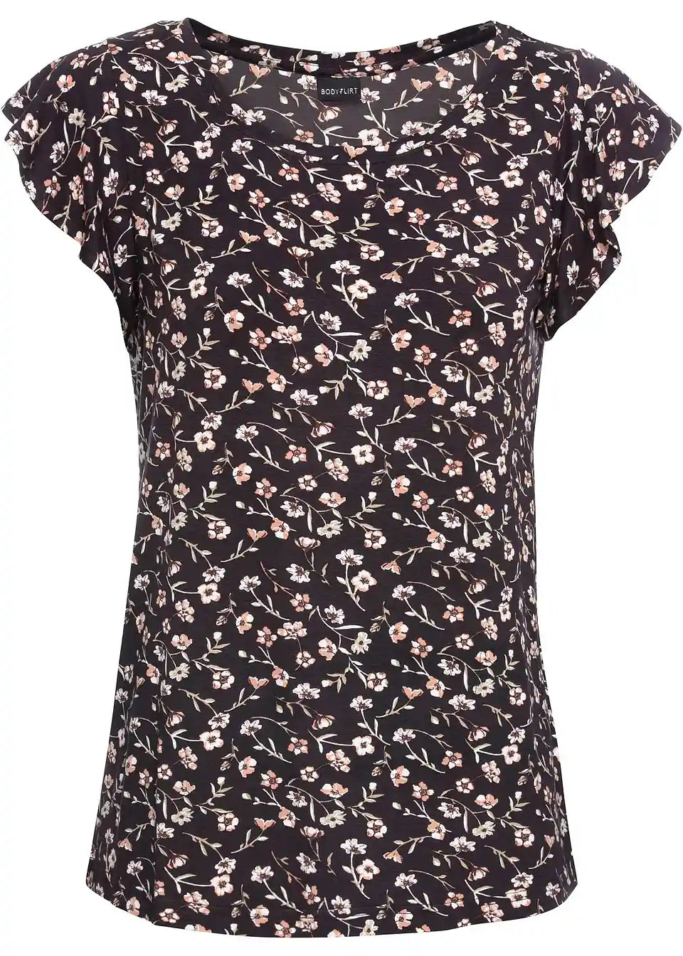 Super moderna majica znamke Bodyflirt. Oblačilo je izdelano z volančki na izrezu rokavov. Dolžina pri št. 36/38 znaša približno 64 cm.