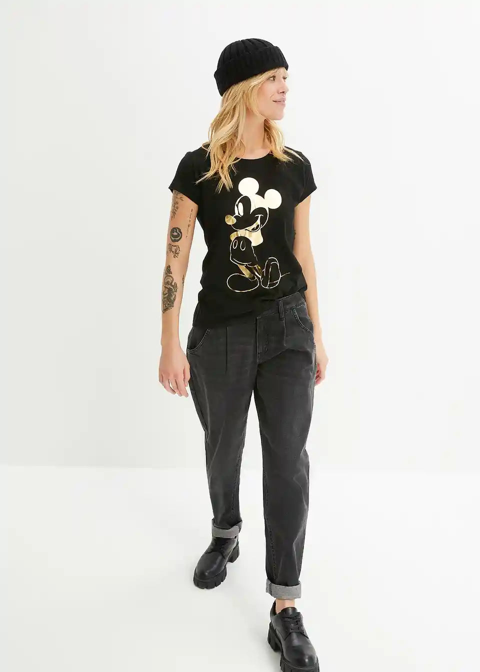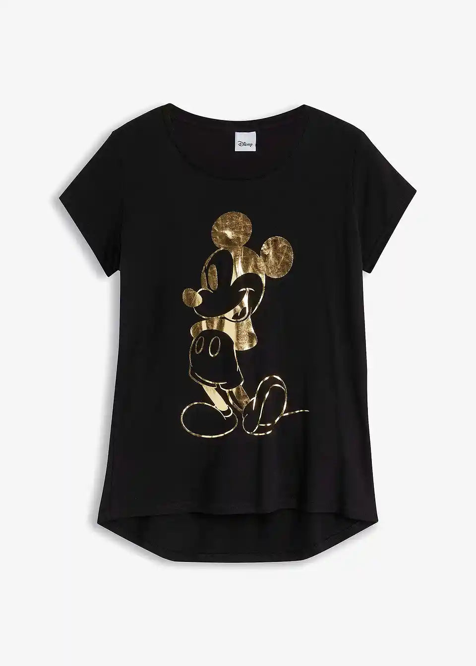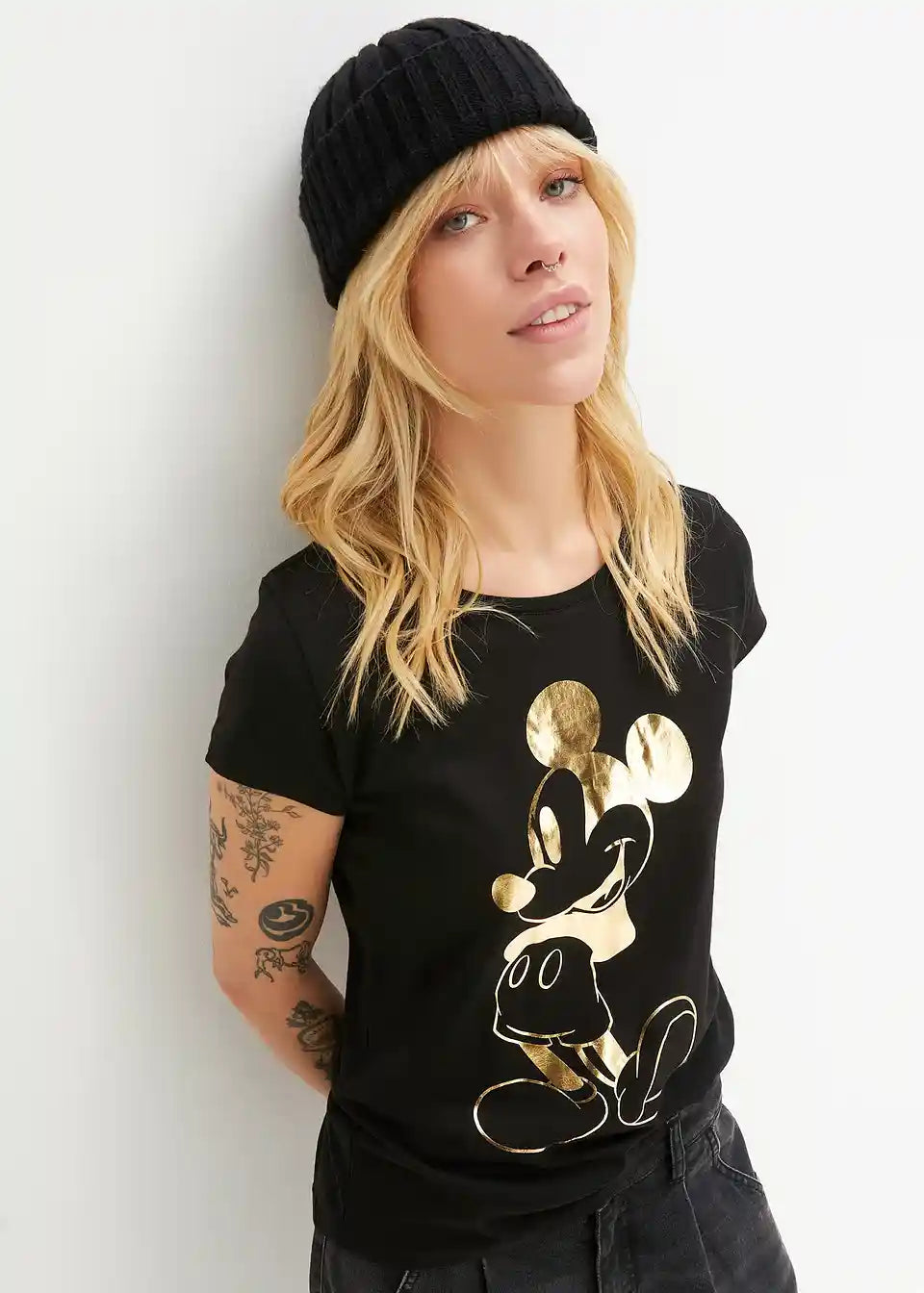 Majica s kovinskim sijajem in potiskom v slogu Mickey Mouse prinaša stilski pridih. Z lahkotnim krojem in kratkimi T-shirt rokavi je top vsestranski in primeren za športne ali zabavne kombinacije. Velik sprednji potisk je modni poudarek, zaradi katerega bo ta Disney majica postala priljubljen modni kos te sezone. Mickey Mouse majica izgleda odlično s krilom z modnim čipkastim vložkom in čevlji Peeptoes.