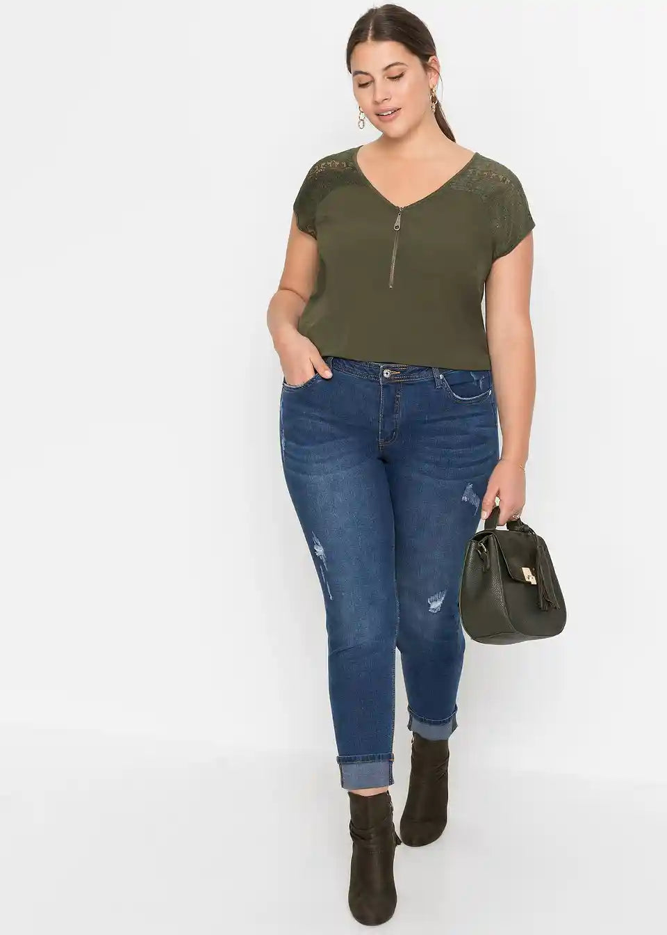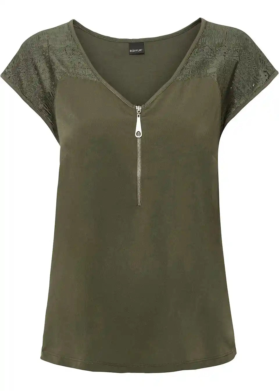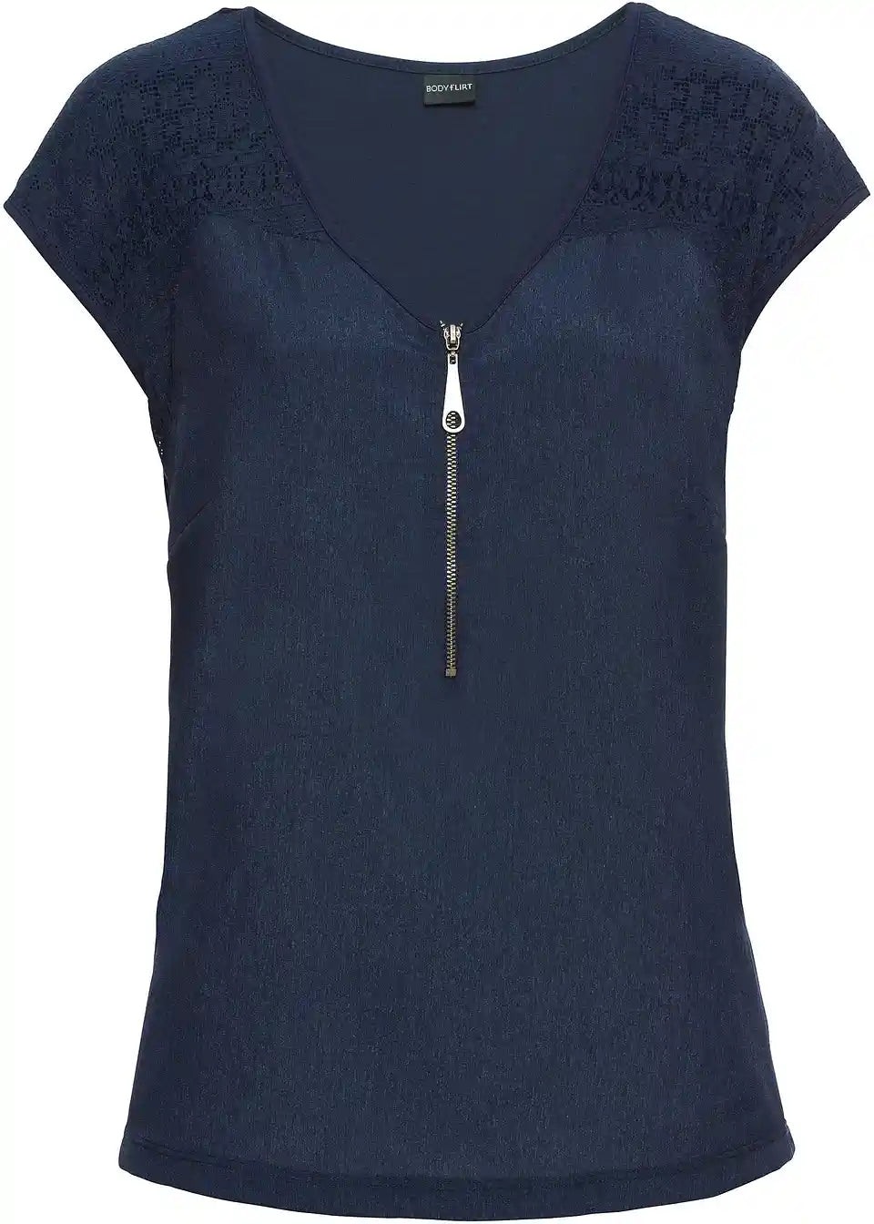 Prefinjeni detajli dajejo tej majici znamke BODYFLIRT poseben pridih. Romantičen pridih dobi majica s kratkimi rokavi zaradi čipkastih vložkov na področju ramen. Druga zanimivost je zadrga na V-izrezu, ki lepo poudarja dekolte. Majica s čipkastim vložkom je vsestransko kombinirana in se čudovito prilega kratkim hlačam, kapri hlačam ali kavbojkam z učinkom obrabe.