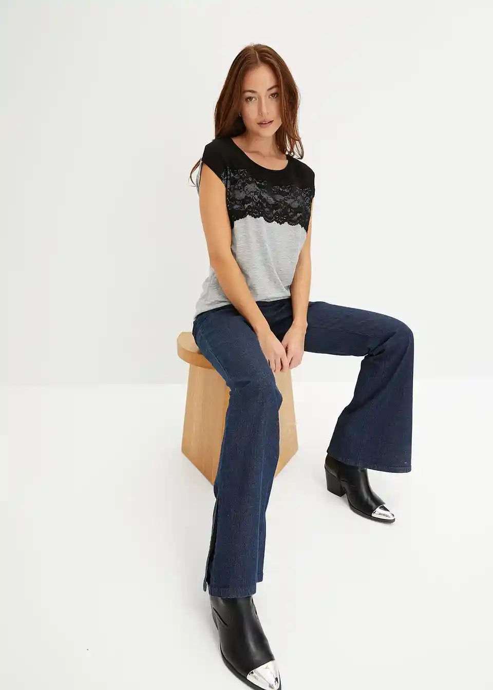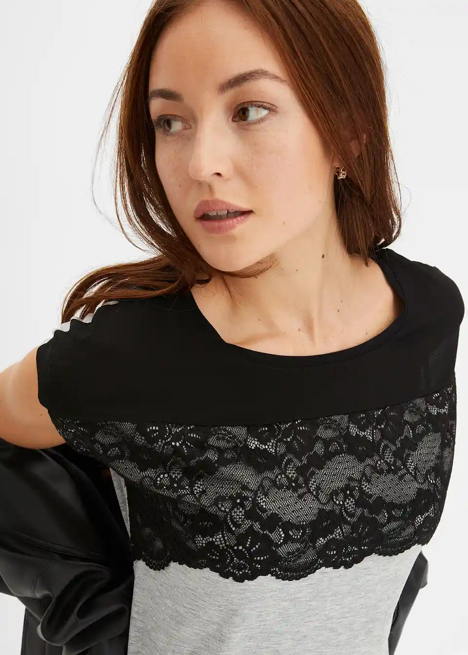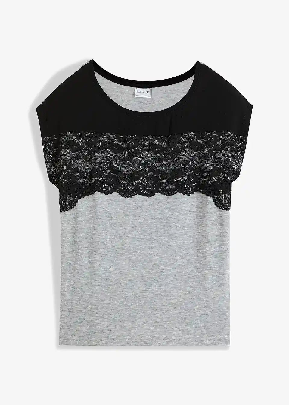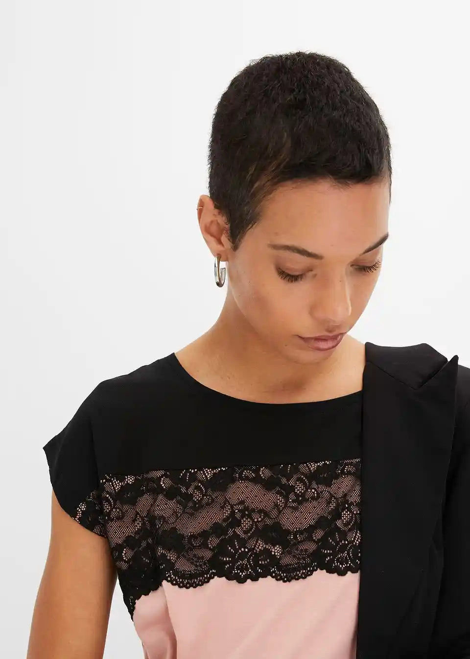 Moderna z romantičnim pridihom se predstavlja ta majica s čipko iz kolekcije BODYFLIRT. Nežna čipkasta aplikacija na sprednjem delu na okrasnem šivu daje majici dolžine do bokov in z okroglim izrezom poseben čar. Zadnja stran modela s kratkimi prekrivnimi rokavi je preprosta. Zaradi sproščenega, a ne preveč širokega kroja in rahlo zaobljenega spodnjega roba zadaj majica lepo pade.
