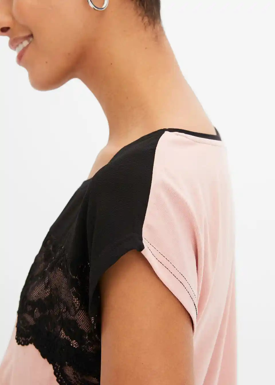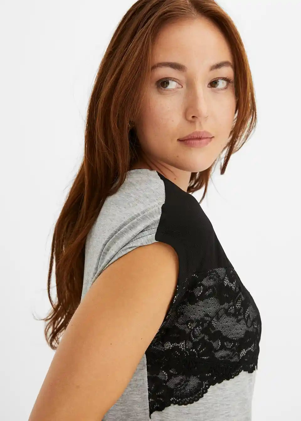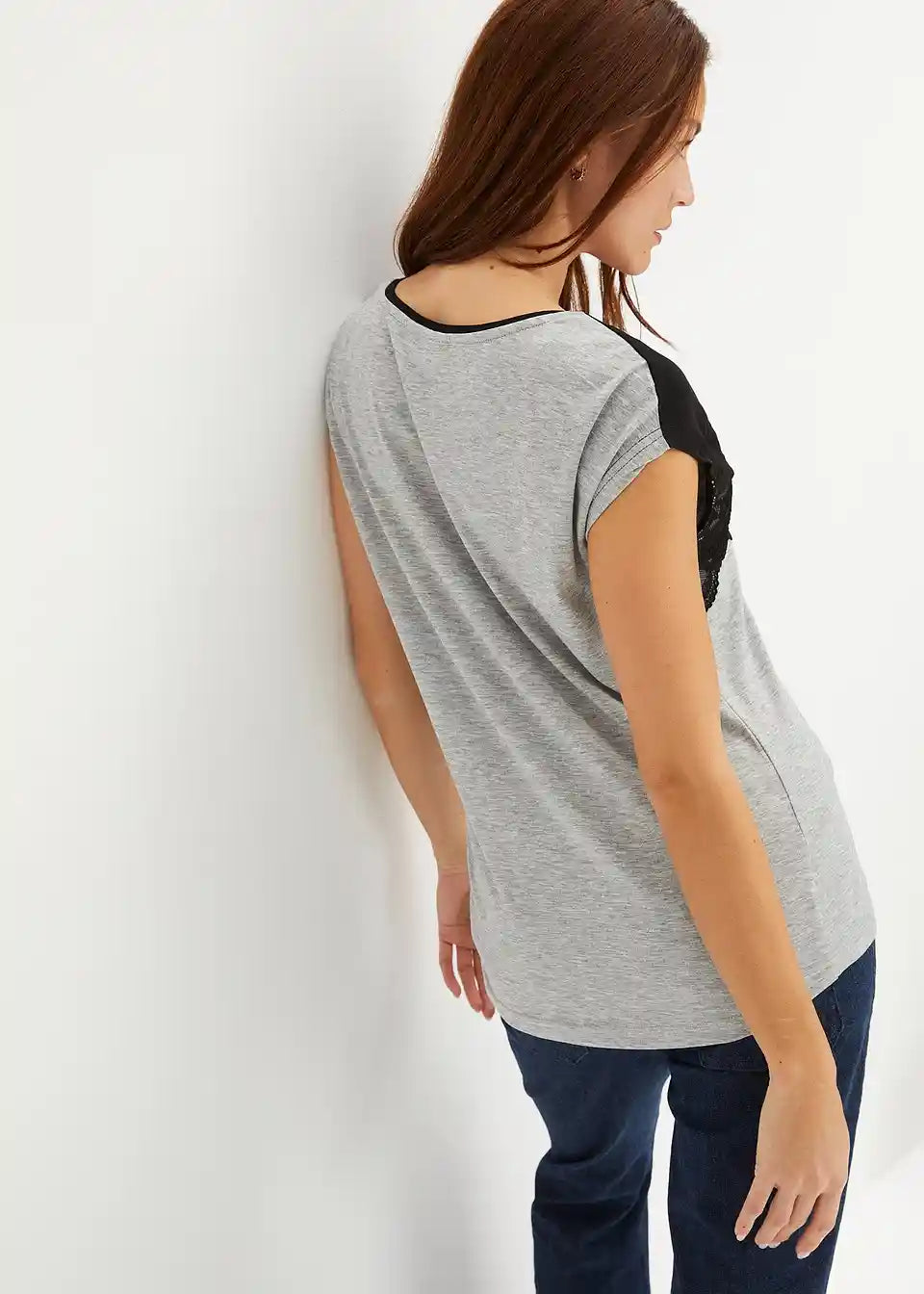 Moderna z romantičnim pridihom se predstavlja ta majica s čipko iz kolekcije BODYFLIRT. Nežna čipkasta aplikacija na sprednjem delu na okrasnem šivu daje majici dolžine do bokov in z okroglim izrezom poseben čar. Zadnja stran modela s kratkimi prekrivnimi rokavi je preprosta. Zaradi sproščenega, a ne preveč širokega kroja in rahlo zaobljenega spodnjega roba zadaj majica lepo pade.