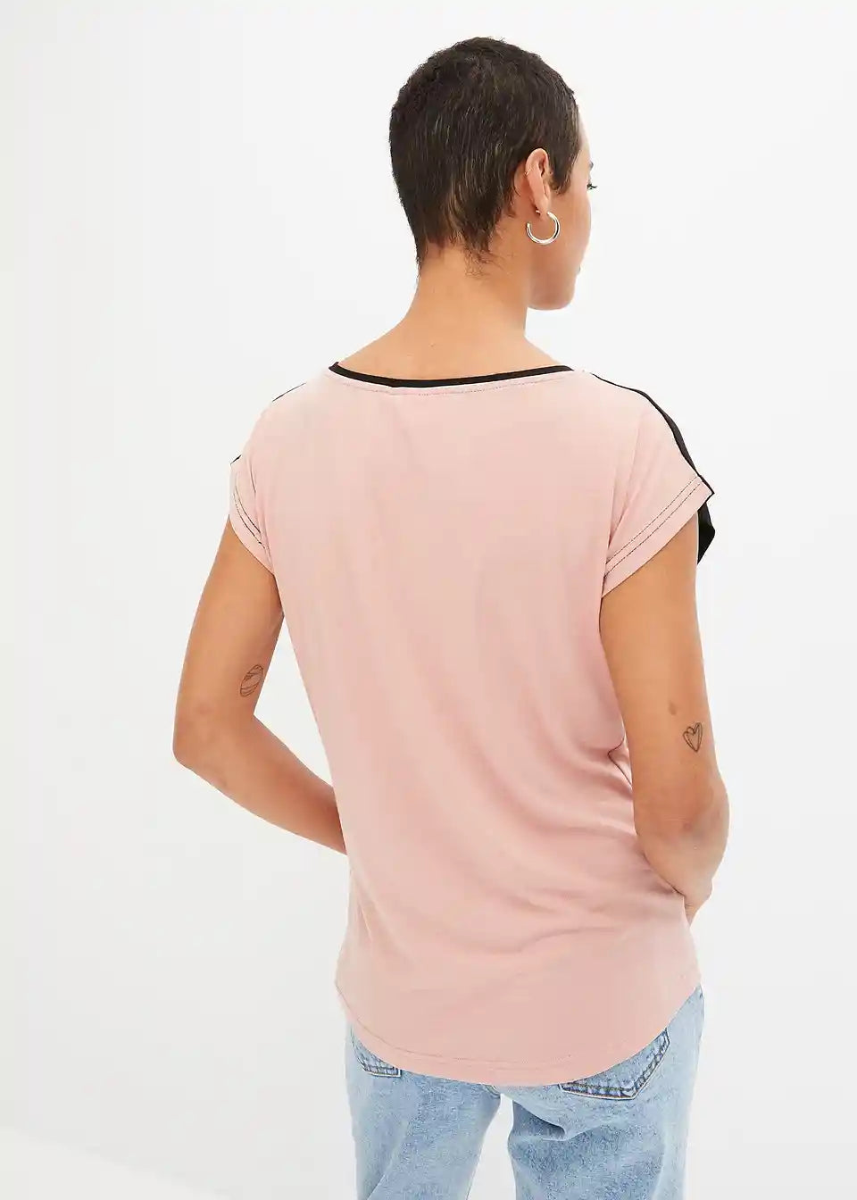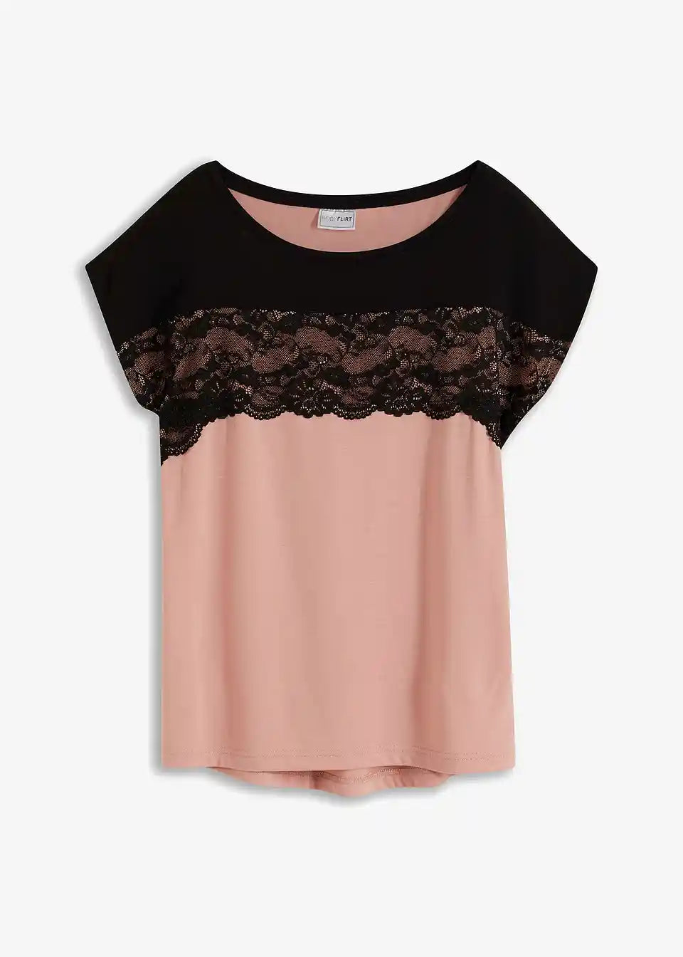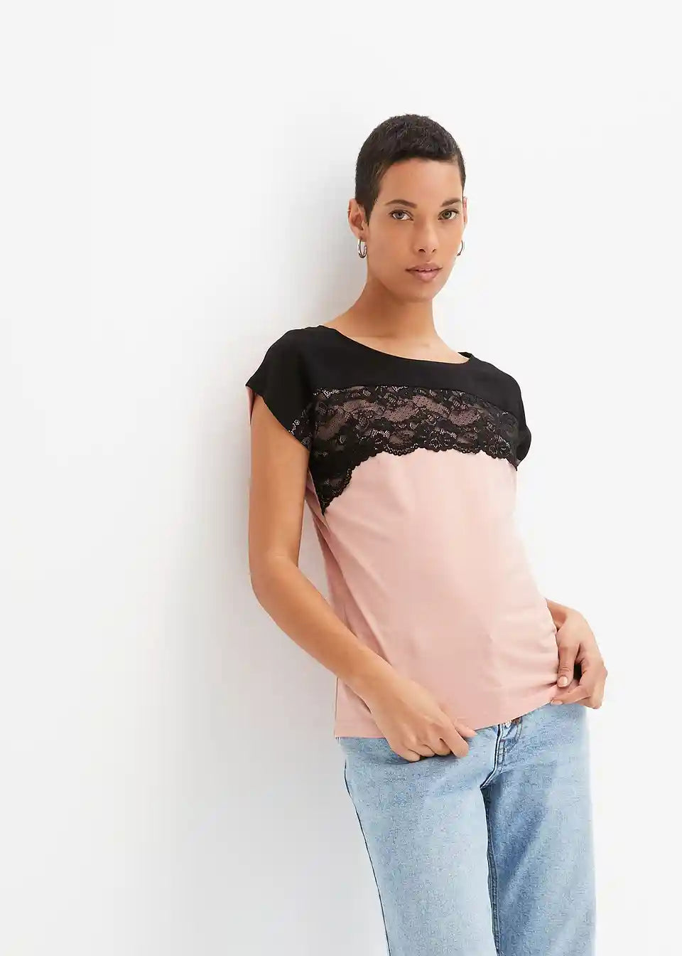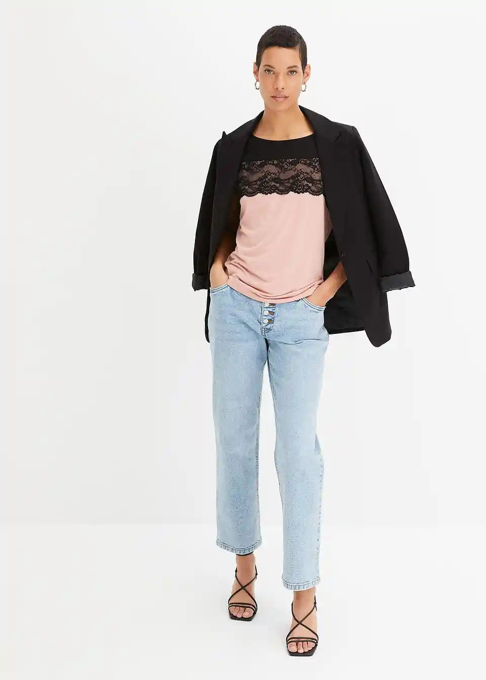 Moderna z romantičnim pridihom se predstavlja ta majica s čipko iz kolekcije BODYFLIRT. Nežna čipkasta aplikacija na sprednjem delu na okrasnem šivu daje majici dolžine do bokov in z okroglim izrezom poseben čar. Zadnja stran modela s kratkimi prekrivnimi rokavi je preprosta. Zaradi sproščenega, a ne preveč širokega kroja in rahlo zaobljenega spodnjega roba zadaj majica lepo pade.