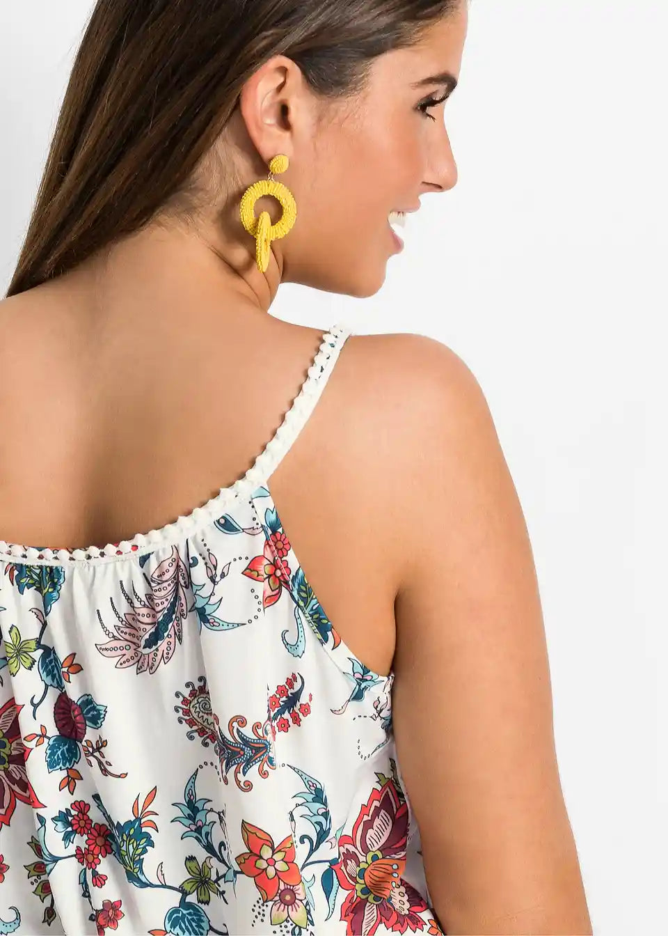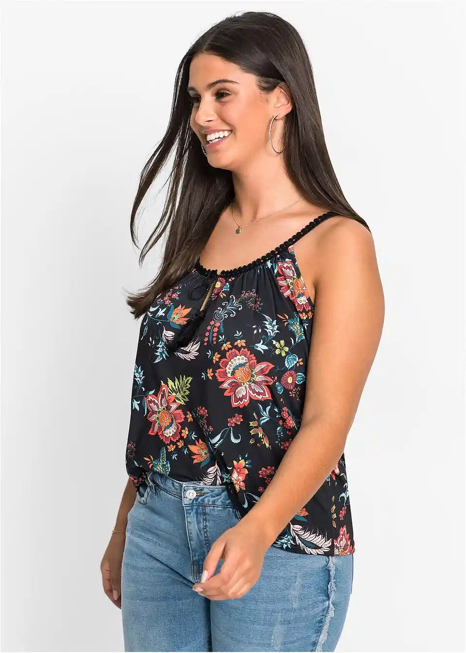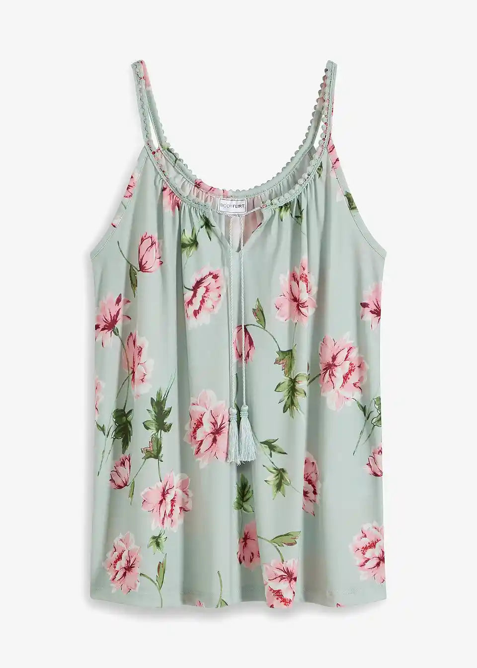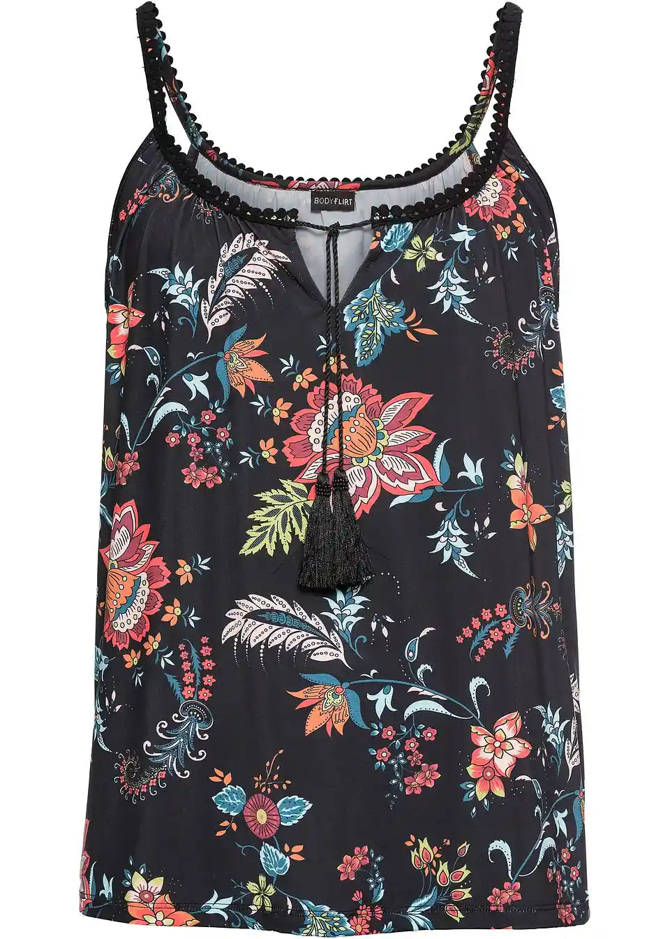 Zaradi materiala, ki mehko pade, in cvetličnih potiskanih motivov deluje jersey majica s cvetličnim potiskom znamke BODYFLIRT še posebej romantično. Ohlapen kroj zagotavlja kroj, ki laskavo objame postavo in poudarja prednosti. Atraktiven model navdušuje s širokim okroglim izrezom s kratko režo. Poudarki so ozki naramnice, okrašene z nežno čipkasto obrobo. Zavezovanje z velikimi cofki na izrezu doda igriv pridih.