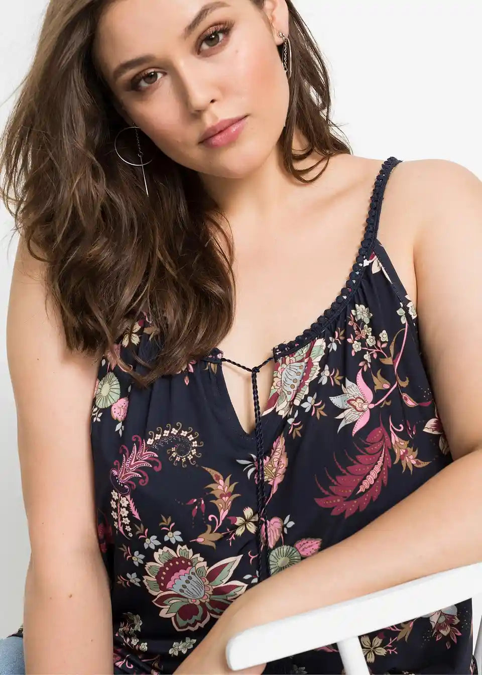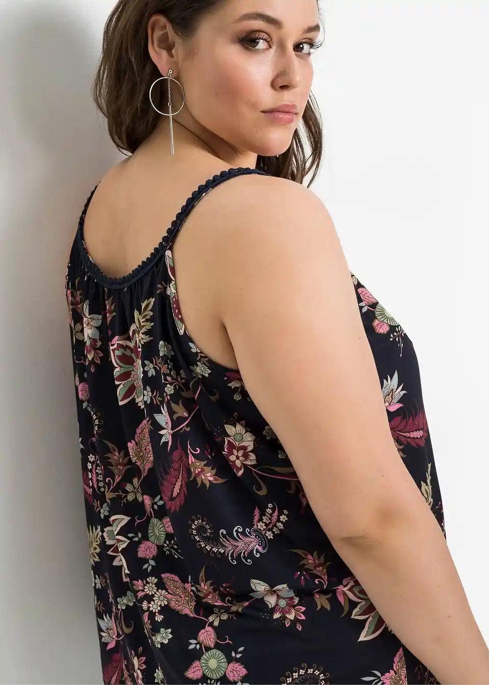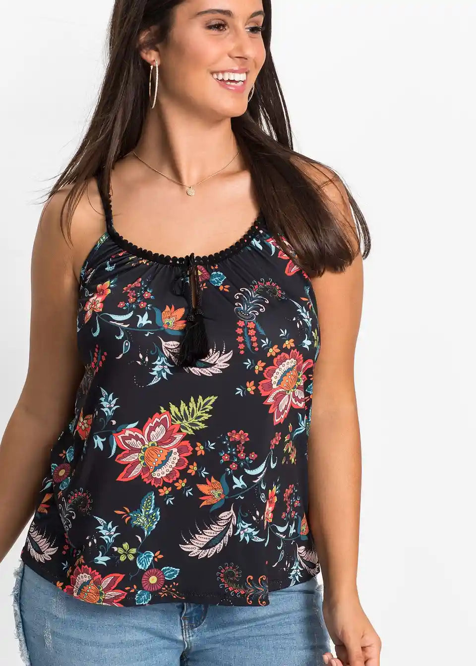 Zaradi materiala, ki mehko pade, in cvetličnih potiskanih motivov deluje jersey majica s cvetličnim potiskom znamke BODYFLIRT še posebej romantično. Ohlapen kroj zagotavlja kroj, ki laskavo objame postavo in poudarja prednosti. Atraktiven model navdušuje s širokim okroglim izrezom s kratko režo. Poudarki so ozki naramnice, okrašene z nežno čipkasto obrobo. Zavezovanje z velikimi cofki na izrezu doda igriv pridih.