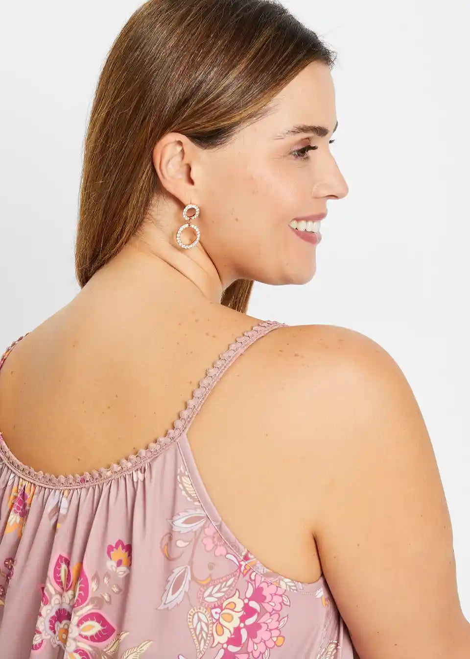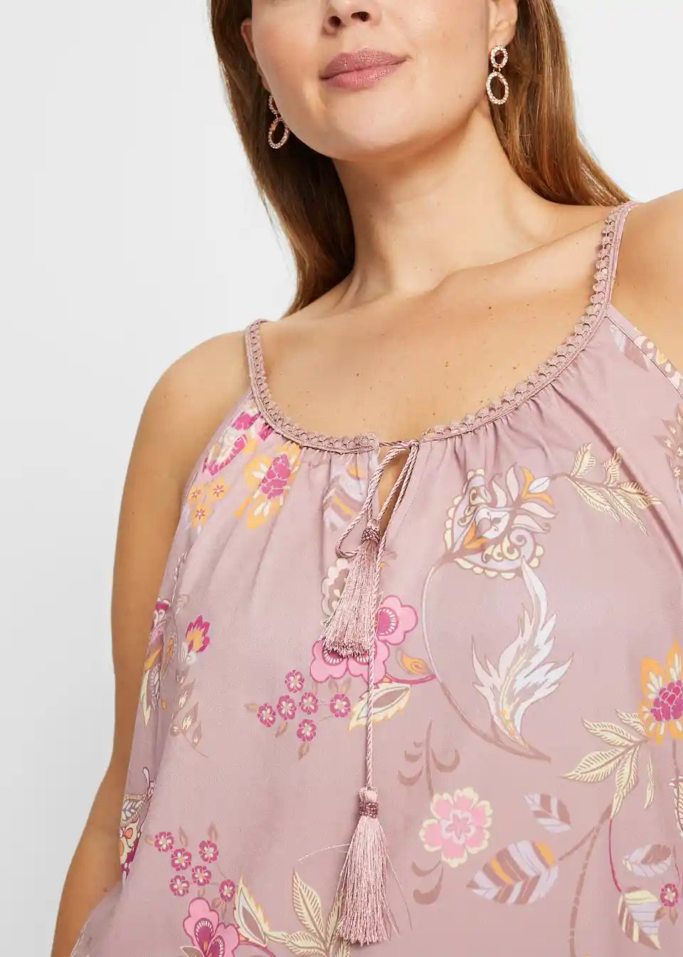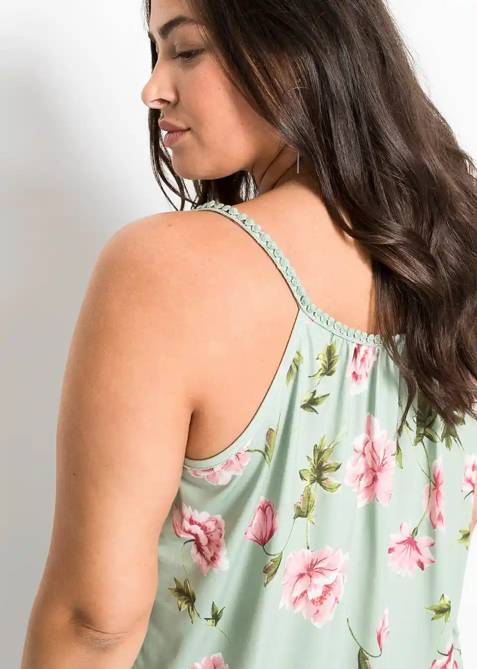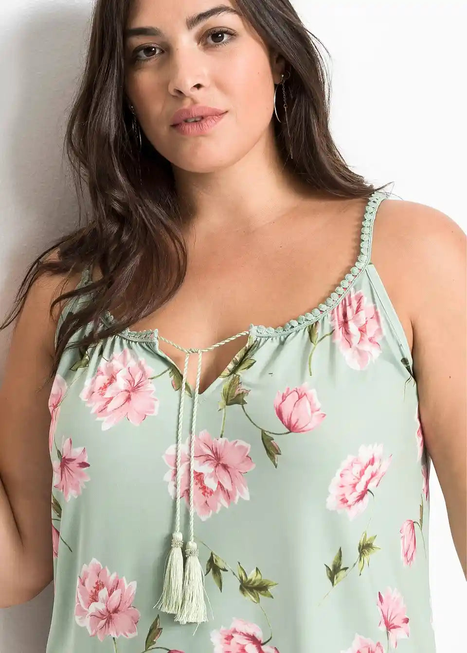 Zaradi materiala, ki mehko pade, in cvetličnih potiskanih motivov deluje jersey majica s cvetličnim potiskom znamke BODYFLIRT še posebej romantično. Ohlapen kroj zagotavlja kroj, ki laskavo objame postavo in poudarja prednosti. Atraktiven model navdušuje s širokim okroglim izrezom s kratko režo. Poudarki so ozki naramnice, okrašene z nežno čipkasto obrobo. Zavezovanje z velikimi cofki na izrezu doda igriv pridih.
