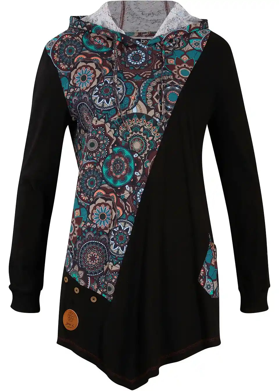 Majica s Kapuco z Asimetričnim Robom in Patchwork Videzom, dolgi rokavi