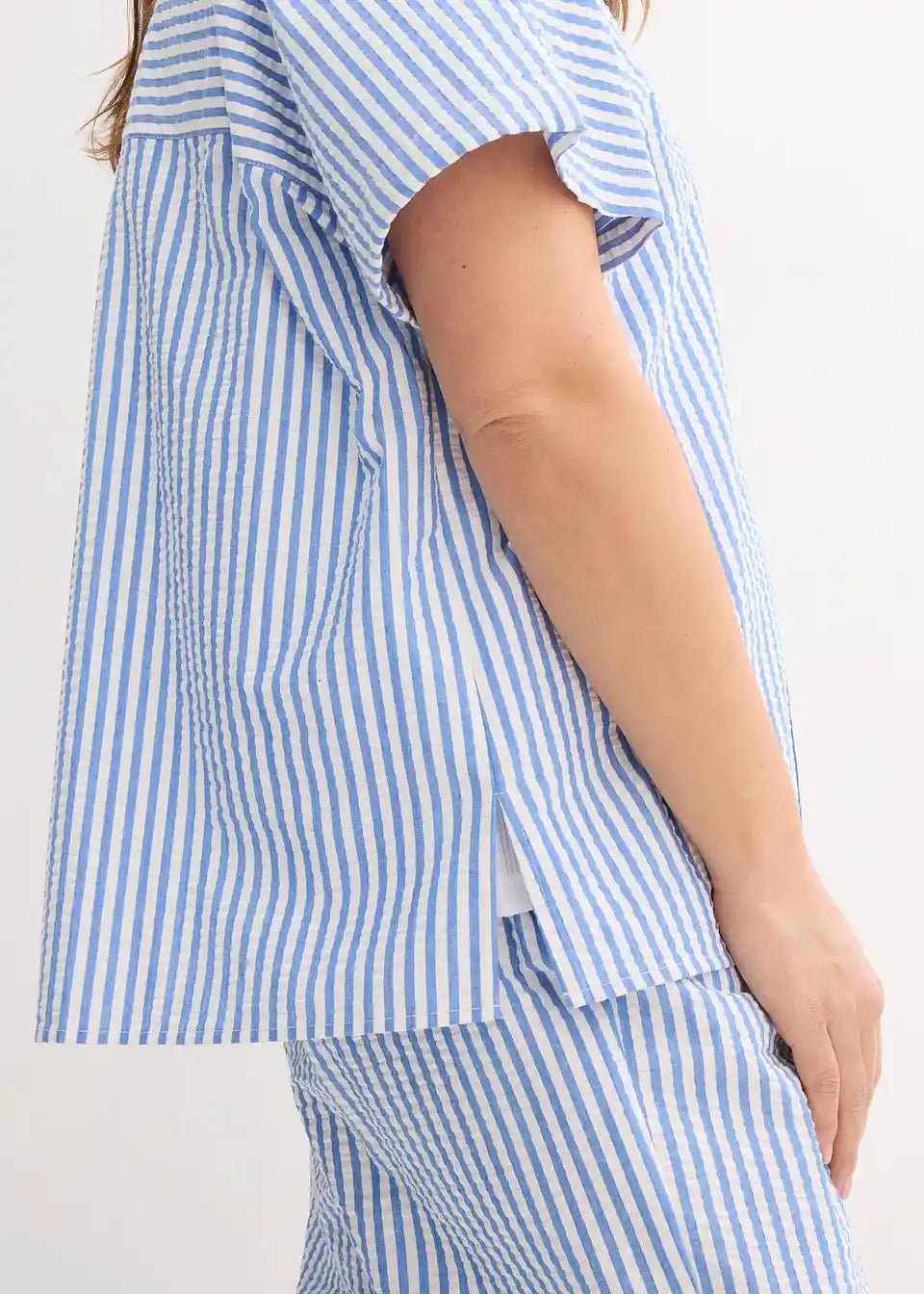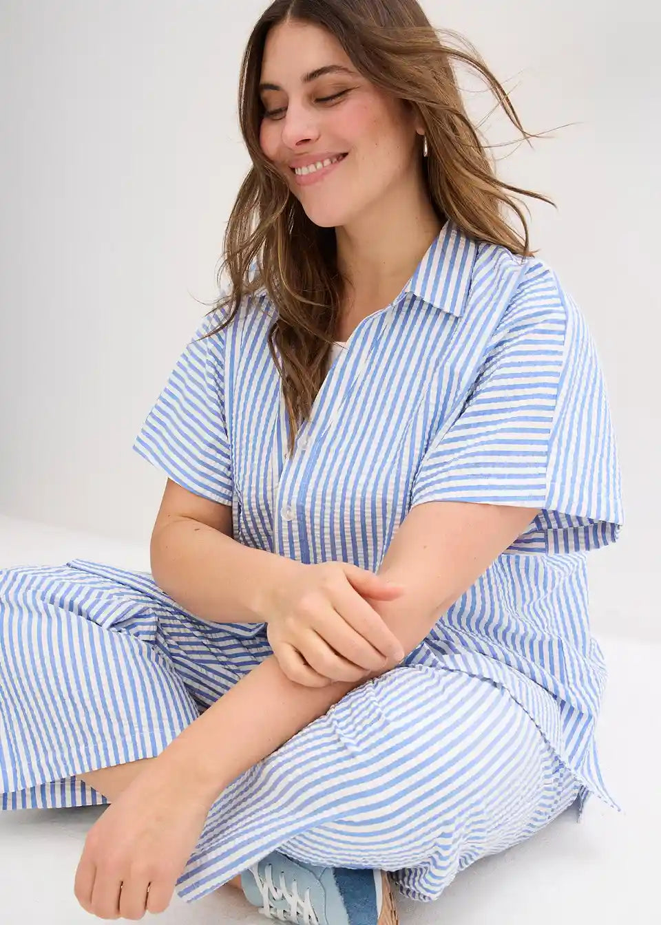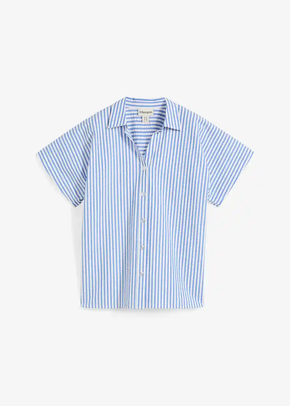 Majica s kratkimi rokavi iz lahkega strukturiranega materiala z gumbi. Ohlapen kroj.