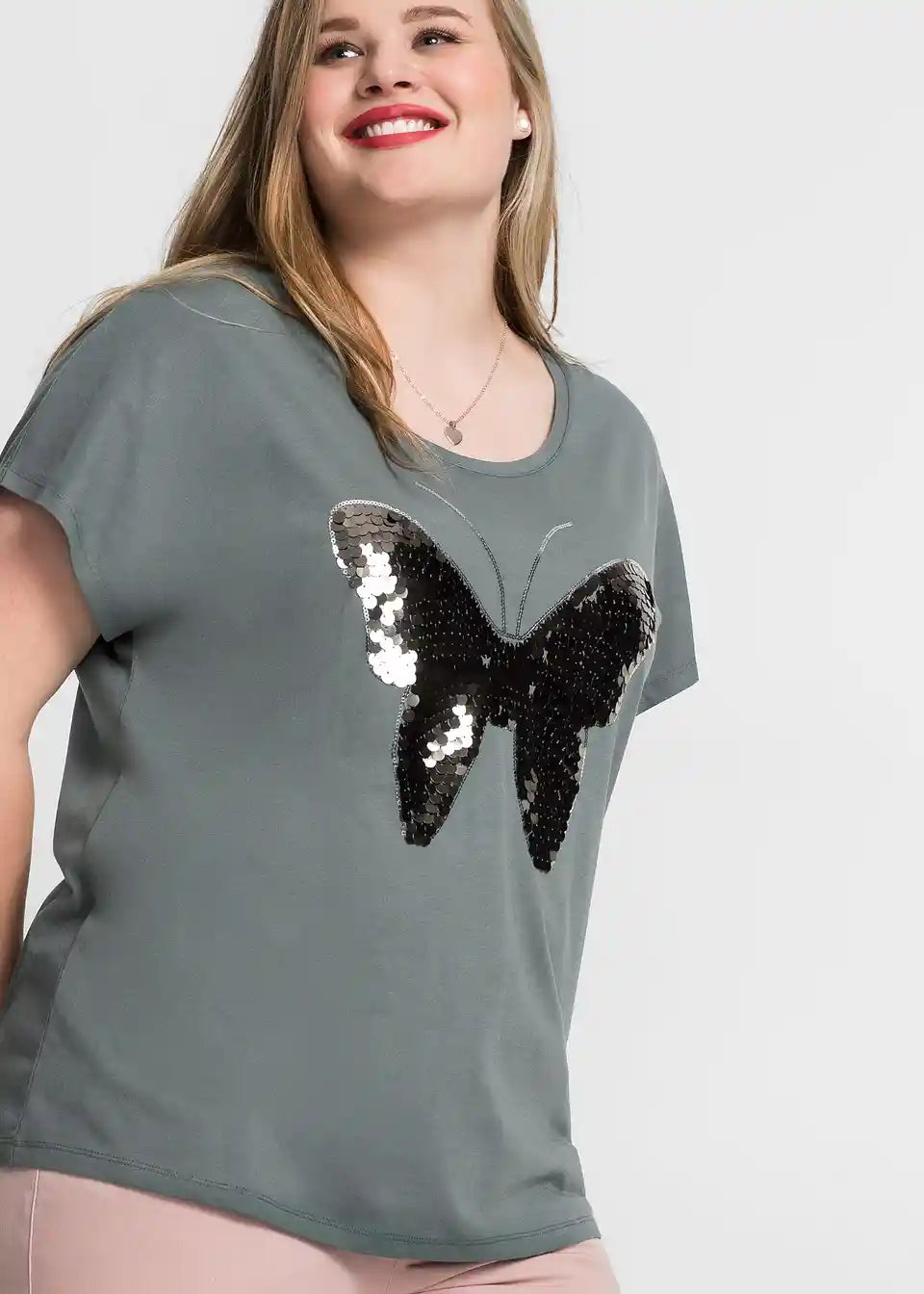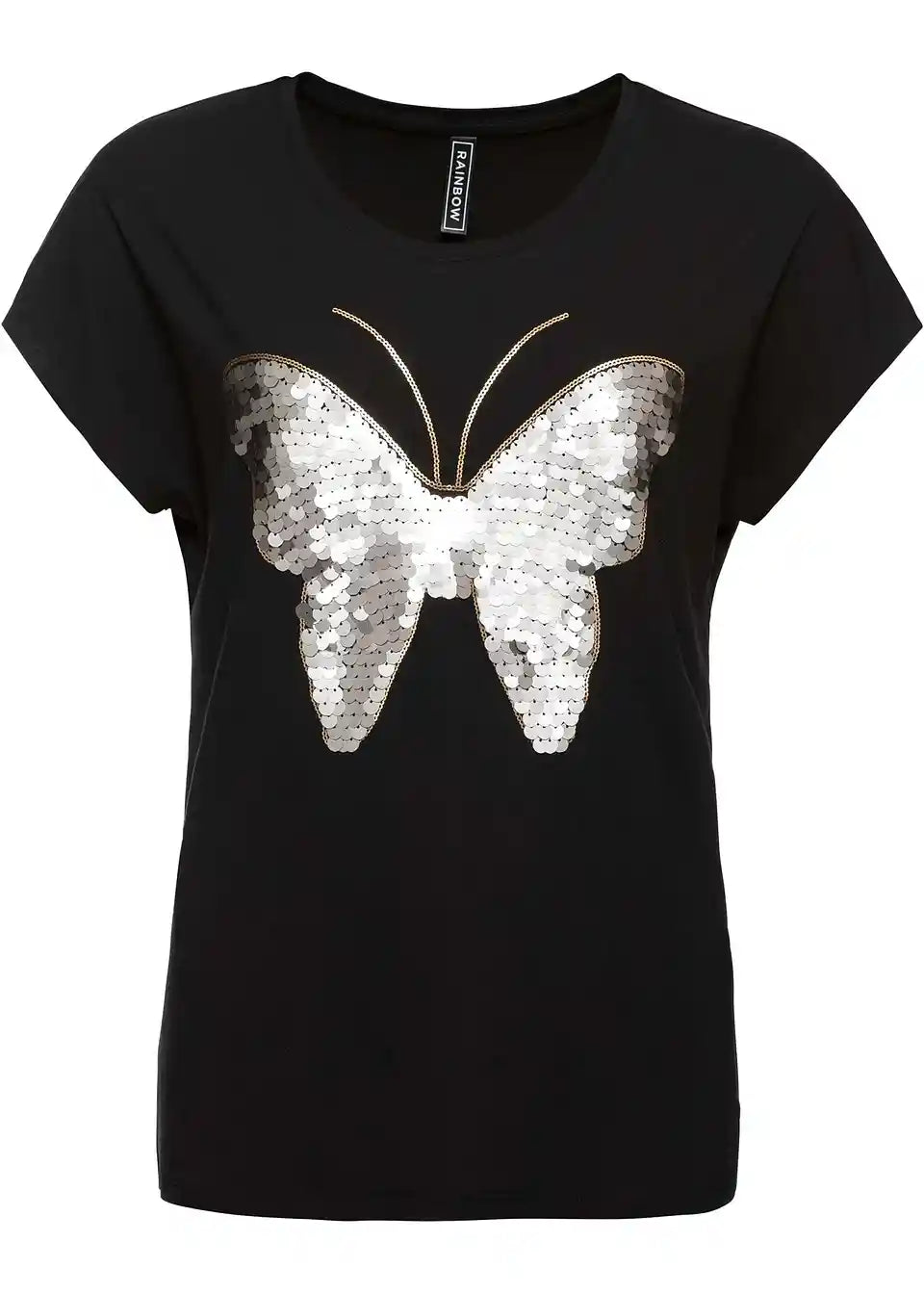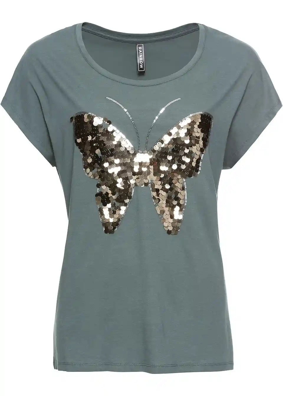 Ta modna majica s pailletami je igrivo živahna. Model s kratkimi rokavi izstopa predvsem zaradi velikega metulja iz paillet na sprednji strani. Ta kul motiv naredi zgornji del z okroglim izrezom in netopirskimi rokavi nekaj posebnega ter popestri tudi preproste vsakodnevne outfite.