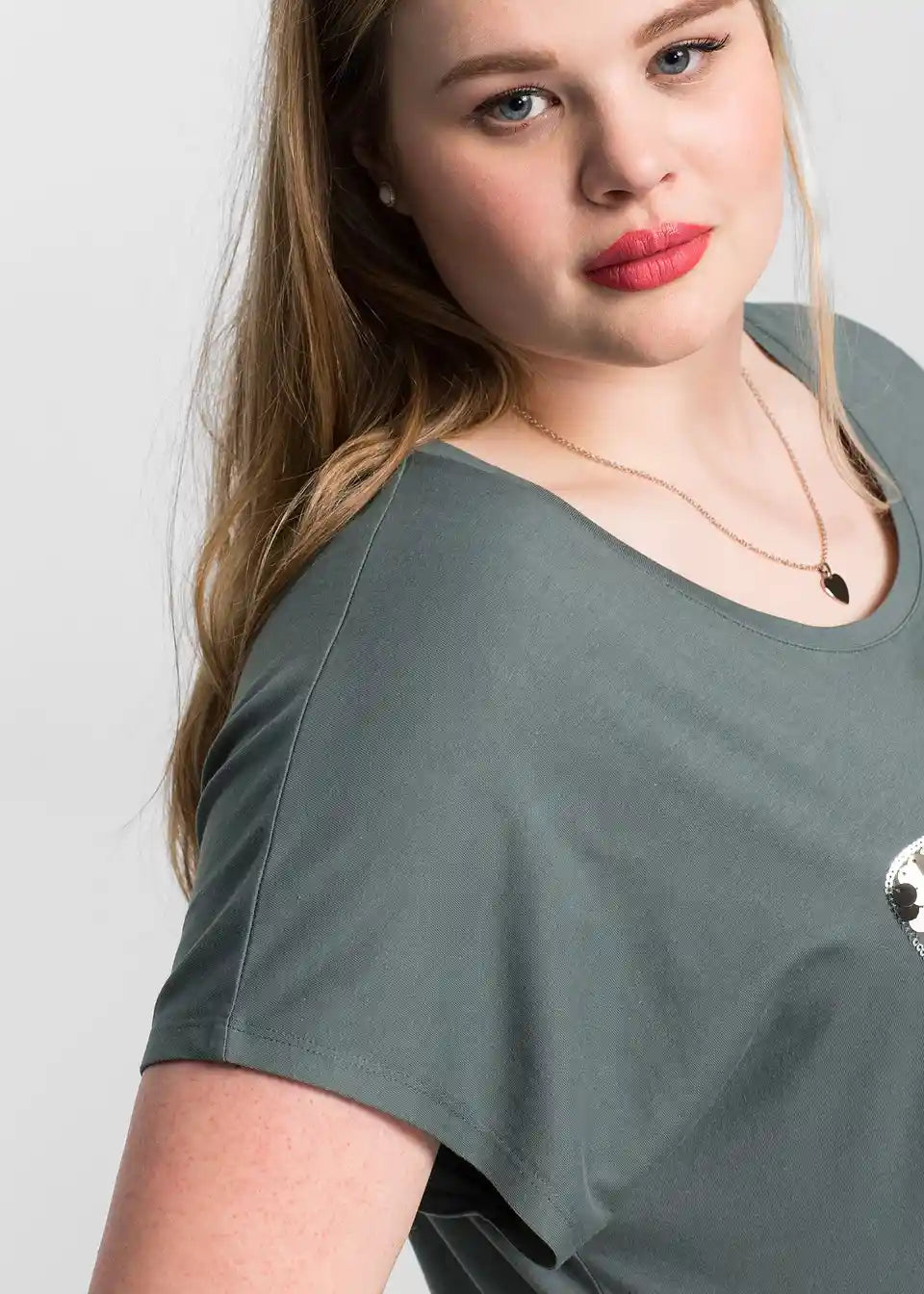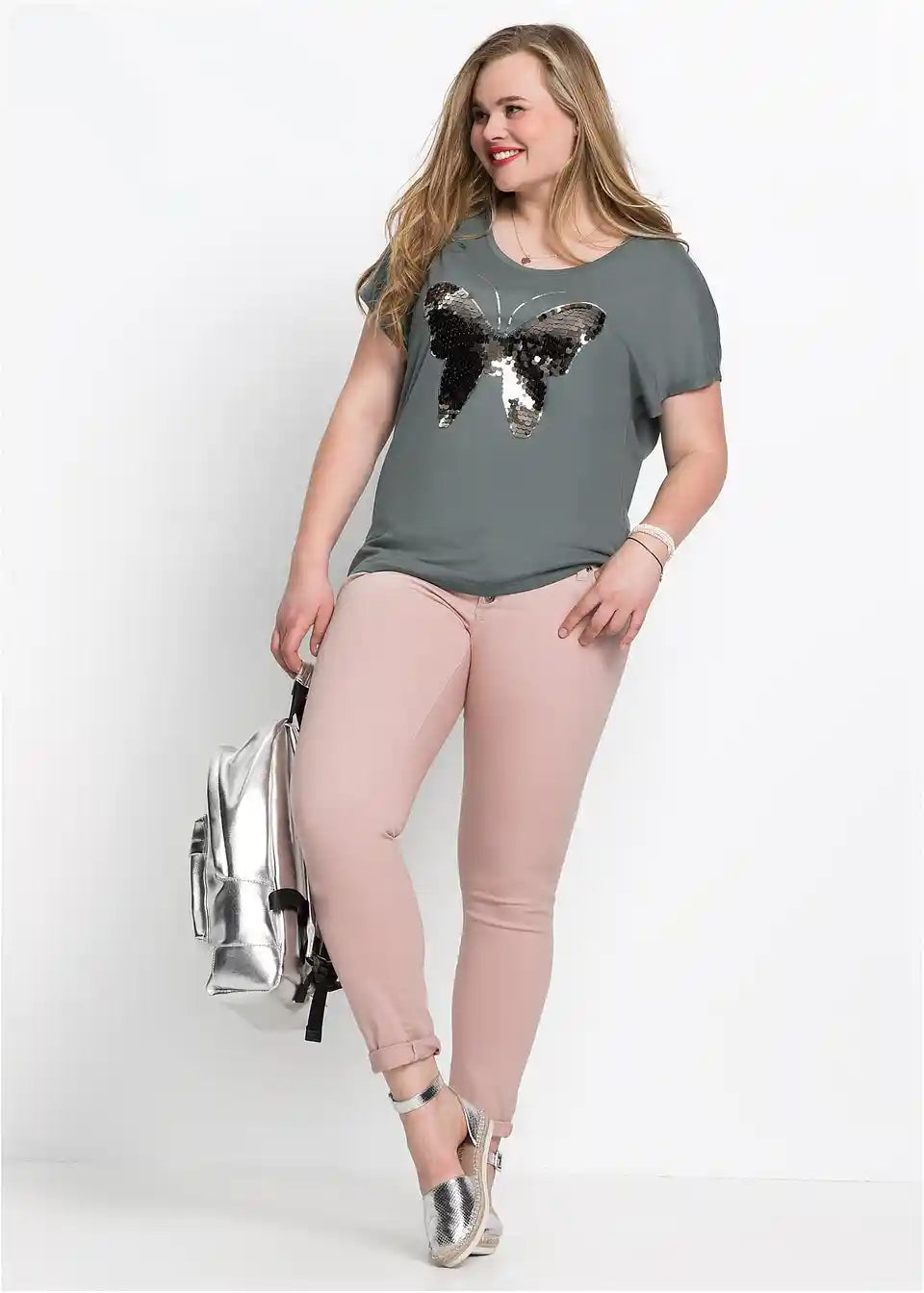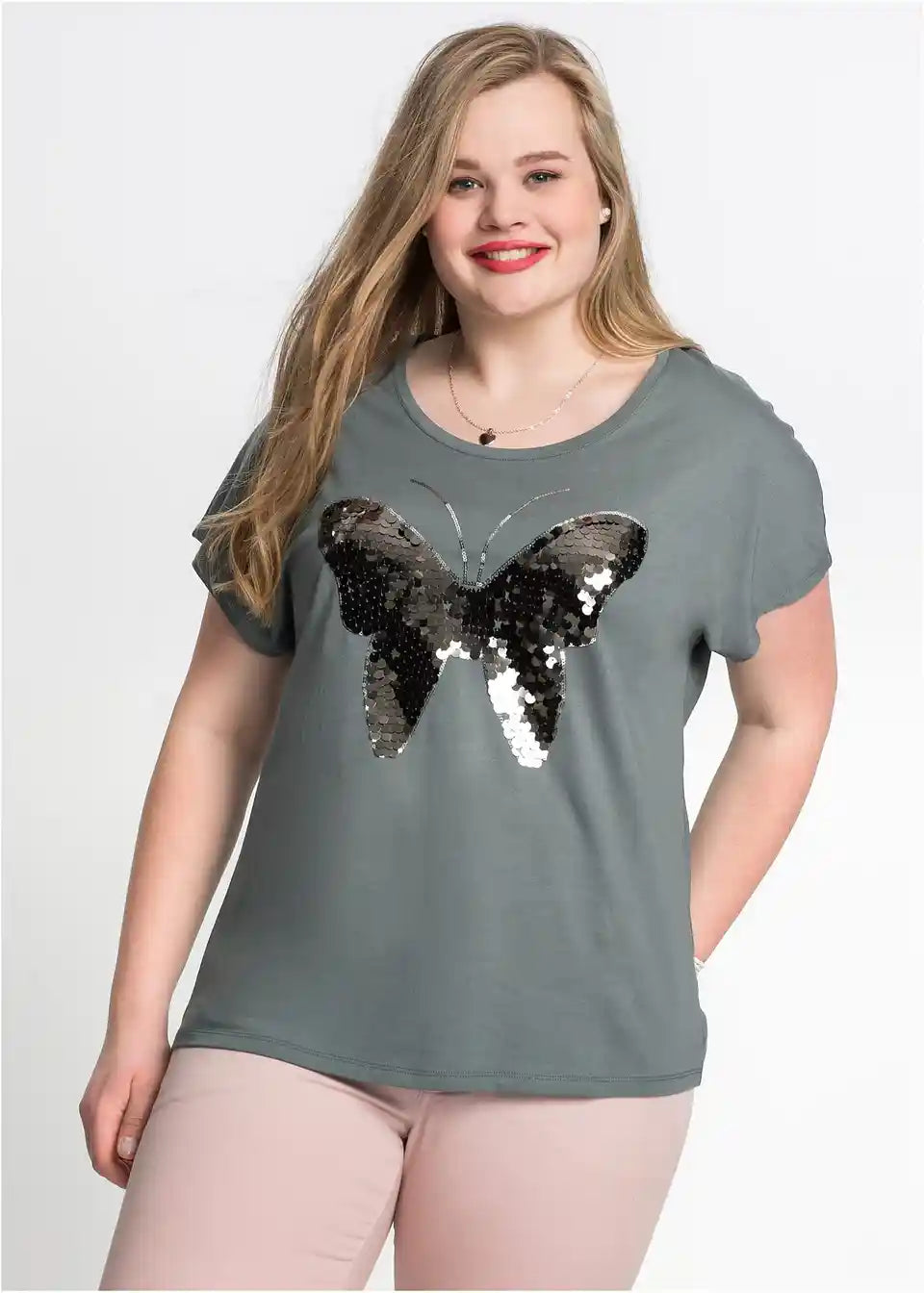 Ta modna majica s pailletami je igrivo živahna. Model s kratkimi rokavi izstopa predvsem zaradi velikega metulja iz paillet na sprednji strani. Ta kul motiv naredi zgornji del z okroglim izrezom in netopirskimi rokavi nekaj posebnega ter popestri tudi preproste vsakodnevne outfite.