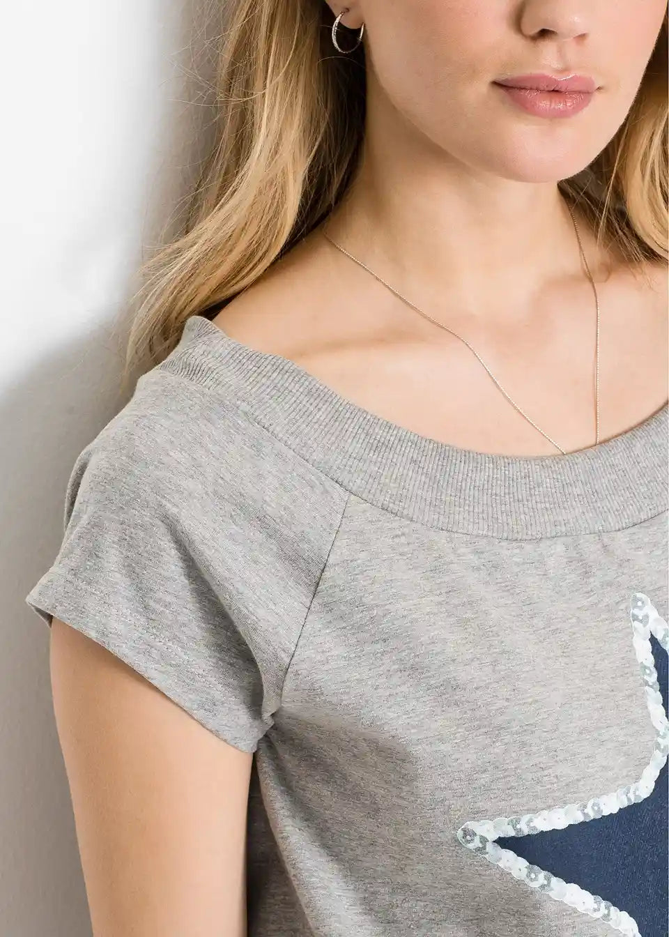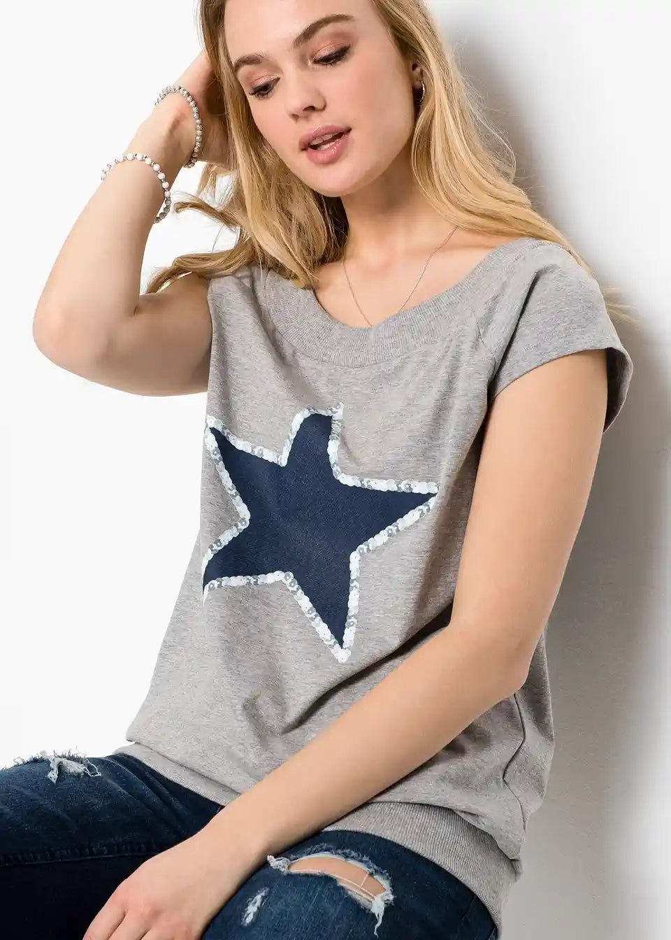 Majica, ki je navdihnjena z obliko puloverja, zagotavlja kul videz. Širok izrez v stilu čolna z rebrastim videzom se odlično ujema s priloženimi rokavi v raglan stilu. Elastičen raven rob je prav tako rebrast. Majica s potiskom zvezd navdušuje v kombinaciji z ozkimi kavbojkami ali pajkicami. Prav tako odlično izgleda s kratkimi hlačami ali mini krili.