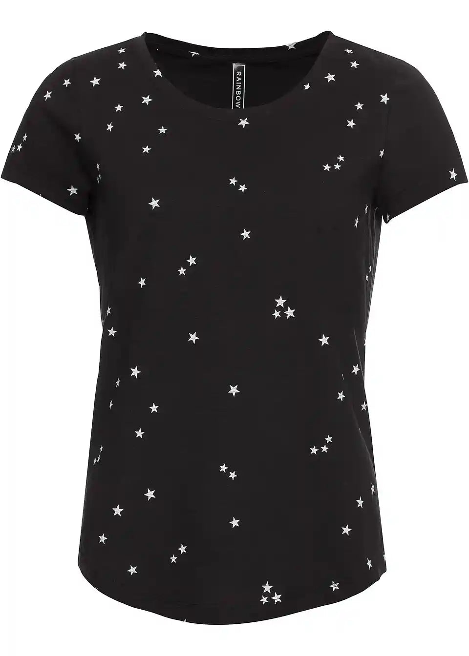 Ta modna majica ima vzorec iz majhnih zvezd. Za moderen videz je dolžina do bokov z okroglim izrezom in kratkimi rokavi ter rahlo zaobljenim robom. Trajnostno izdelana majica s zvezdami je idealna osnova za vsakdan in se odlično poda k sproščenim in stilskim outfitom.