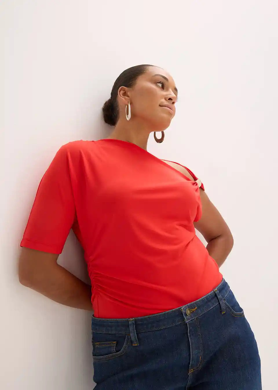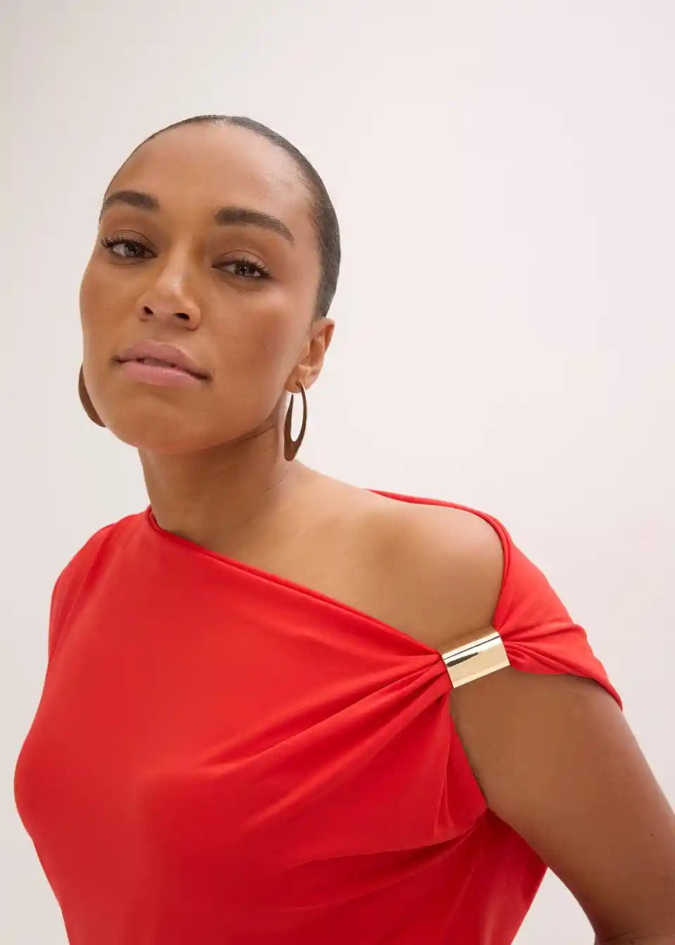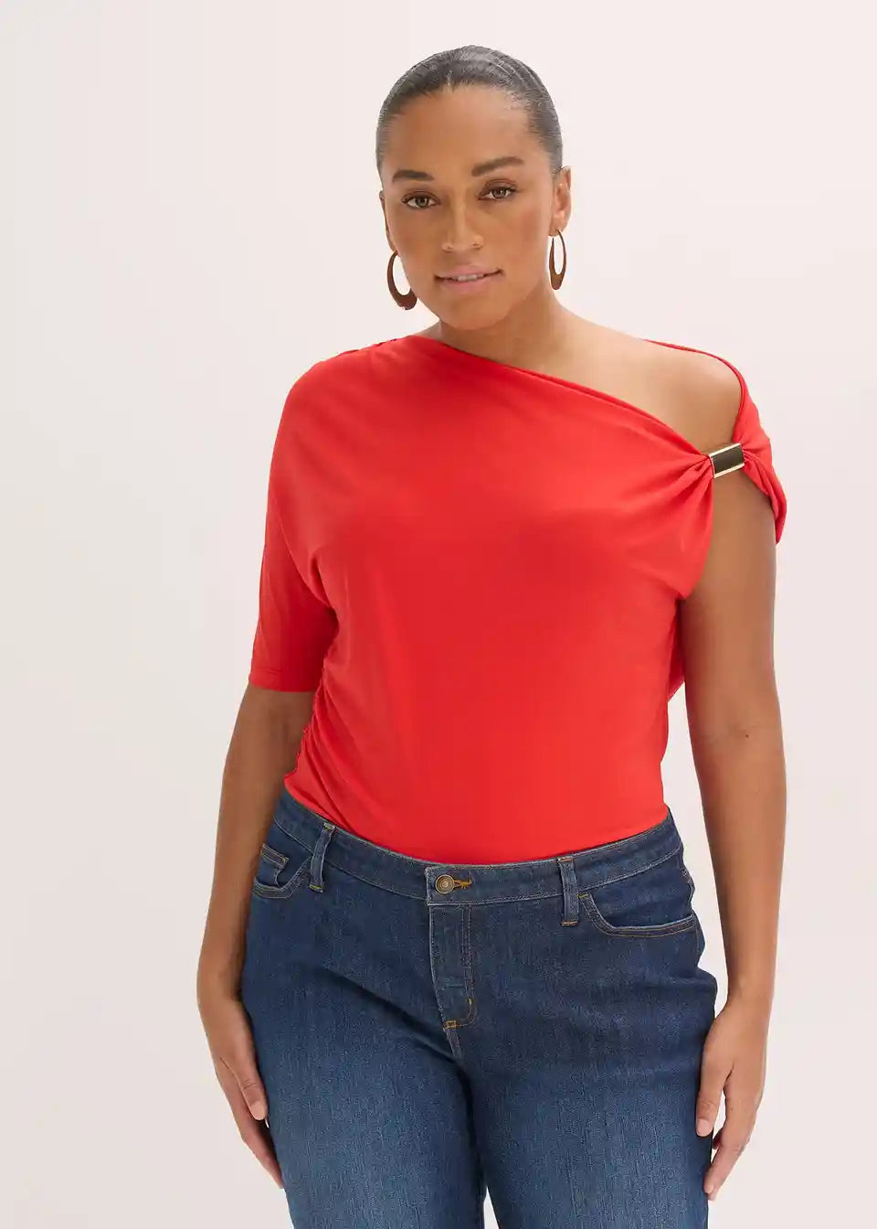 Majica z asimetričnim izrezom, naborki in kovinsko aplikacijo na ramah.