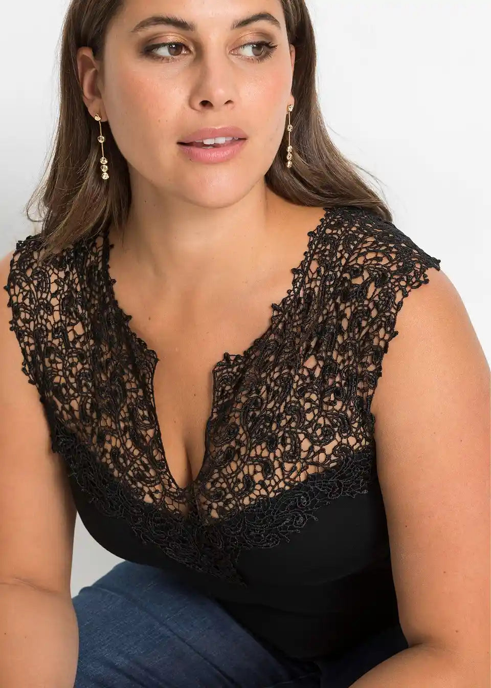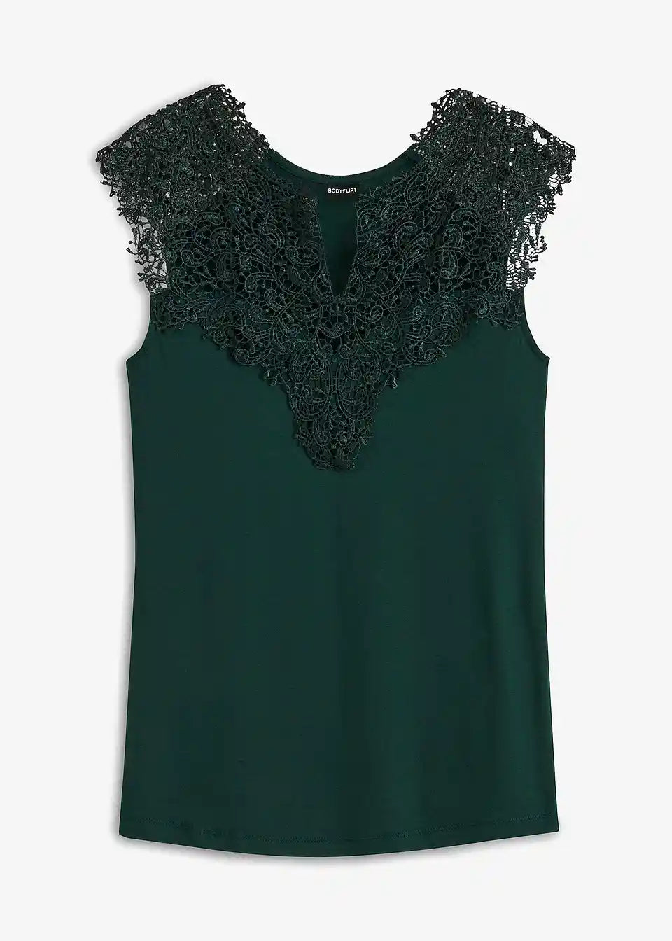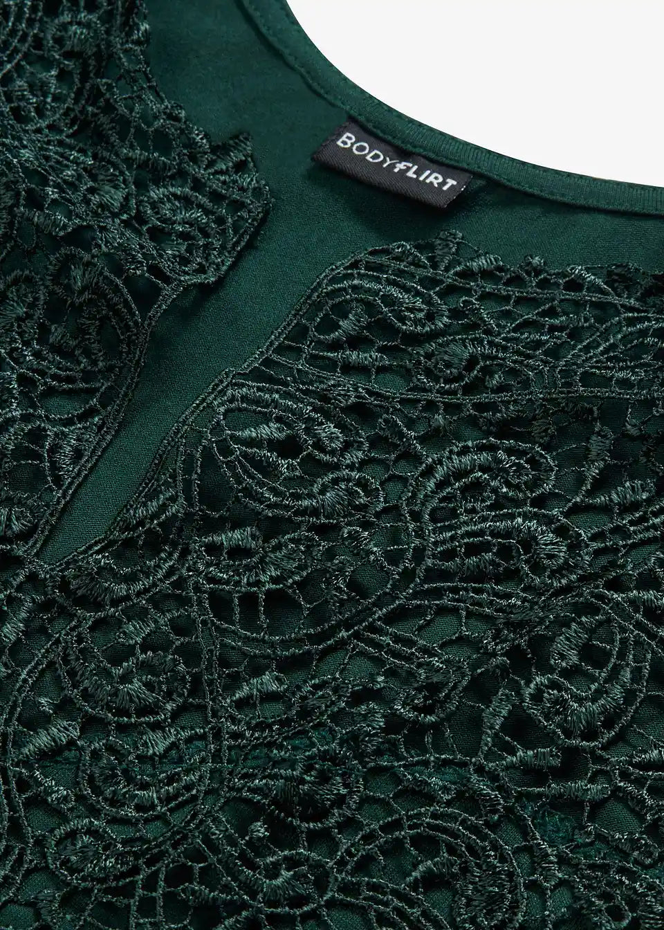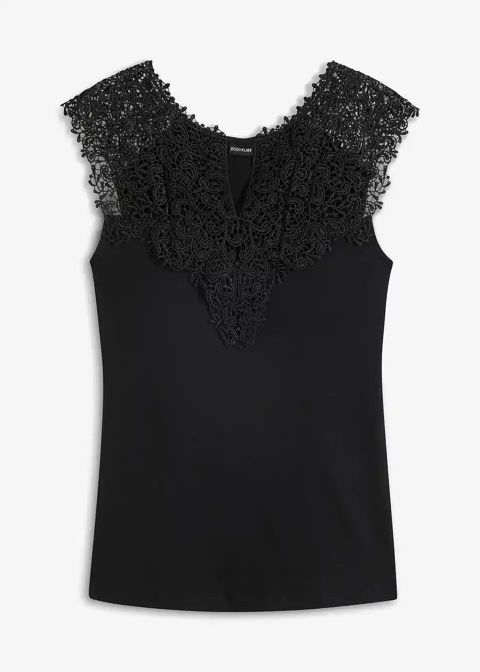 Ta postavo poudarjajoča majica se s čipkastimi detajli privlačno predstavi in daje zgornjemu delu ženstveno noto. Obilna čipkasta dekoracija obsega celotno področje ramen ter dekolteja. Zvečer majica z čipko znamke BODYFLIRT poskrbi za vtis v kombinaciji z legicami ali mini krilom iz imitacije usnja. Podnevi pa pride do izraza pod jopico ali prevelikim puloverjem z V-izrezom v hladnejših dneh.