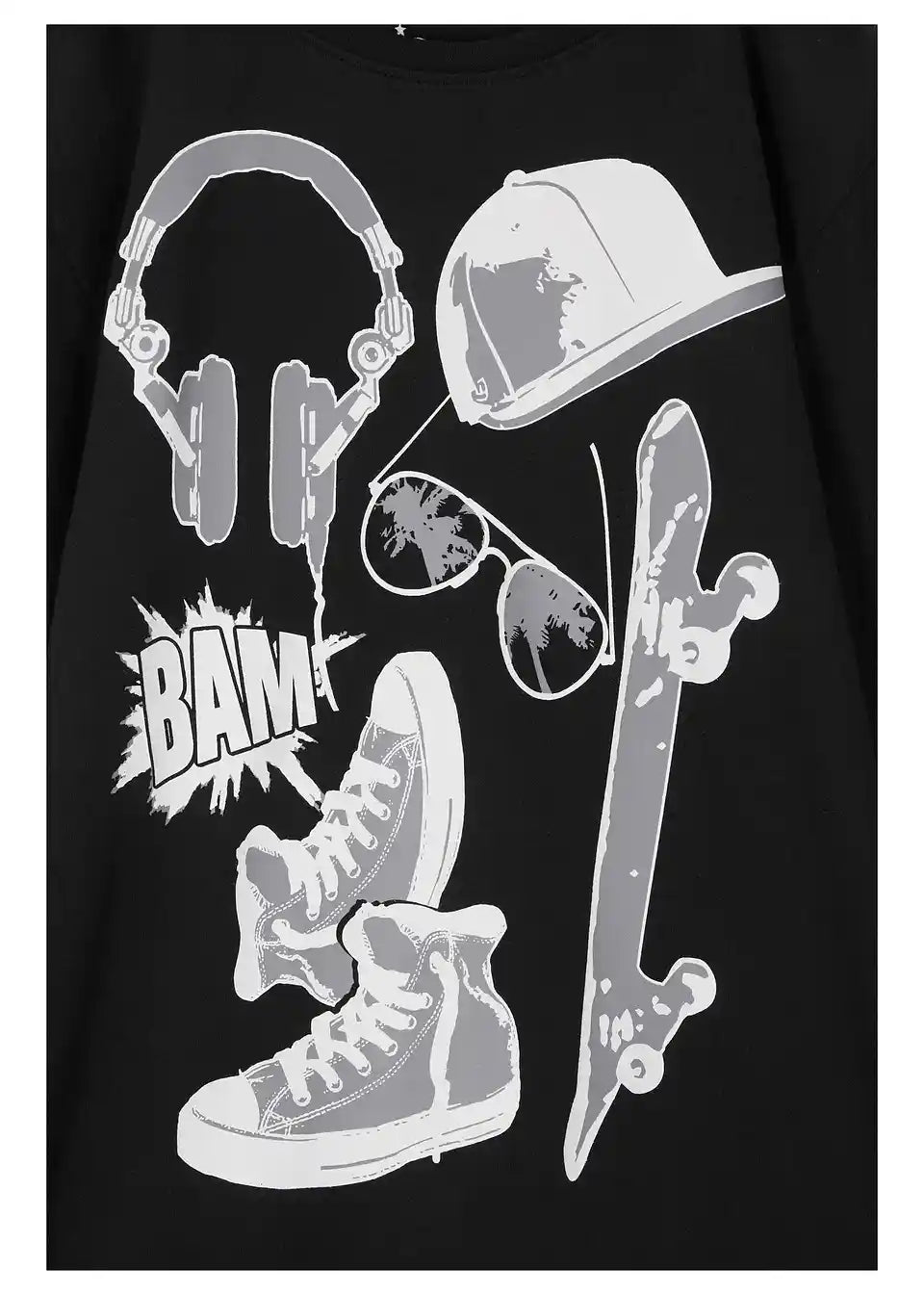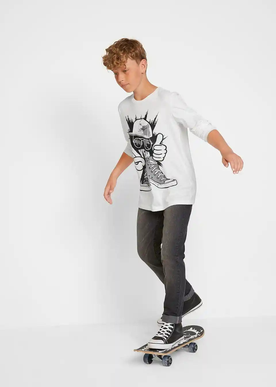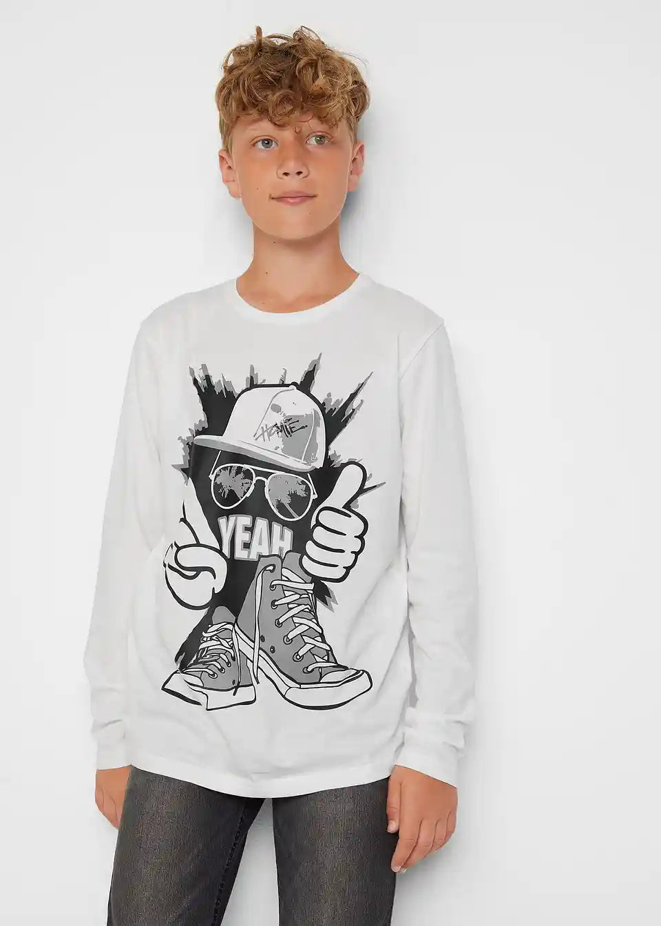 Ta sproščena majica z dolgimi rokavi zaradi svojega velikanskega tiska izstopa v šoli in vsakdanu. Kombinirana z jeans hlačami in modernimi supergami vsako obleko naredi privlačno.