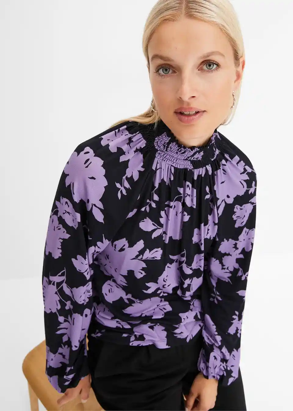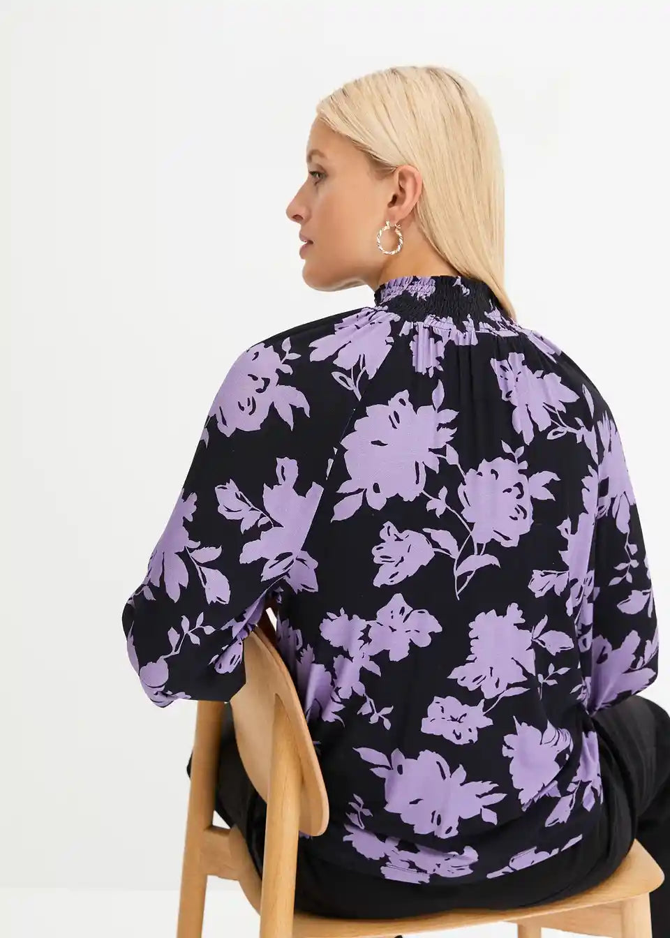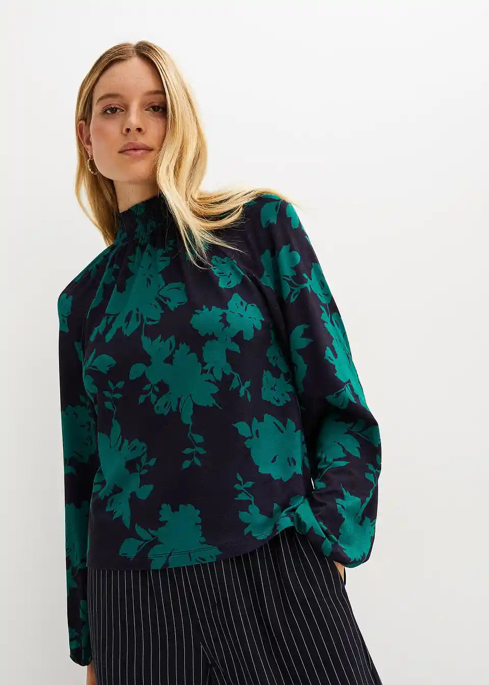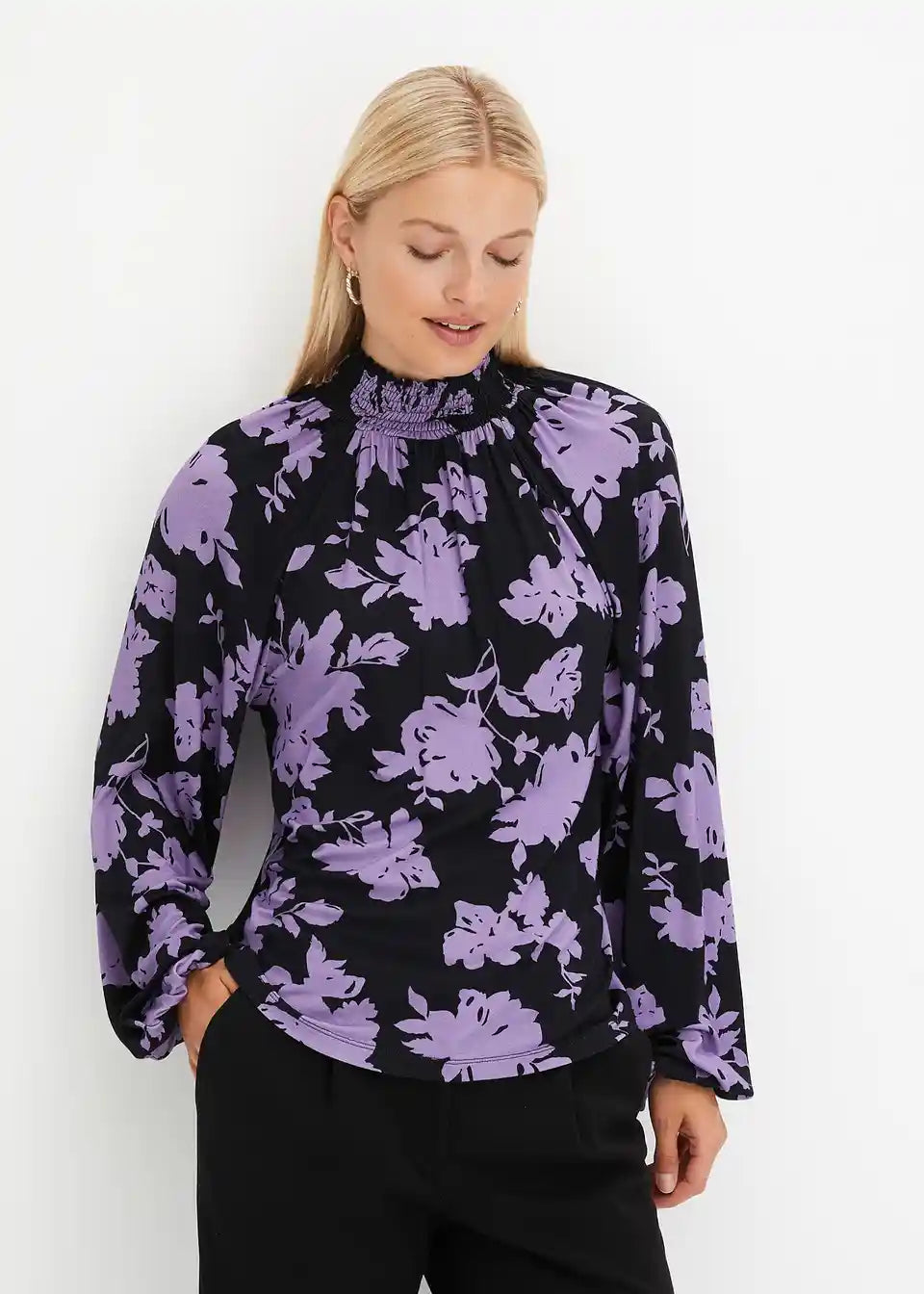 Elegantna majica z dolgimi rokavi, z nabranim ovratnikom in raglanskimi rokavi s čudovitim potiskom