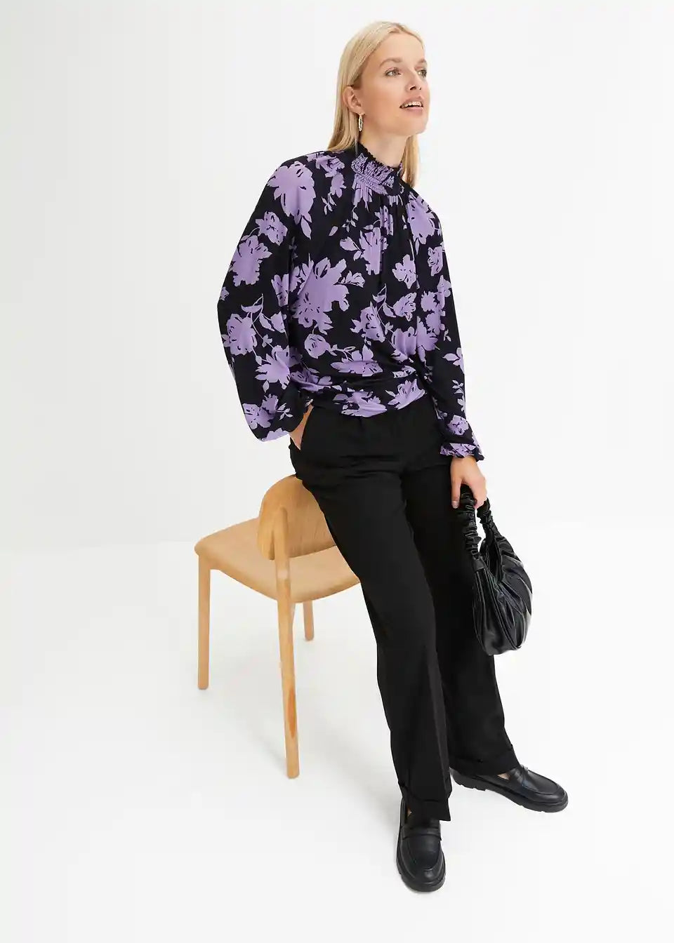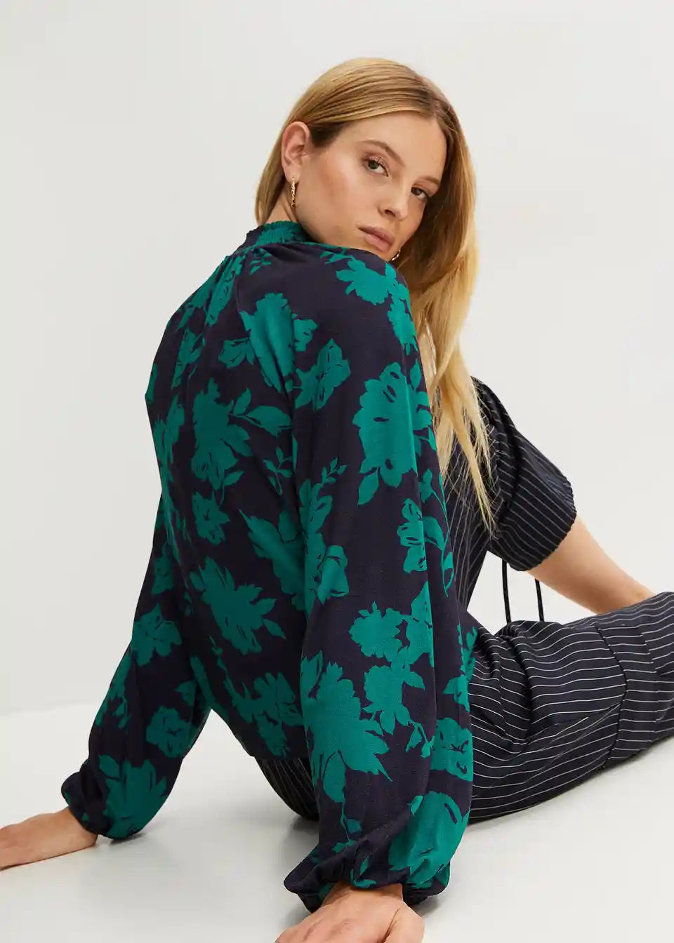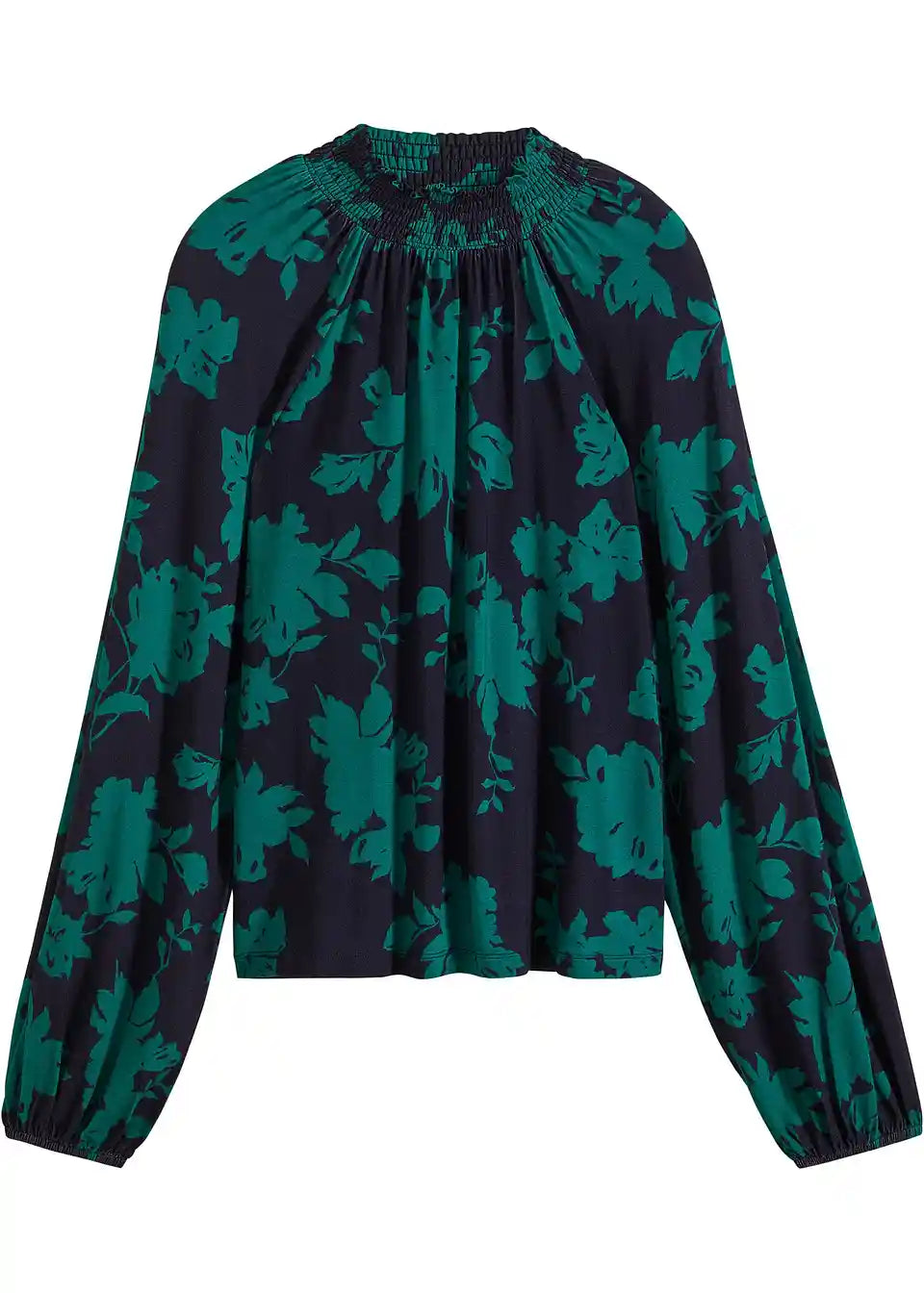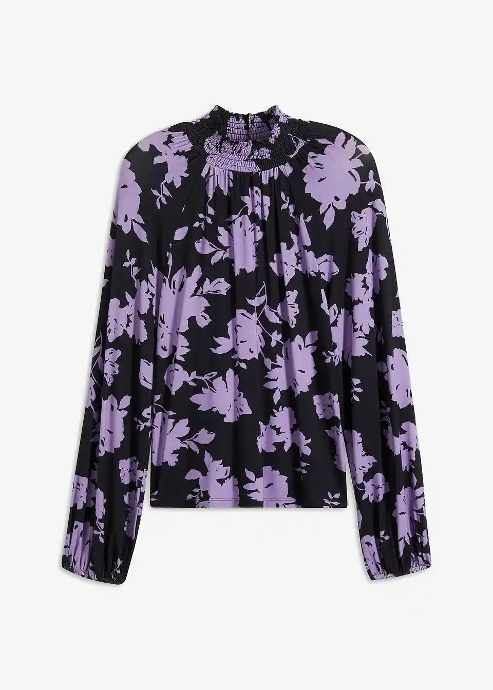 Elegantna majica z dolgimi rokavi, z nabranim ovratnikom in raglanskimi rokavi s čudovitim potiskom