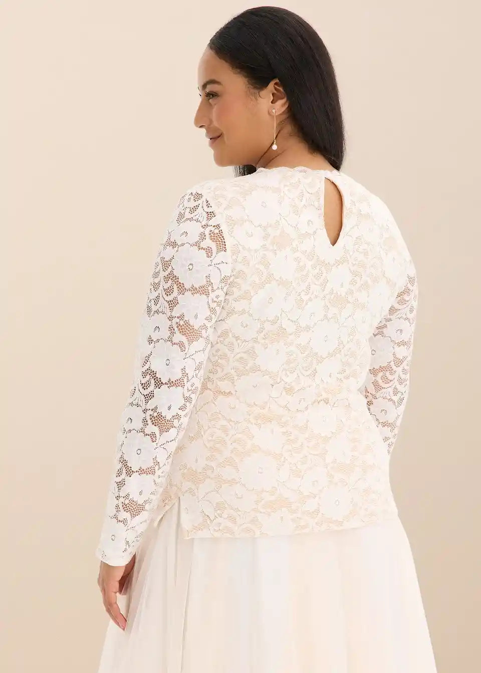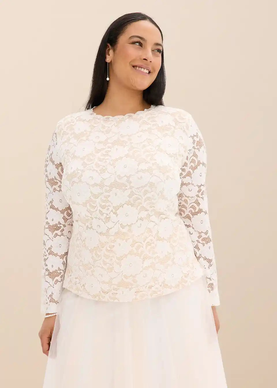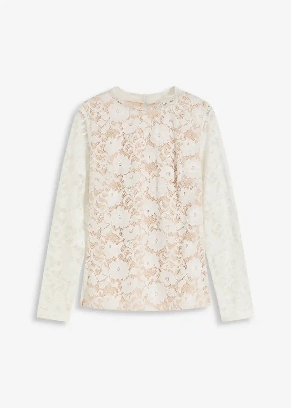 Romantična in ženstvena: majica z dolgimi rokavi iz čipke z romantičnim cvetličnim vzorcem in podlogo v barvi kože