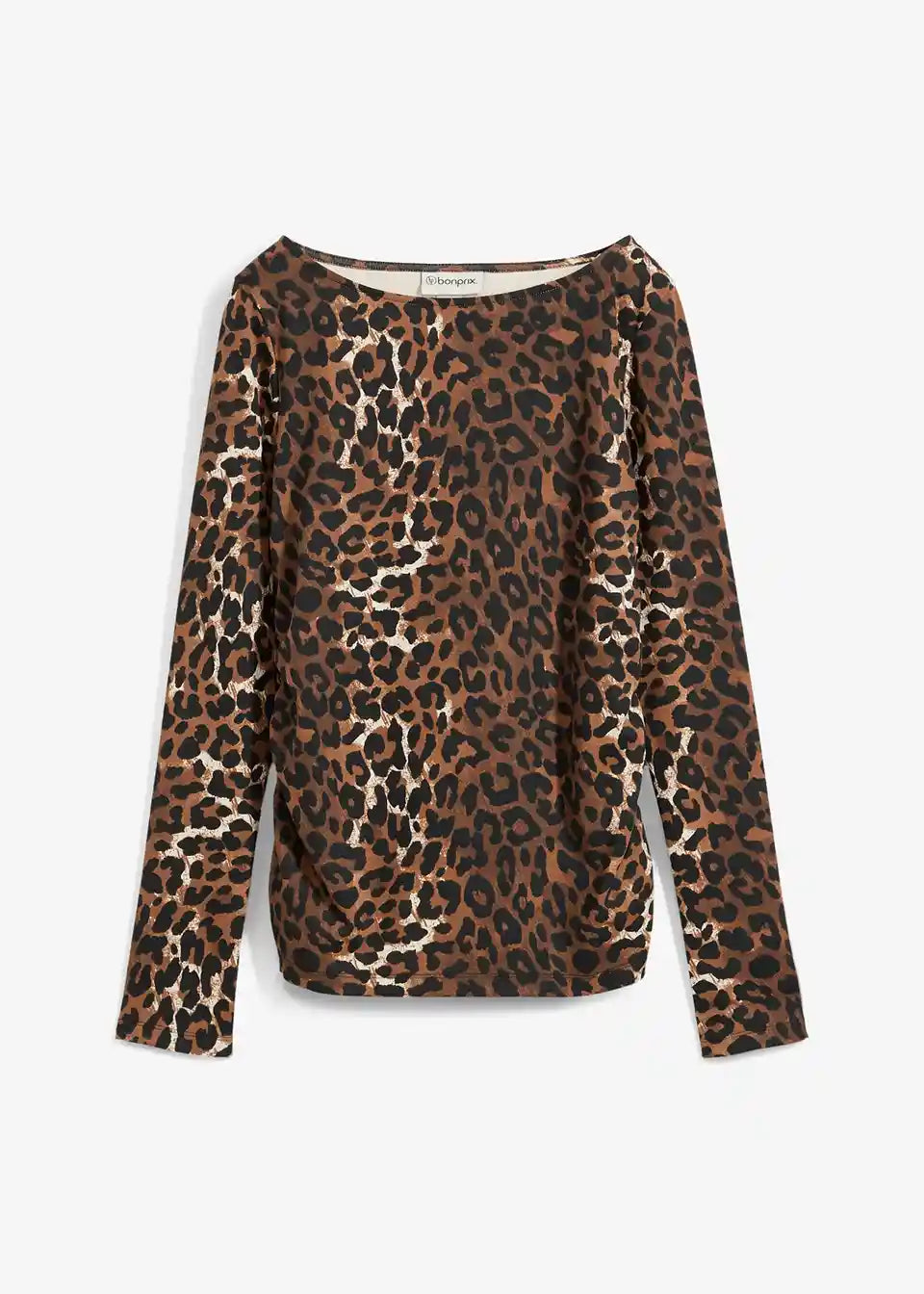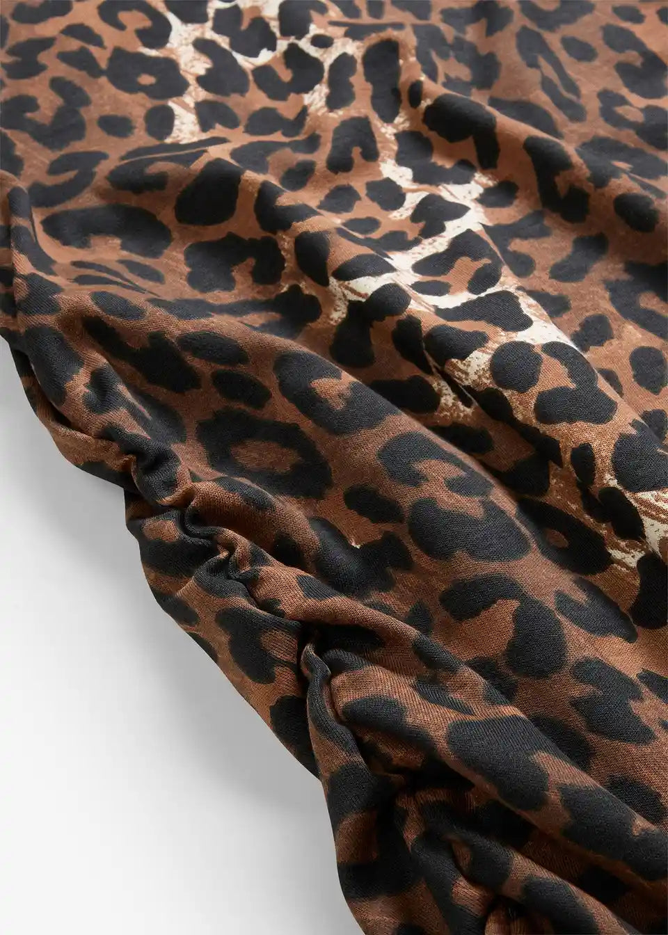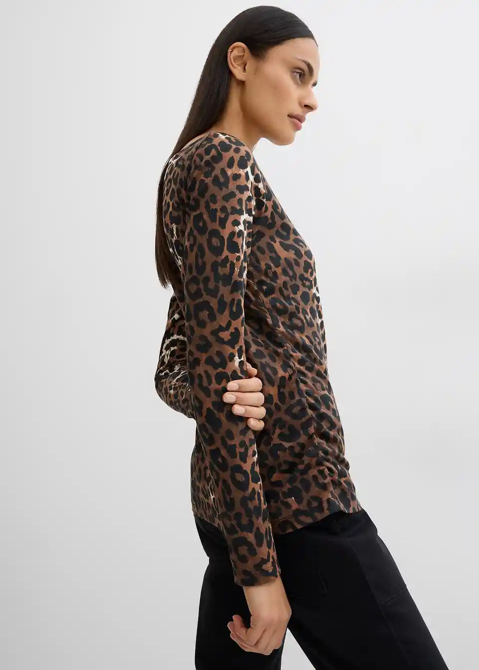Trendovska majica z dolgimi rokavi z naborki in leopardjim vzorcem
