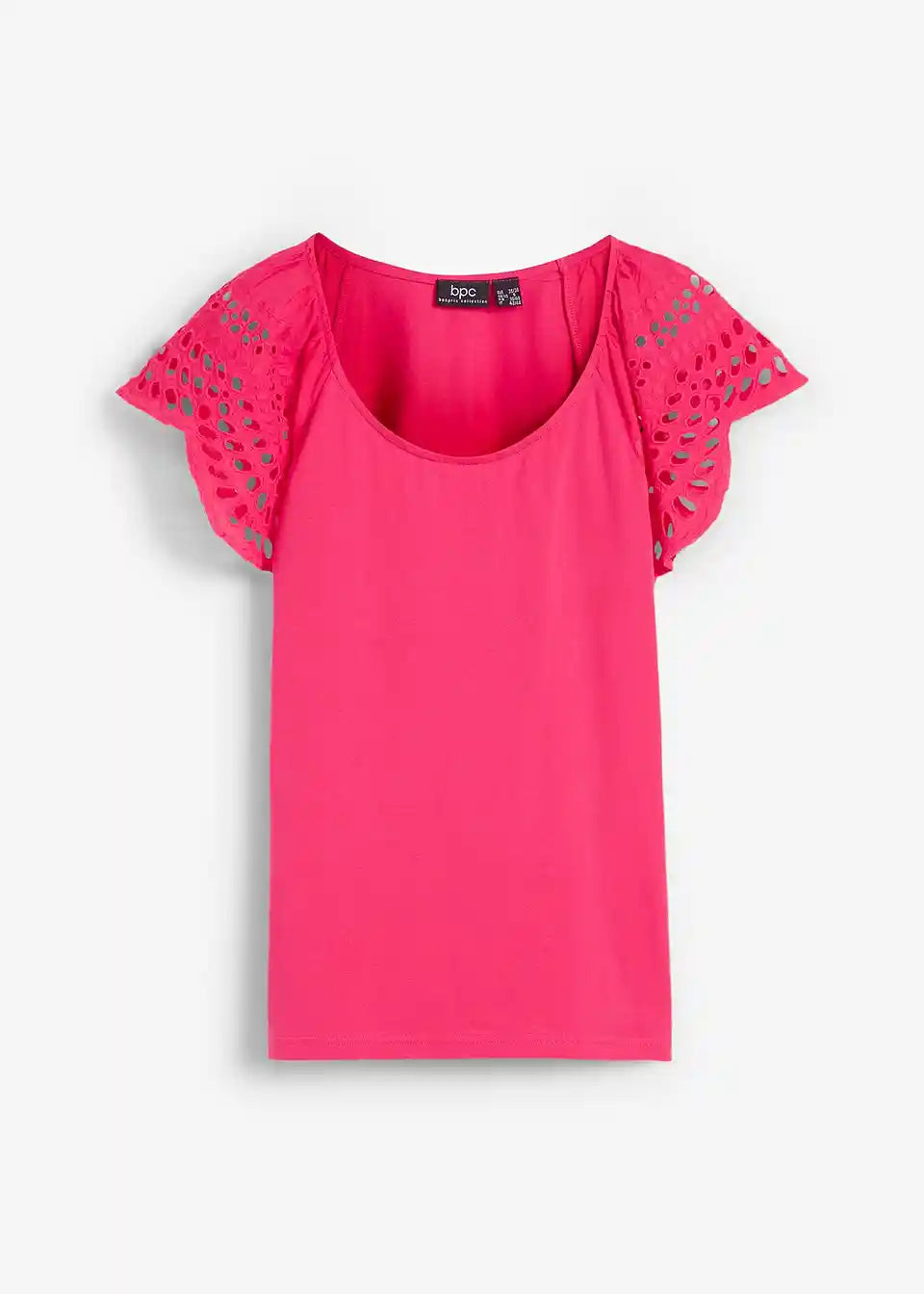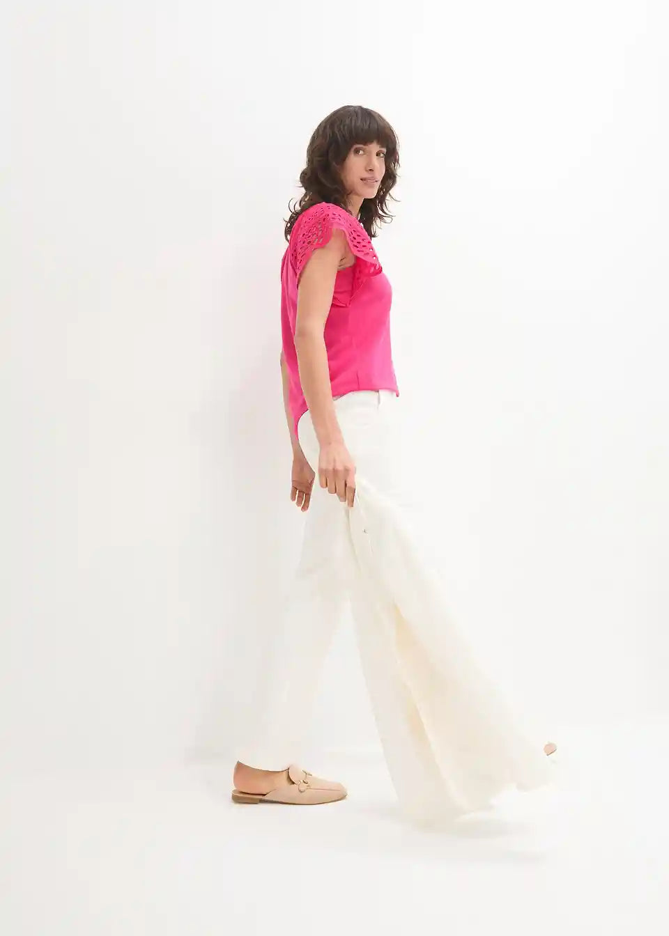 Čudovito luknjičasto vezenje na rokavih doda sicer preprosti majici poseben modni pridih. V kombinaciji s klasičnimi kavbojkami znamke bpc selection in lepimi ženskimi čevlji ustvarja prefinjen videz.