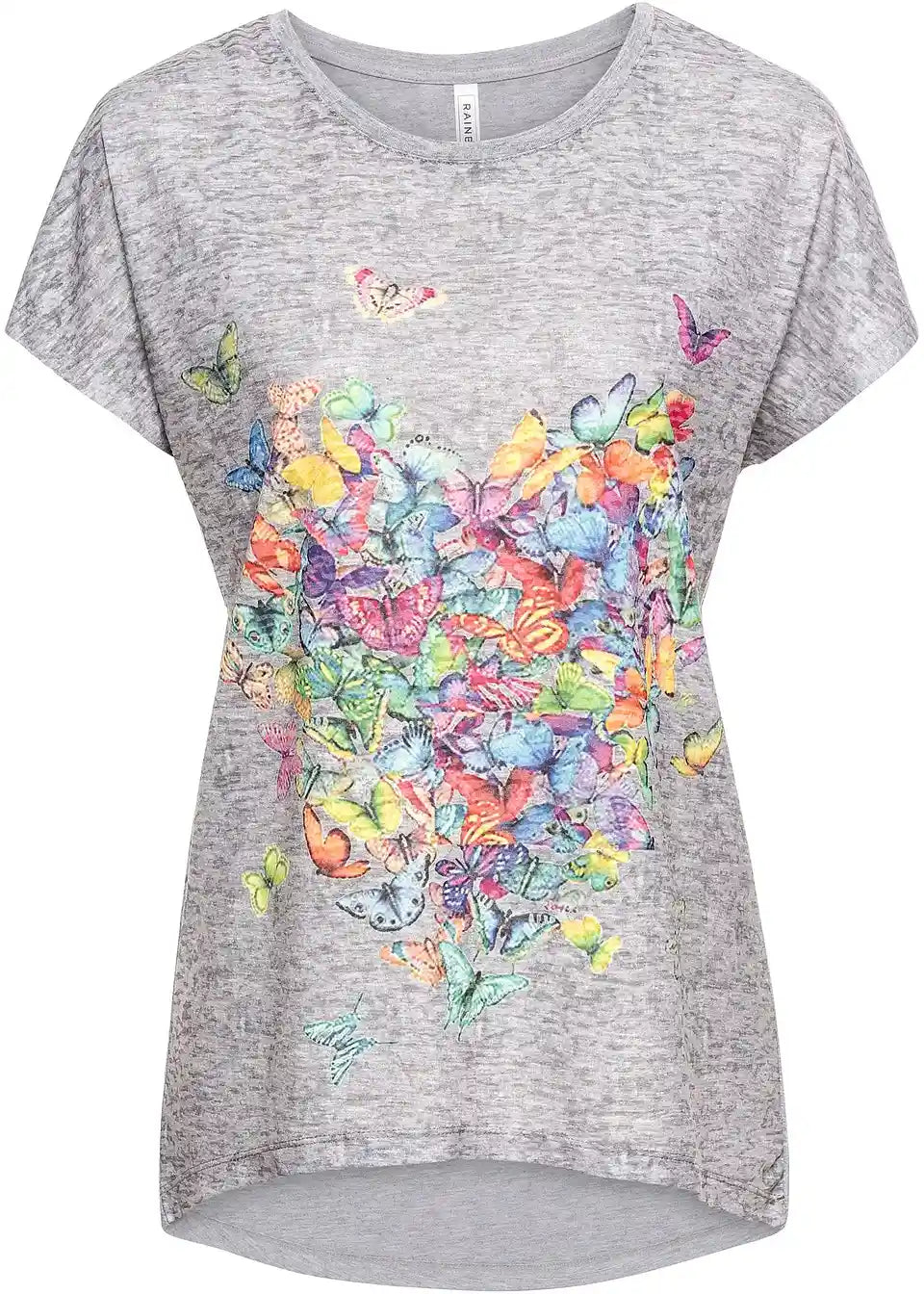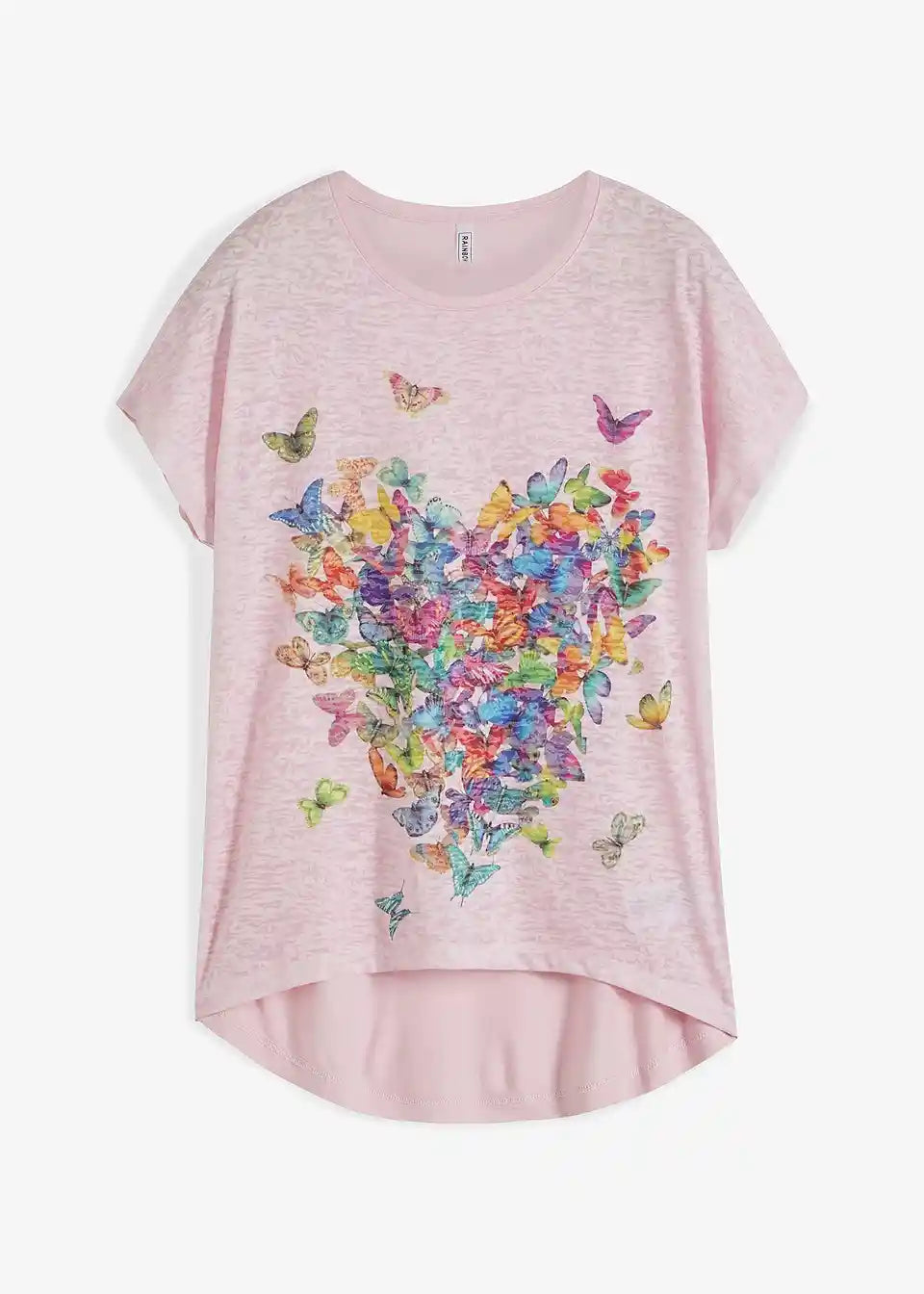Ta moderna majica z motivom metuljev je pravi privlačnež pogledov. Modna majica je rahlo oprijeta in ponuja sproščeno, udobno prileganje. Na zadnji strani je zaobljen rob nekoliko daljši kot spredaj. Velik motiv metulja in videz s prežganimi učinki poskrbita za modne vtise. Posebej dobro se ta stilna majica poda k kavbojkam.