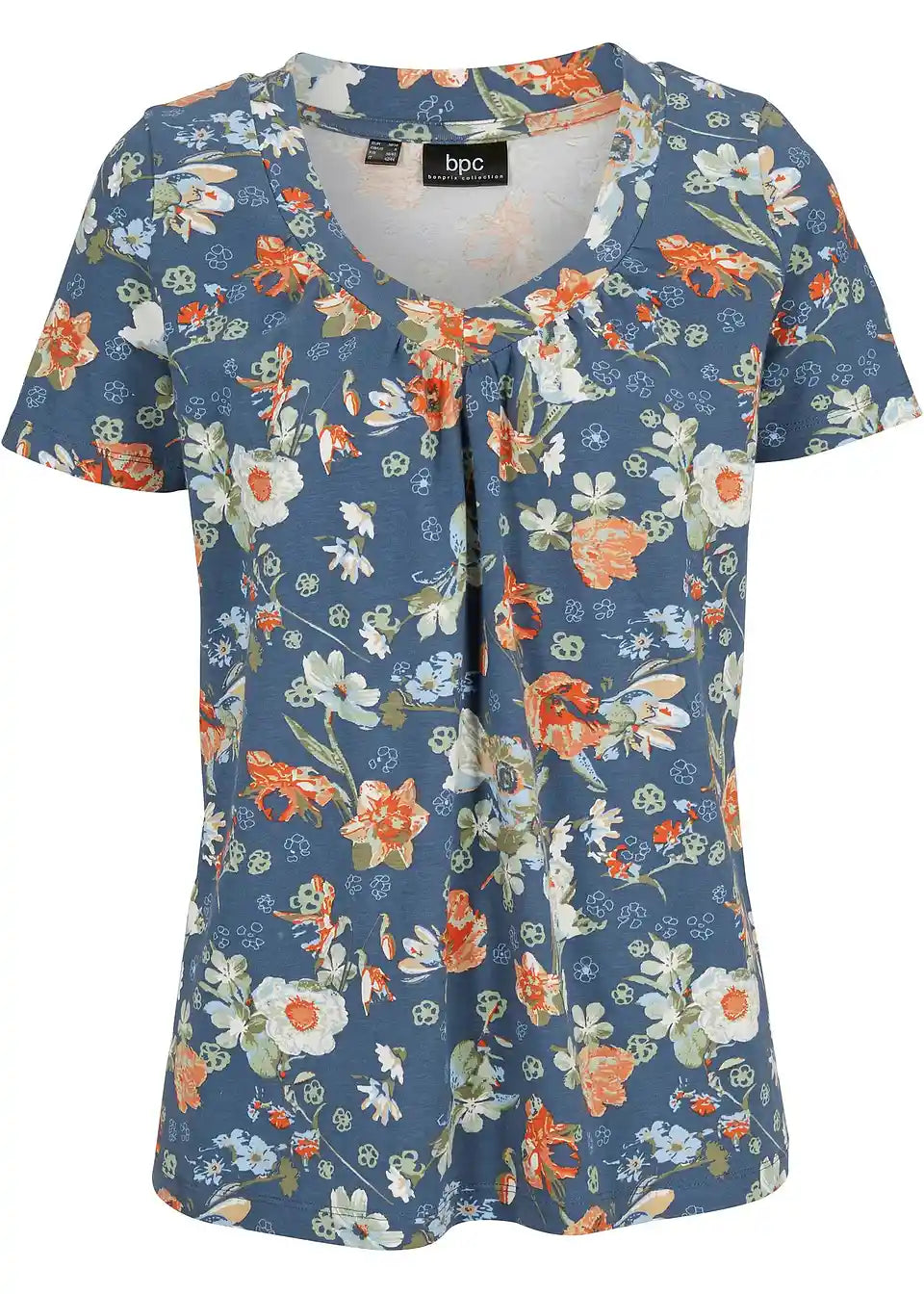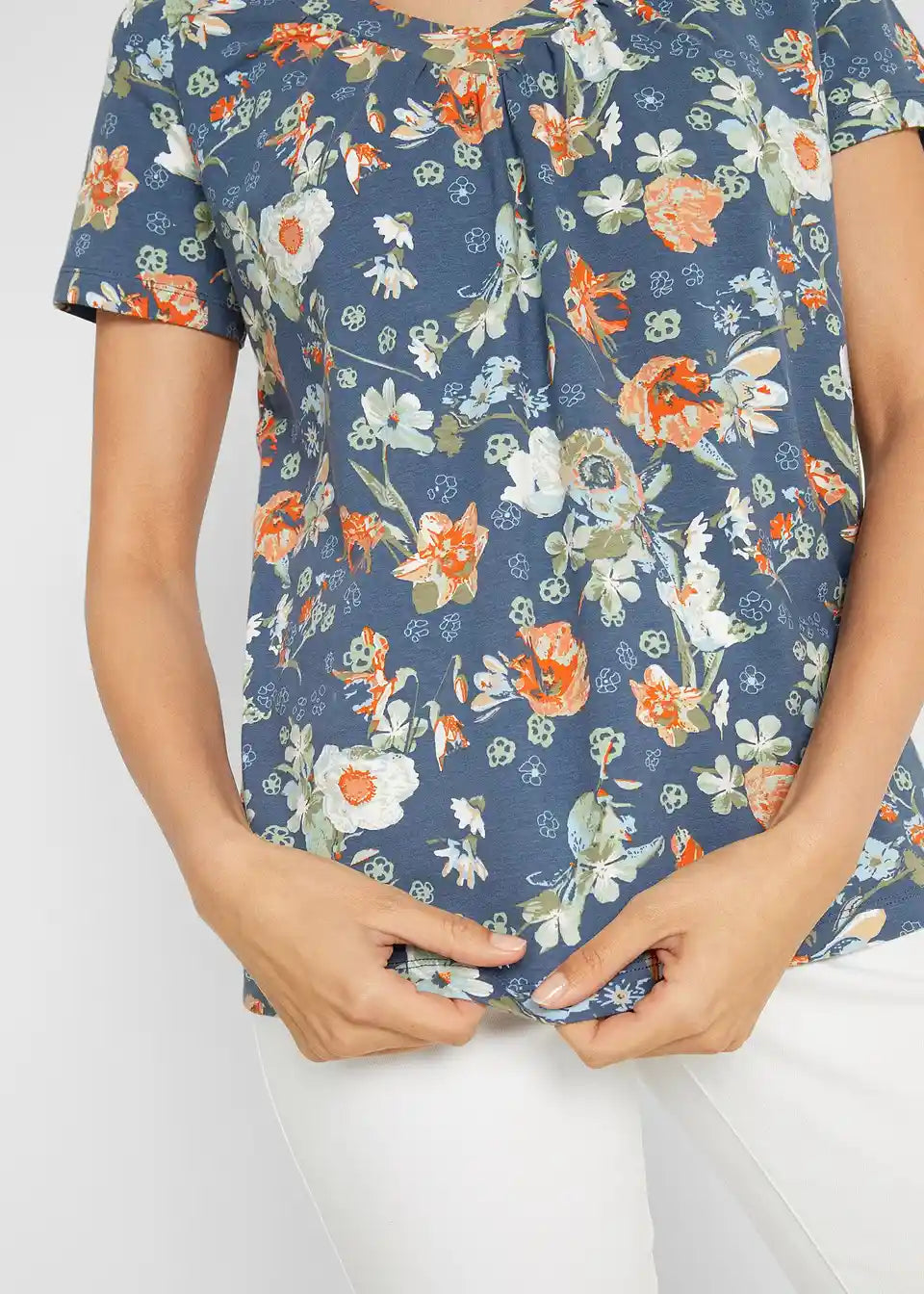 Igriva raztegljiva majica z V-izrezom ter rahlo nabranim izrezom, kratki rokavi