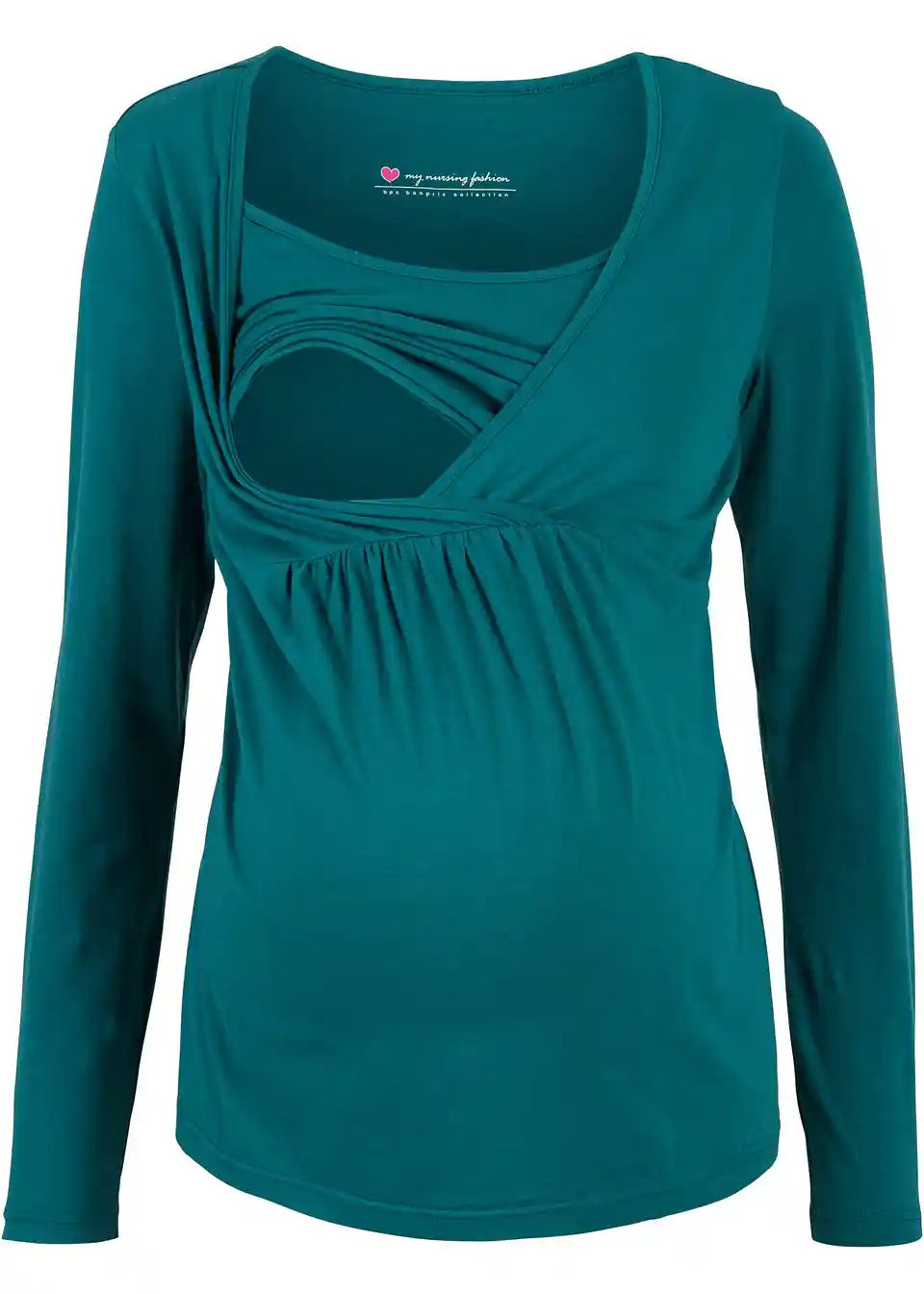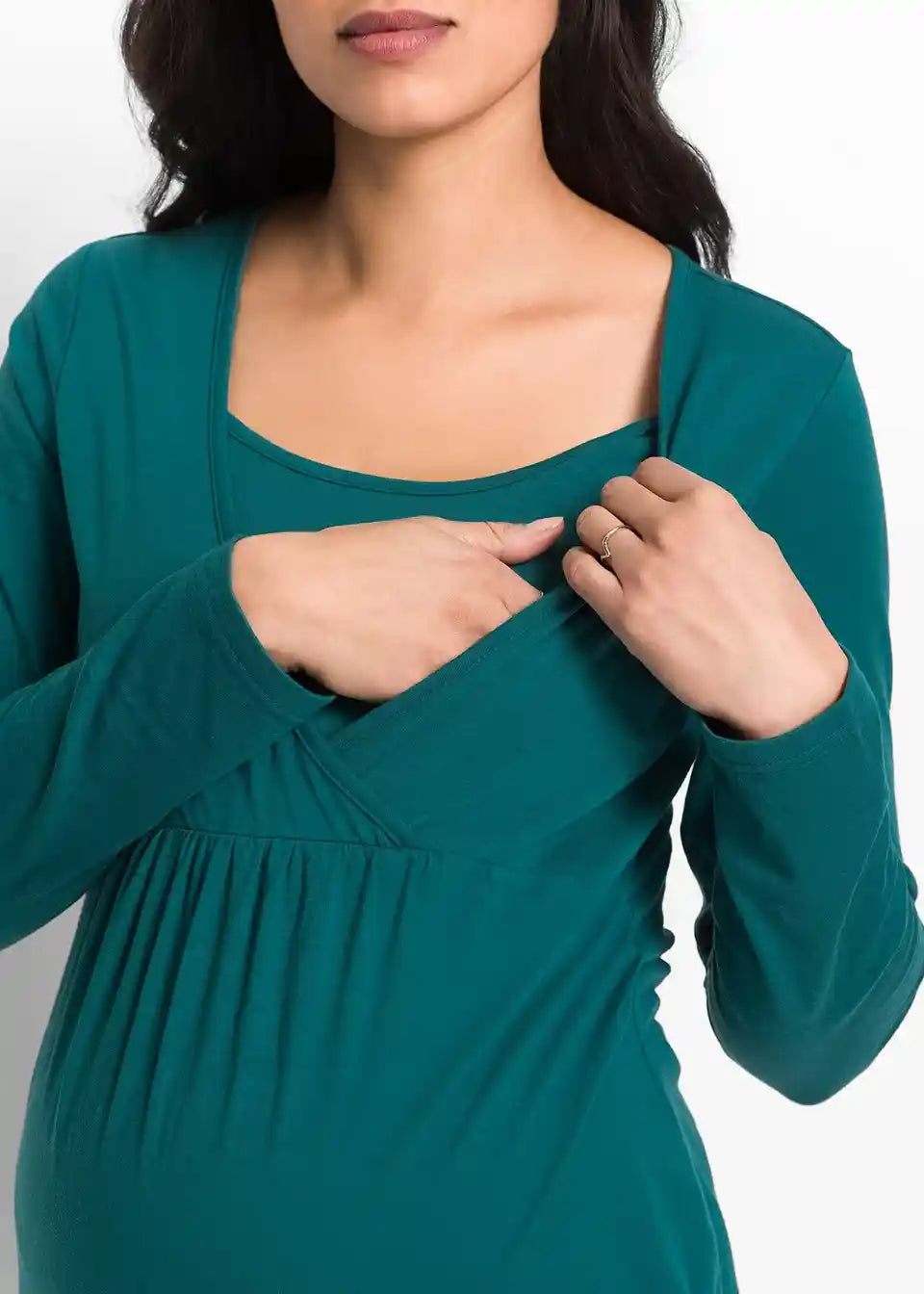 Ta praktičen zgornji del je udoben tako kot preprosta majica za nosečnost kot tudi za kasnejše dojenje. Zaradi barvno usklajenega sloja na sprednjem delu jo je mogoče enostavno dvigniti navzgor. Z naborki ob stranskem šivu se nosečniška majica prilagaja telesu, zato je primerna vseh devet mesecev in tudi po nosečnosti.