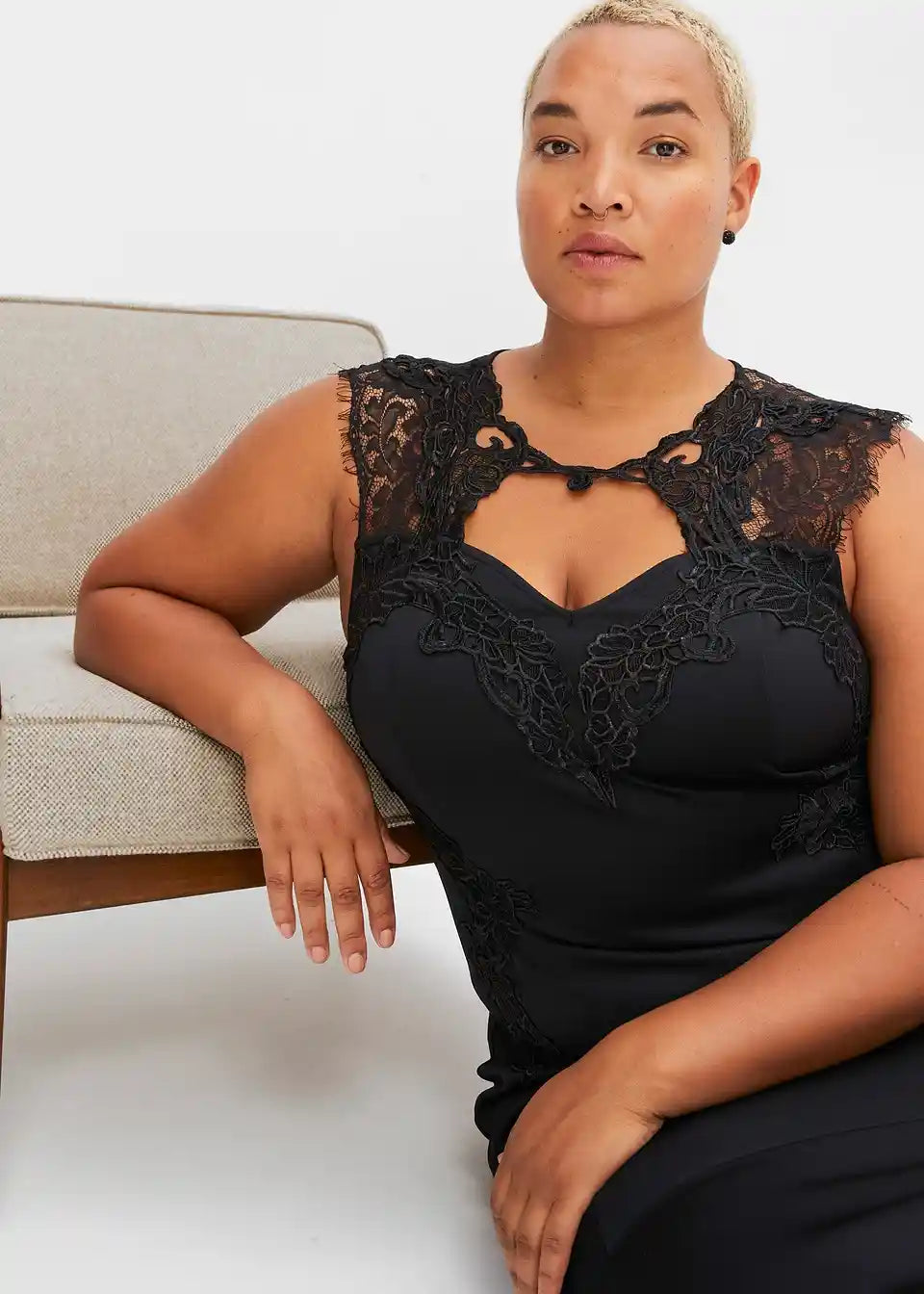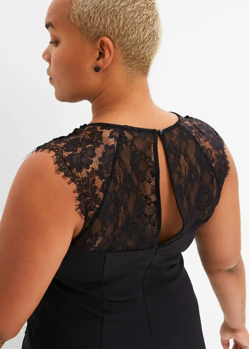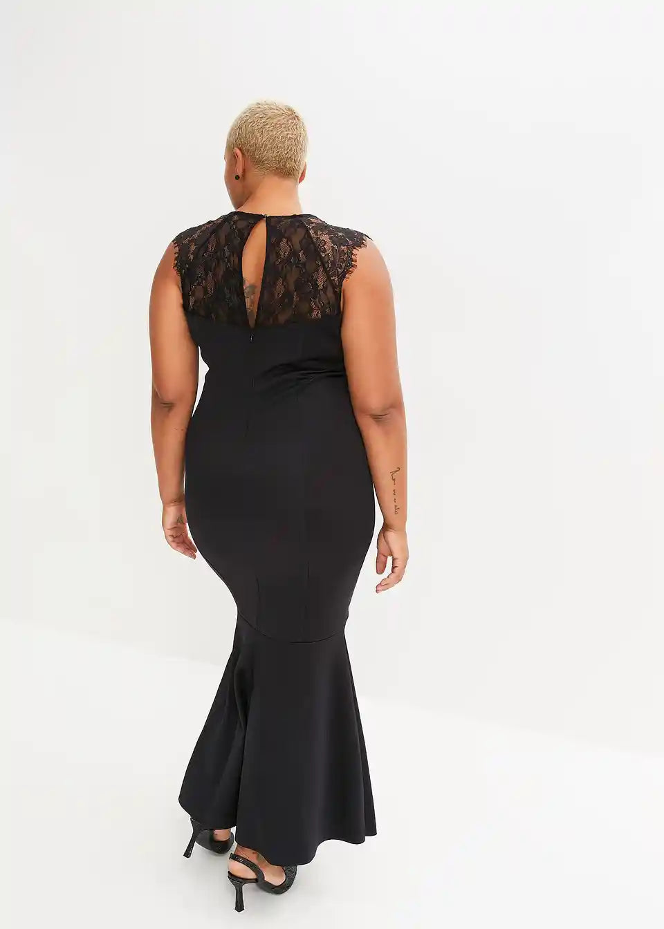 Dolga obleka iz kompaktnega dvojno tkanega materiala, podobnega neoprenu, s čipko