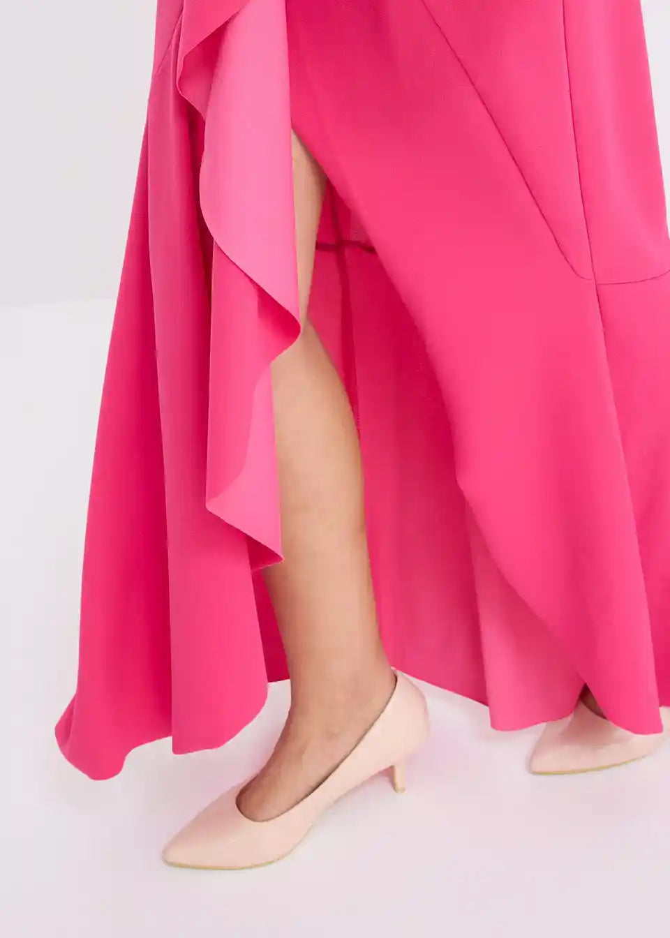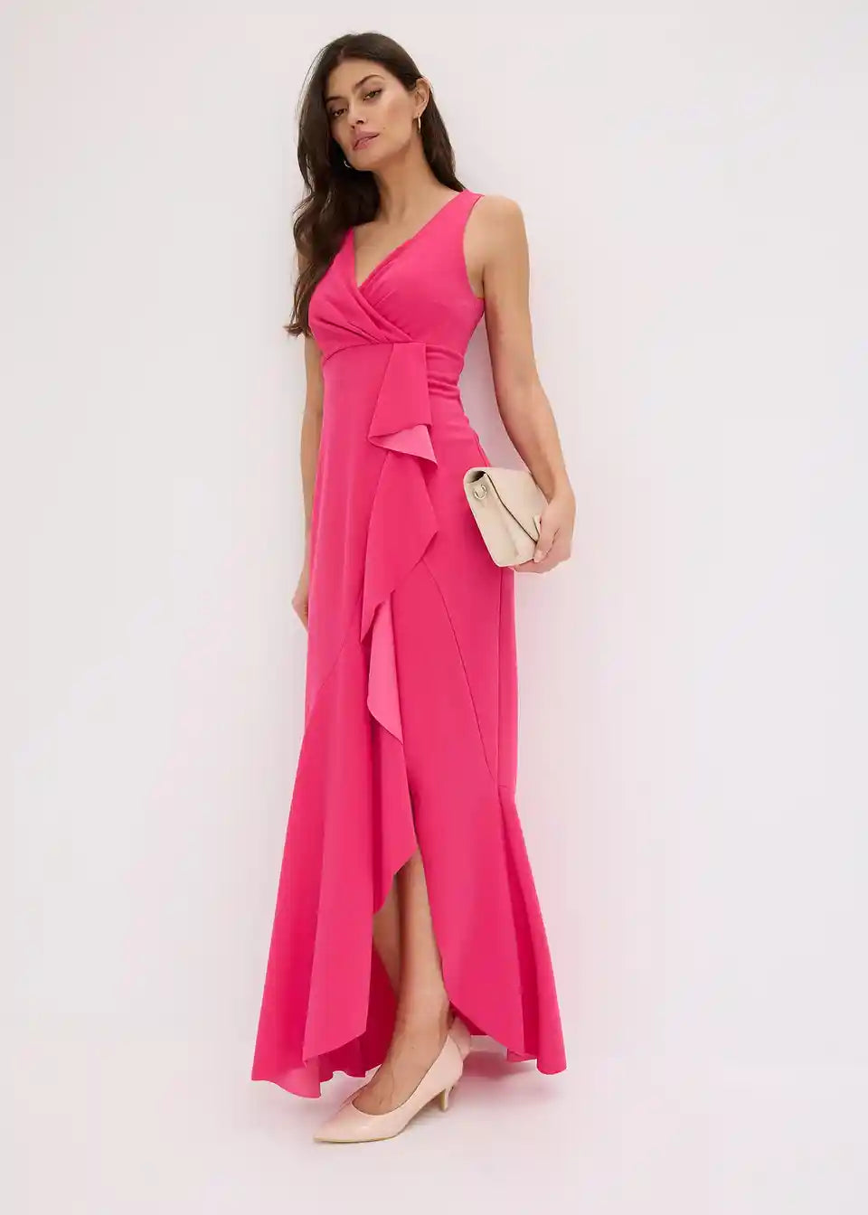 Moderna in ženstvena: večerna obleka iz strukturiranega krep materiala z volančki